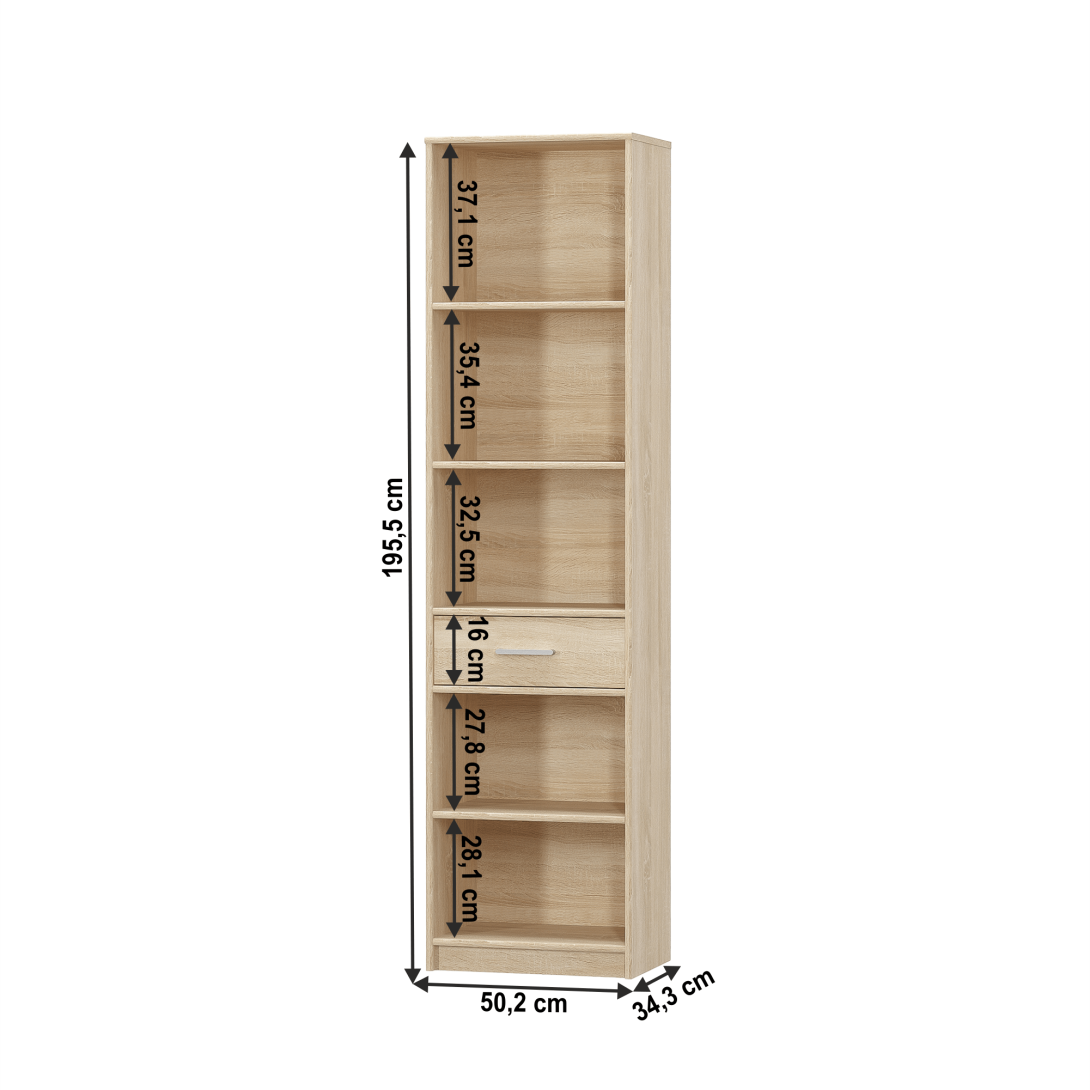 Otvorený regál 1S TEYOMateriál: DTD laminovanáFarba: dub sonomaRozmery (ŠxHxV): 50,2x34,3x195,5 cmHrúbka materiálu: 16 mm Dodávané v demonte.