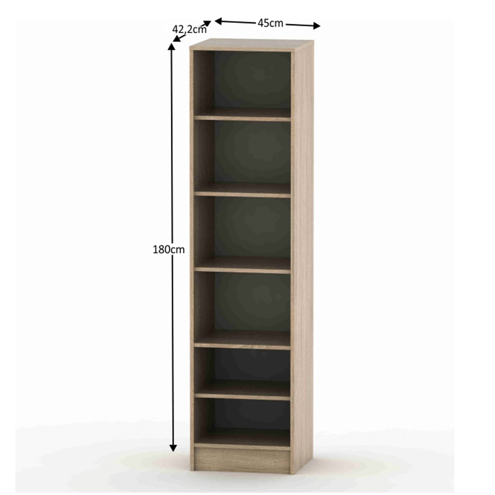 Policový regál BETTY 4Materiál: DTD laminovanáFarba: dub sonomaRozmery (ŠxHxV): 45x42,2x180 cmHrúbka materiálu korpus: 16 mmDodávané v demonte.