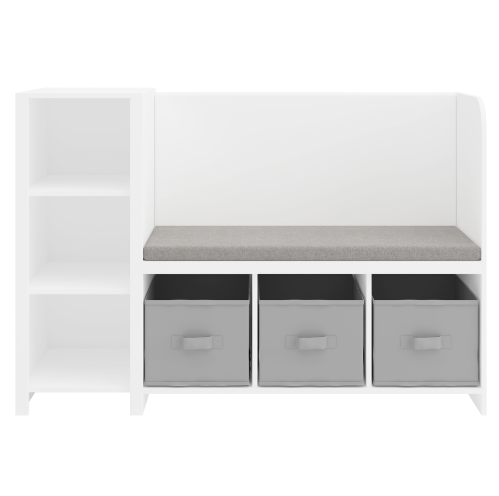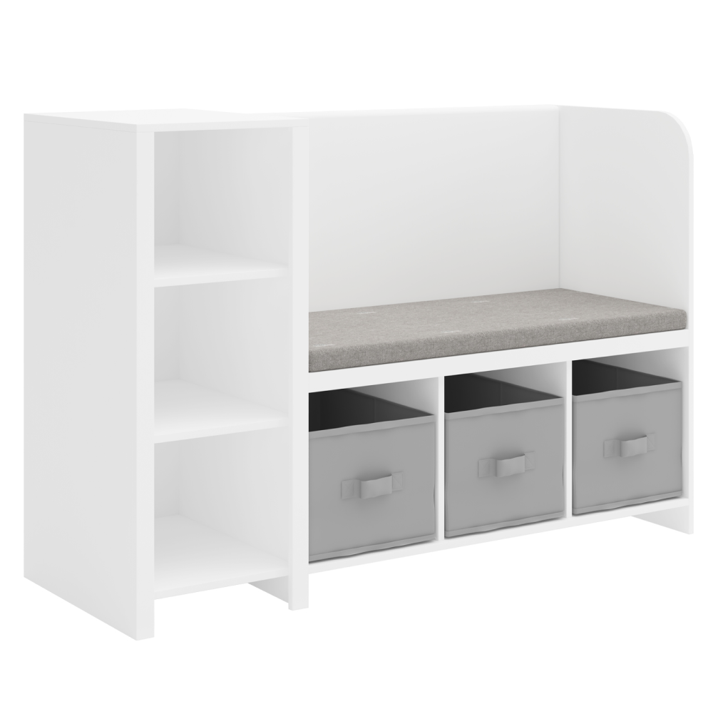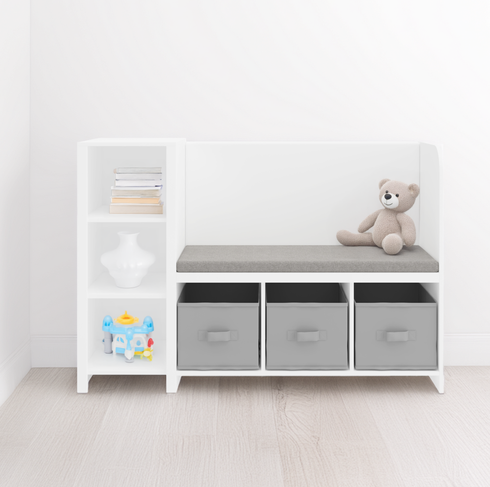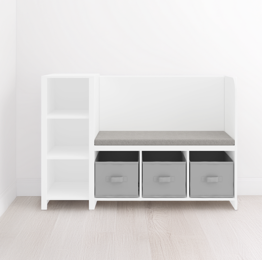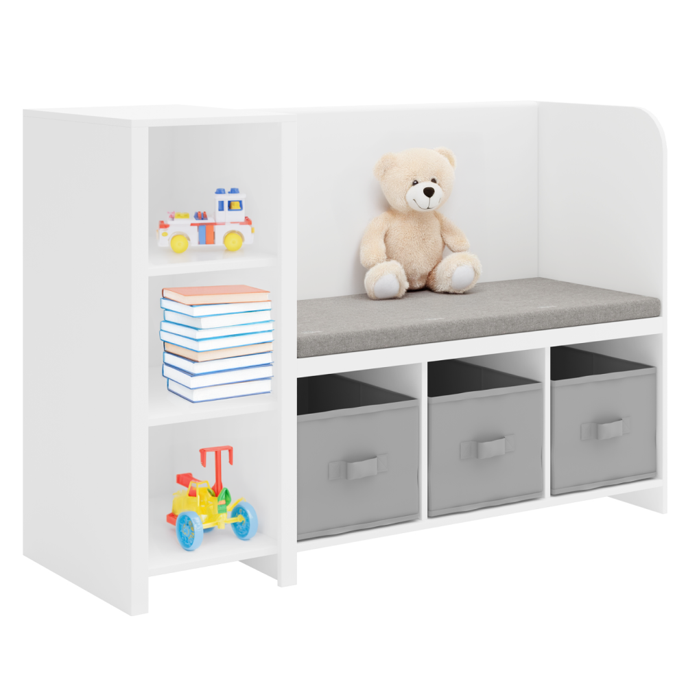 Materiál: DTD/látkaFarba: biela/siváRozmery (ŠxHxV): 112x40x76 cmHrúbka materiálu: 1,5 cmRegálOtvorený úložný priestorPolicovýTri látkové košíkyRozmery košíka (ŠxHxV): 24,8x38x20 cmLavičkaS miestom na sedenieHĺbka sedu: 38,5 cmŠírka sedu: 78 cmVýška opierky chrbta: 37,9 cmDodávané s vankúšomRozmery vankúša (ŠxHxV): 78x34x4 cmPoťah je snímateľnýSo zipsomPoťahy je možné prať pri teplote do 40 °CVýška spodného priestoru od podlahy: 5 cmNosnosť police: 5 kgNosnosť sedacej časti: 40 kgPraktickýVhodný na uskladnenie kníh, hračiek alebo iných drobnostíVhodné do detských iziebVhodné pre deti od 3 do 8 rokovSpĺňa bezpečnostné normy EN 17191:2021Odporúčame pripevniť k steneDodávané v demonte