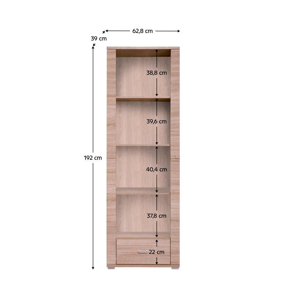 Regál GRAND typ 6Materiál: DTD laminovaná. Farebné prevedenie: dub sonoma. Rozmery (ŠxHxV): 62,8x39x192 cmHrúbka materiálu korpus: 16 mmHrúbka materiálu vrchnej dosky: 22 mmHrúbka materiálu spodnej dosky: 22 mm1-šuplík3-policeDodávaný v demonte.