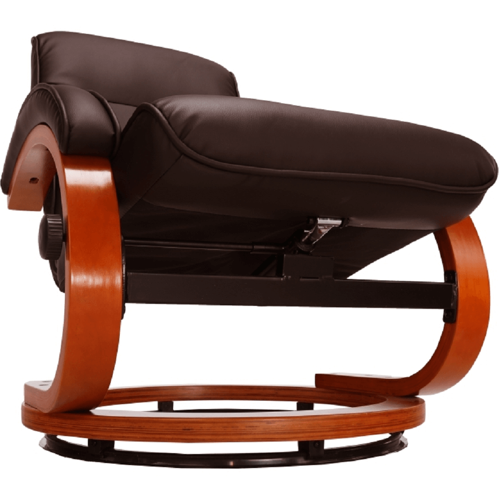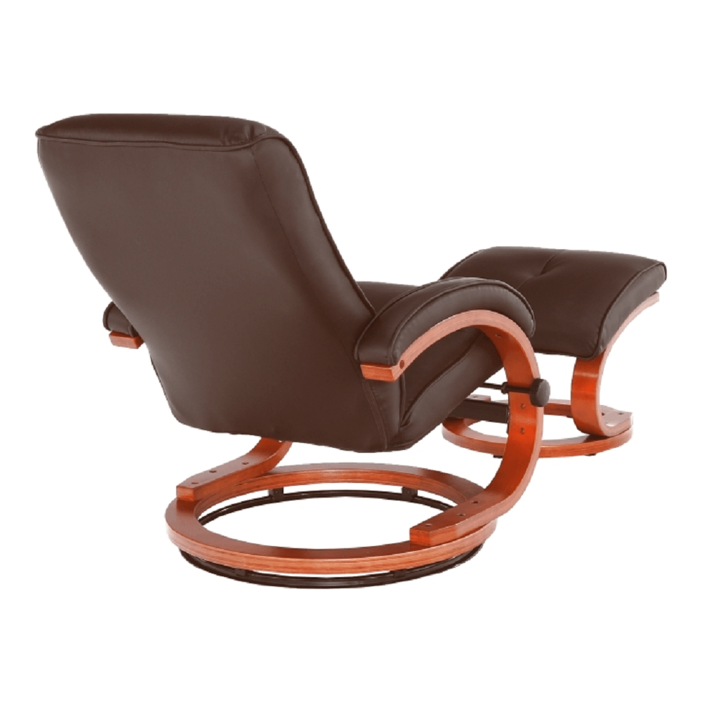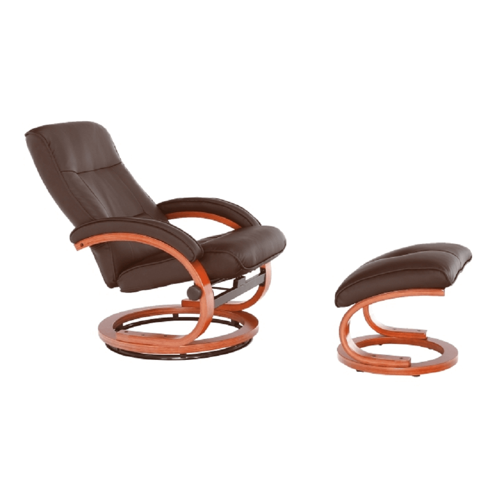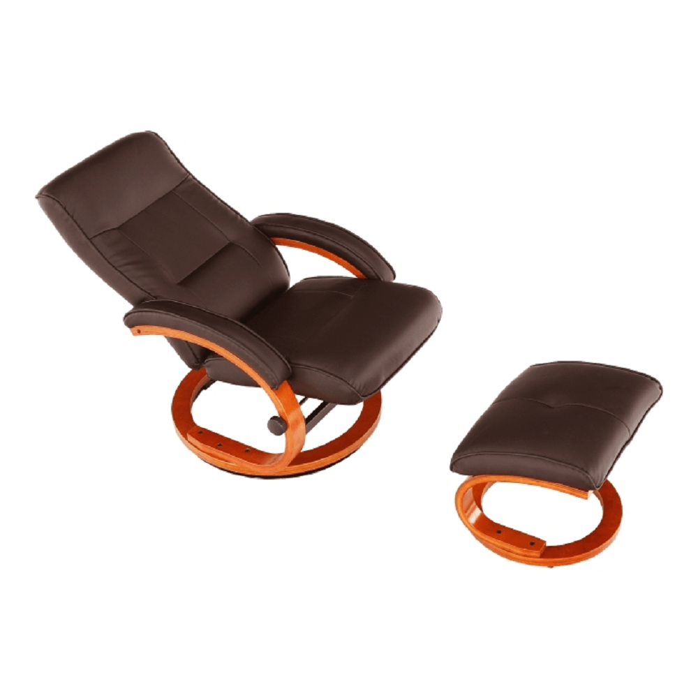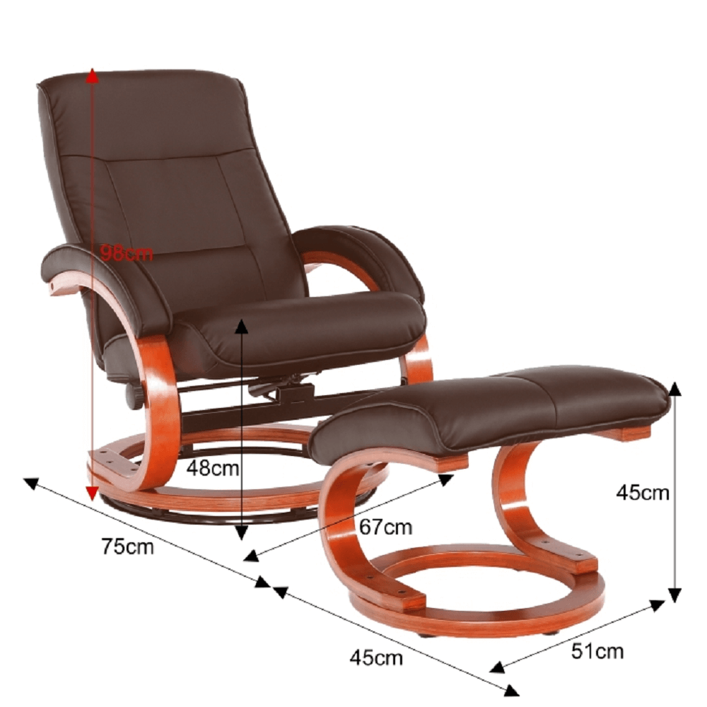 Polohovacie relaxačné kreslo RYAN Materiál: textilná koža PU /drevoOderuodolnosť textílie podľa testu Martindale: 100 000 oderovFarba: tmavohnedá/jelšaRozmery (ŠxHxV): 67x75x98 cmVýška kresla po sklopení operadla: 88cmHĺbka sedadla po sklopení operadla: 108 cmVýška sedu: 48cmRozmery podnož (ŠxHxV): 51x45x45cmNosnost: 150 kg. Sklopenie opierky o 145 stupňovDodávané v demonte.