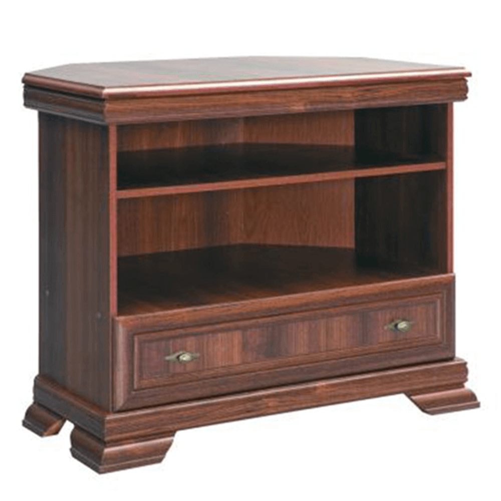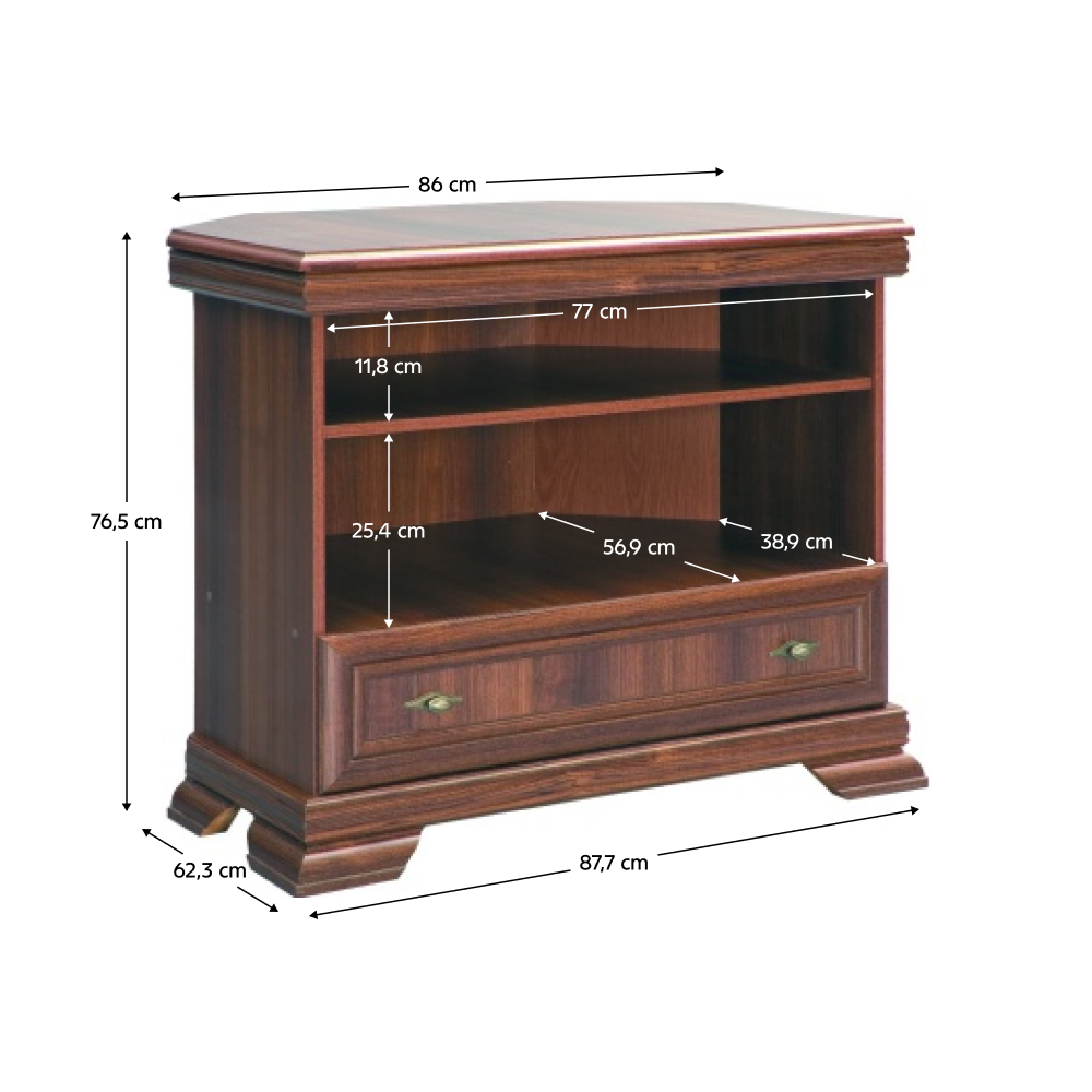 Rohový RTV stolík KORA KRTNMateriál: laminovaná DTD, MDF, kovFarebné prevedenie: samoa king.Rozmery (ŠxHxV): 87,7x62,3x76,5Hrúbka materiálu korpus: 15 mmHrúbka materiálu vrchnej dosky: 22 mm Hrúbka materiálu dolnej dosky: 22 mmVýška spodného priestoru od podlahy: 10,5 cmDodávané v demonte.