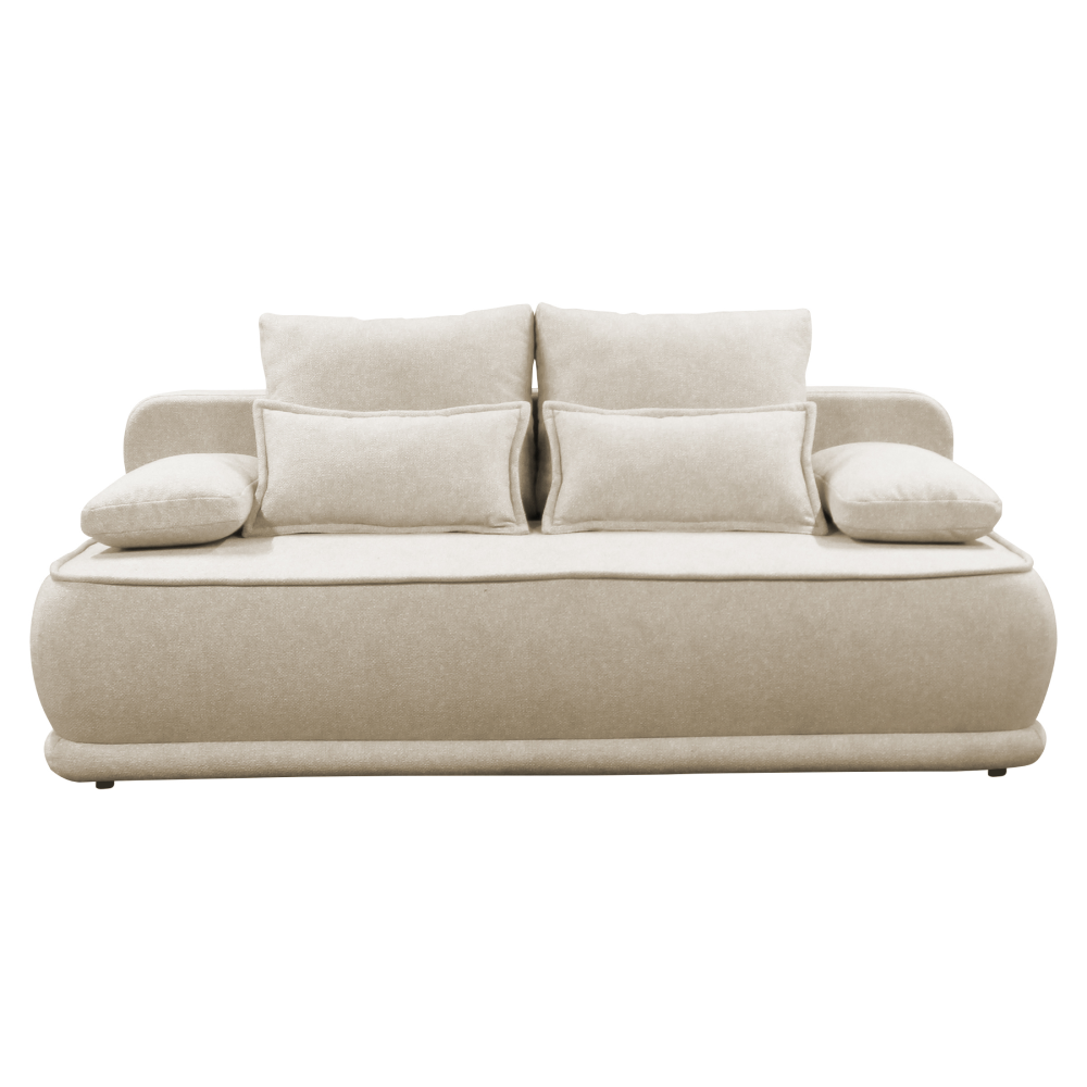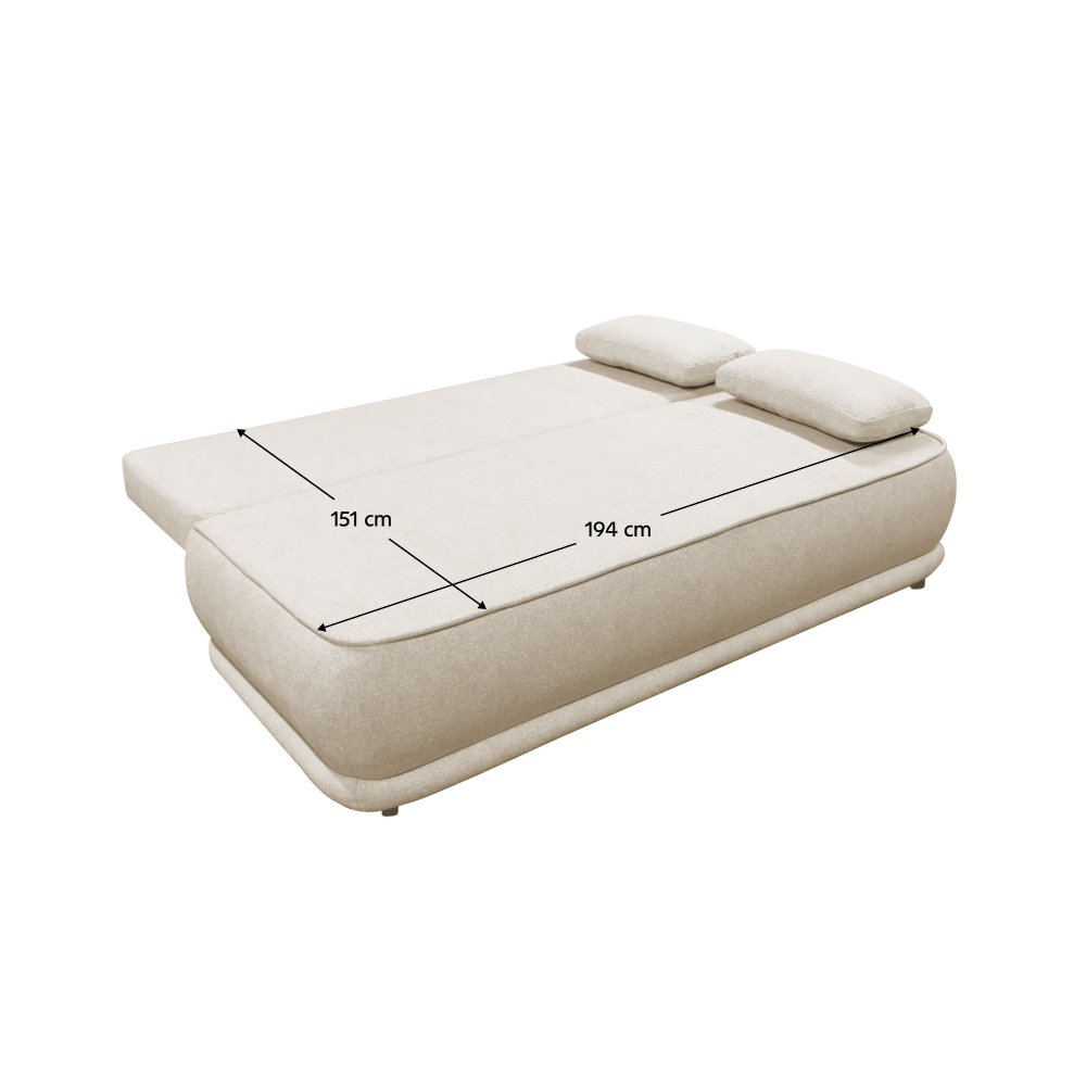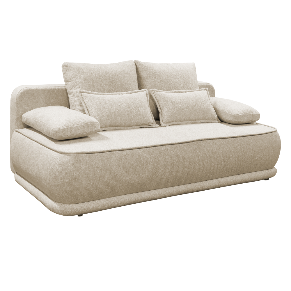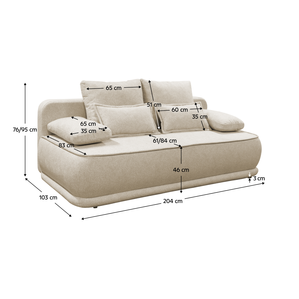 Materiál: látka Blur 1Oderuodolnosť textílie podľa testu Martindale: 50 000 oderovFarba: béžový melírRozmery (ŠxHxV): 204x100x76/95 cmPlocha na spanie (ŠxD): 151x194 cmVýška sedu: 46 cmHĺbka sedu: 45/62/83 cmNosnosť na osobu: 90 kgNa nožičkáchMateriál nožičiek: plastFarba nožičiek: čiernaVýška spodného priestoru od podlahy: 3 cmVýplň: pružina falista/pur penaCeločalúnenáRozkladaciaÚložný priestorDodávaná s vankúšmiRozmery veľkých vankúšov (ŠxV): 62x51 cmRozmery menších vankúšov (ŠxV): 60x35 cmRozmery dekoratívnych vankúšov (ŠxV): 65x35 cmPraktickáModernáDodávané v demonte