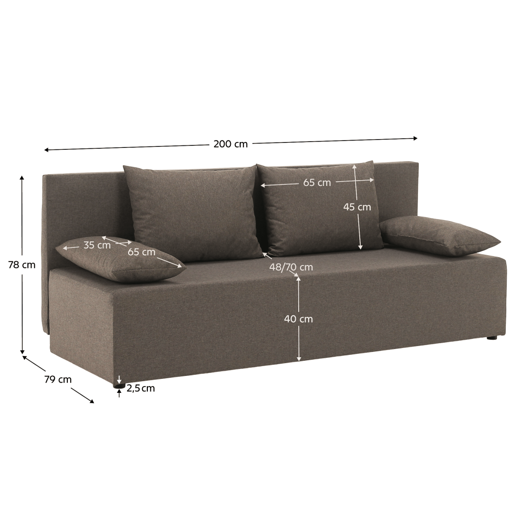 Materiál: látka Malmo 26Oderuodolnosť textílie podľa testu Martindale: 30 000 oderovFarba: hedáRozmery (ŠxHxV): 200x79x78 cmPlocha na spanie (ŠxD): 140x200 cmVýška sedu: 40 cmHĺbka sedu: 48/70 cmNa nožičkáchMateriál nožičiek: plastFarba nožičiek: čiernaVýška spodného priestoru od podlahy: 2,5 cmVýplň: pur pena T28ČalúnenáRozkladaciaÚložný priestorDodávaná s vankúšamiRozmery veľkého vankúša (ŠxV): 65x45 cmRozmery malého vankúša (ŠxH): 35x65 cmNosnosť na osobu: 90 kgPraktickáModernáDodávané v demonte