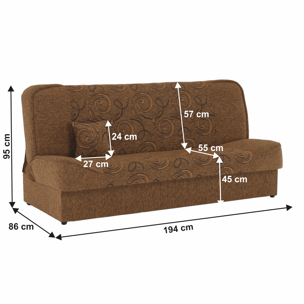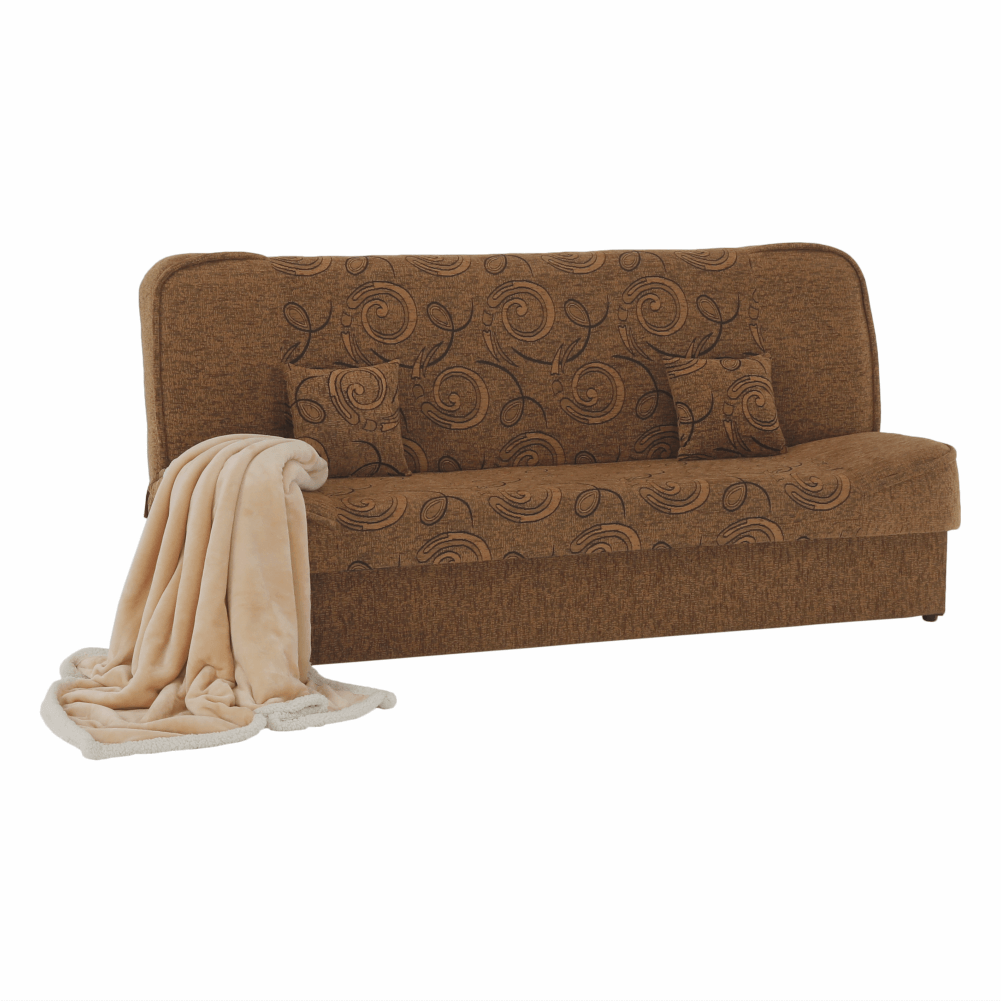 Rozkladacia pohovka ASIA NEWMateriál: látka šenilOderuodolnosť textílie podľa testu Martindale: 65 000 oderovFarba: zlatá/vzorRozmery ŠxHxV: 194x86x95 cm, plocha na spanie : ŠxD: 120x194 cmNosnosť na osobu: 90 kgDva dekoratívne vankúšeÚložný priestor.Dodávané v demonte.