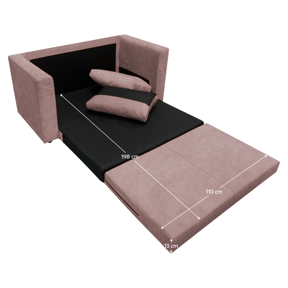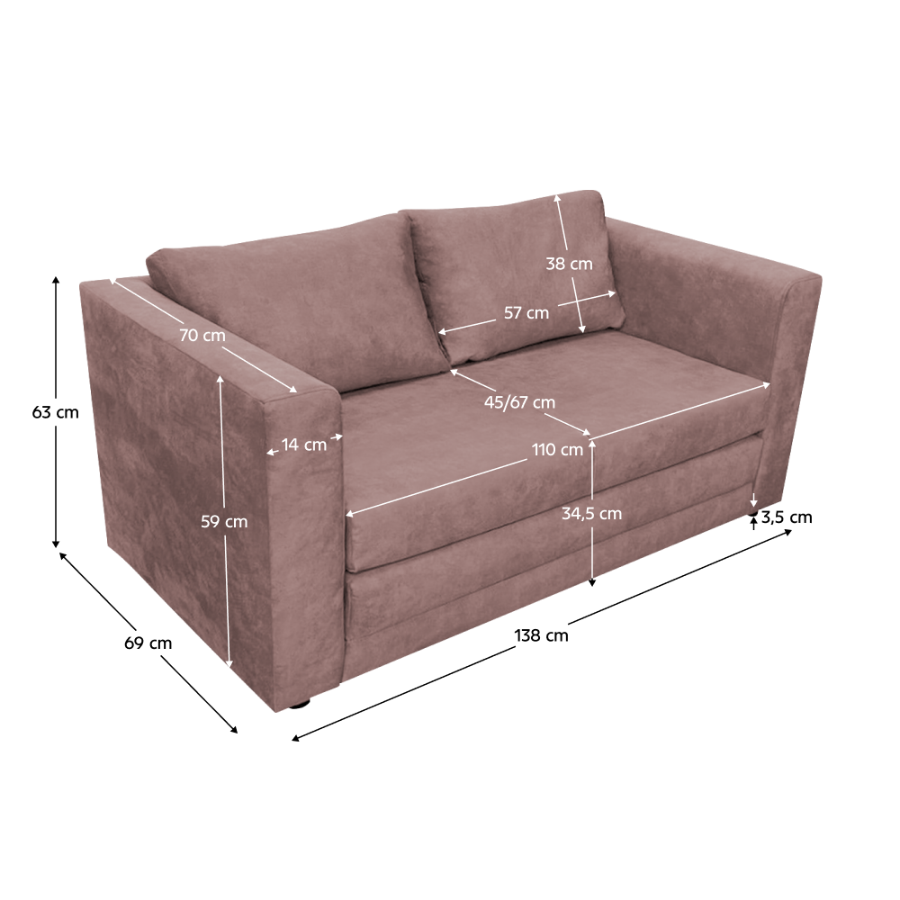 Materiál: látka ENJOY 19/sosnaOderuodolnosť textílie podľa testu Martindale: 45 000 oderovFarba: ružováRozmery (ŠxHxV): 138x69x63 cmPlocha na spanie (ŠxD): 110x198 cmVýška sedu: 34,5 cmHĺbka sedu s vankúšom : 45 cmHĺbka sedu bez vankúša : 67 cmŠírka sedu: 100 cmVýška spania: 13 cmHrúbka materiálu konštrukcie: 2,2 cmRozmery opierky na ruku (ŠxHxV): 14x70x59 cmNa nožičkáchMateriál nožičiek: plastFarba nožičiek: čiernaVýška spodného priestoru od podlahy: 3,5 cmVýplň: pena PUTvrdosť: T25RozkladaciaS vankúšmiRozmery vankúšov (ŠxV): 57x38 cmNosnosť: 100 kgHmotnosť: 35 kgPraktickáModernáDodávaná v demonte
