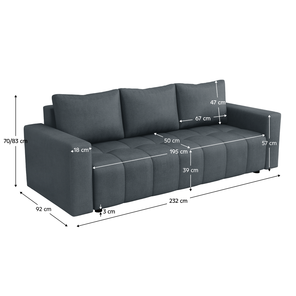 Matariál: látka Paros 06Oderuodolnosť textílie podľa testu Martindale: 55 000 oderovFarba: siváRozmery (ŠxHxV): 232x92x70/83 cmPlocha na spanie (ŠxH): 138x195 cmHĺbka sedu: 50 cmVýška sedu: 39 cmŠírka sedu: 195 cmVýška opierky na ruku: 57 cmŠírka opierky na ruku: 18 cmNosnosť na osobu: 90 kgPlastové nožičkyFarba nožičiek: čiernaVýška nožičiek: 3 cmCeločalúnenáRozkladaciaS úložným priestoromDodávaná s vankúšmiRozmery vankúša (ŠxV): 67x47 cmVýplň: pružina typu bonelPraktickáModernáDodávané v demonteMožnosť objednania v 4 farebných prevedeniach látky Paros a v 6 farebných prevedeniach látky Kronos cene 629 Eur s dodacou lehotou 6-8 týždňov. Pri individuálnej objednávke je potrebné zaplatiť 20% zálohu z danej sumy. Po uhradení zálohy bude Vaša požiadavka zadaná do výroby.