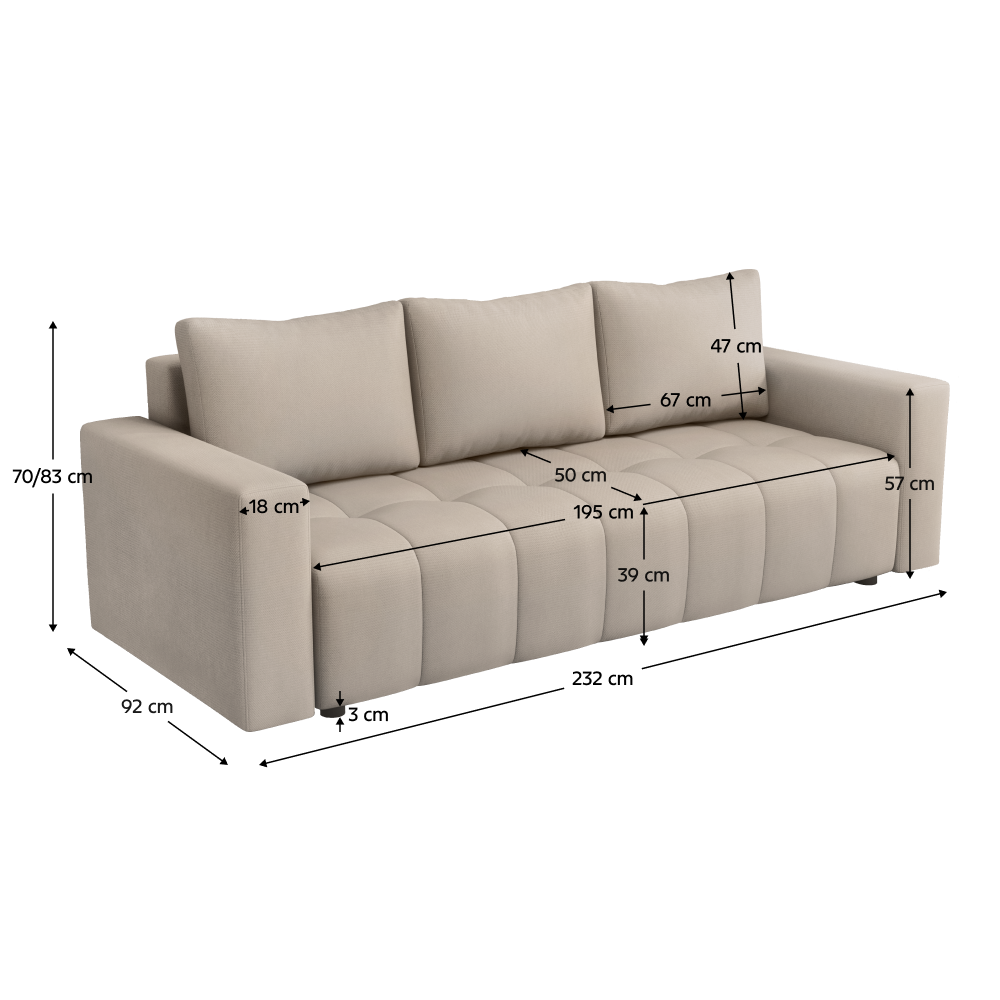 Matariál: látka Paros 02Oderuodolnosť textílie podľa testu Martindale: 55 000 oderovFarba: sivobéžováRozmery (ŠxHxV): 232x92x70/83 cmPlocha na spanie (ŠxH): 138x195 cmHĺbka sedu: 50 cmVýška sedu: 39 cmŠírka sedu: 195 cmVýška opierky na ruku: 57 cmŠírka opierky na ruku: 18 cmNosnosť na osobu: 90 kgPlastové nožičkyFarba nožičiek: čiernaVýška nožičiek: 3 cmCeločalúnenáRozkladaciaS úložným priestoromDodávaná s vankúšmiRozmery vankúša (ŠxV): 67x47 cmVýplň: pružina typu bonelPraktickáModernáDodávané v demonteMožnosť objednania v 4 farebných prevedeniach látky Paros a v 6 farebných prevedeniach látky Kronos cene 629 Eur s dodacou lehotou 6-8 týždňov. Pri individuálnej objednávke je potrebné zaplatiť 20% zálohu z danej sumy. Po uhradení zálohy bude Vaša požiadavka zadaná do výroby.