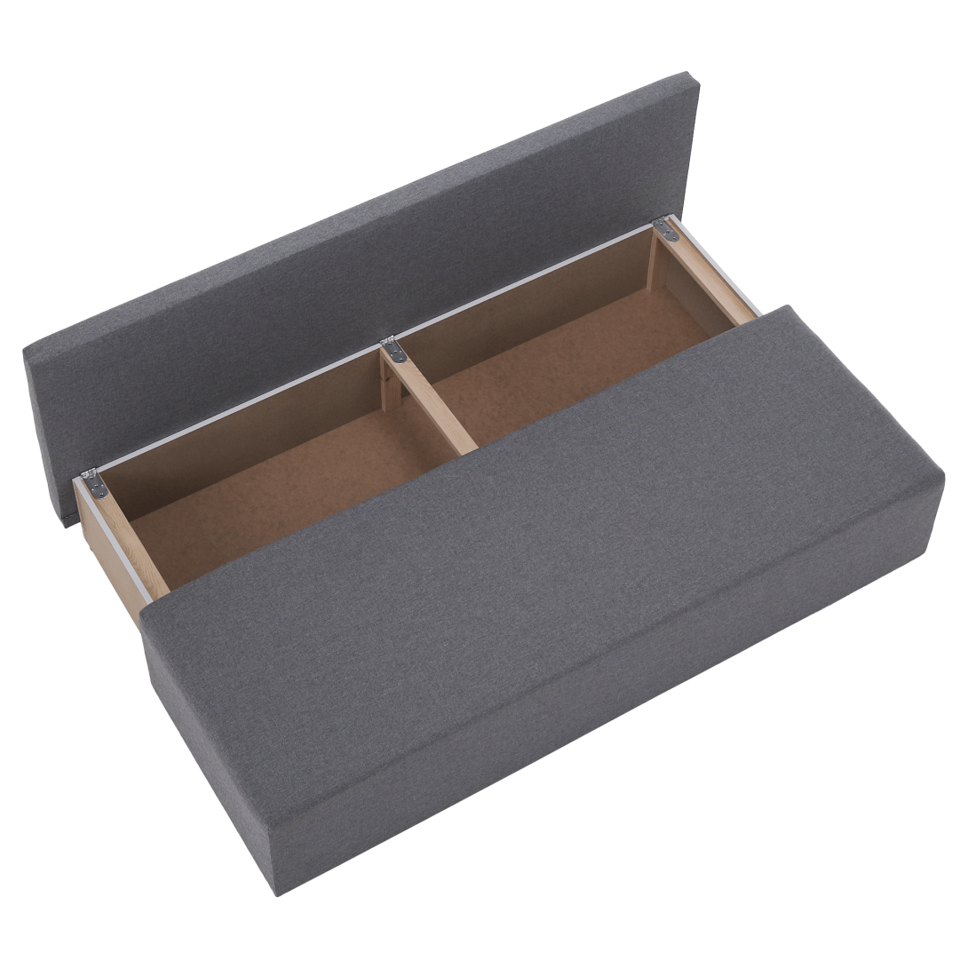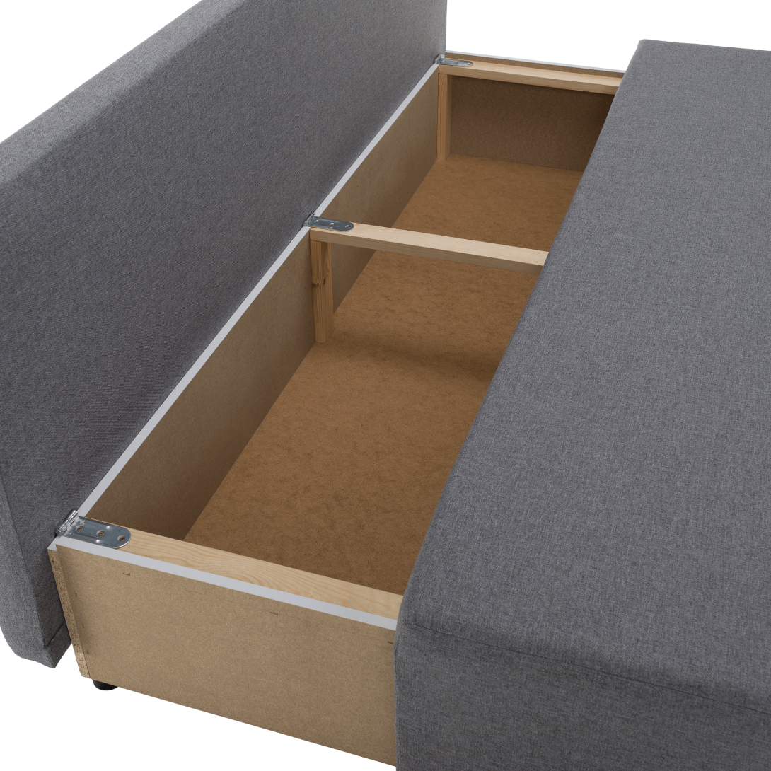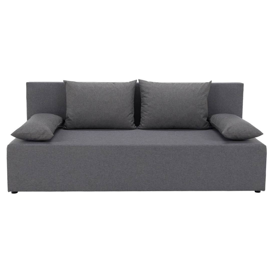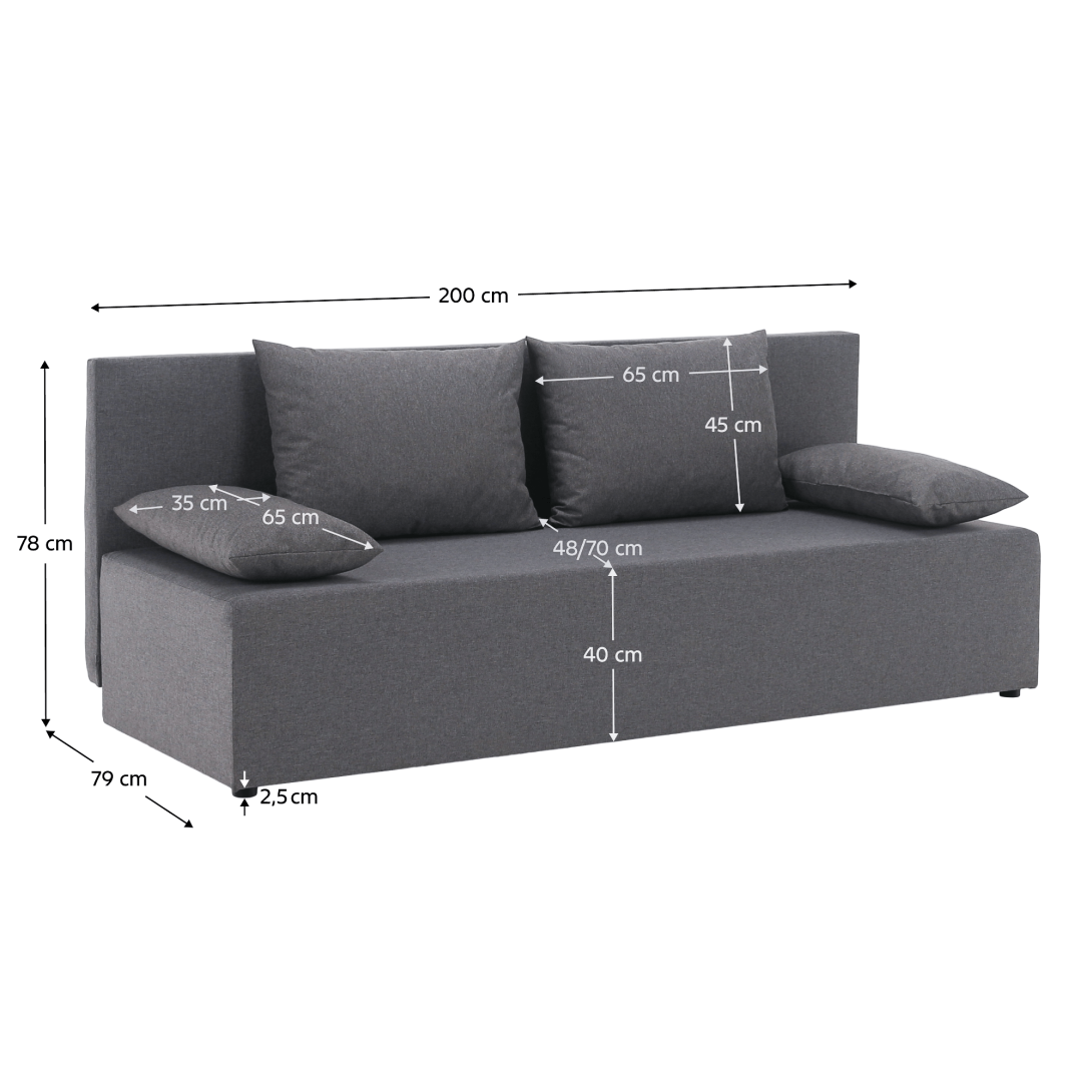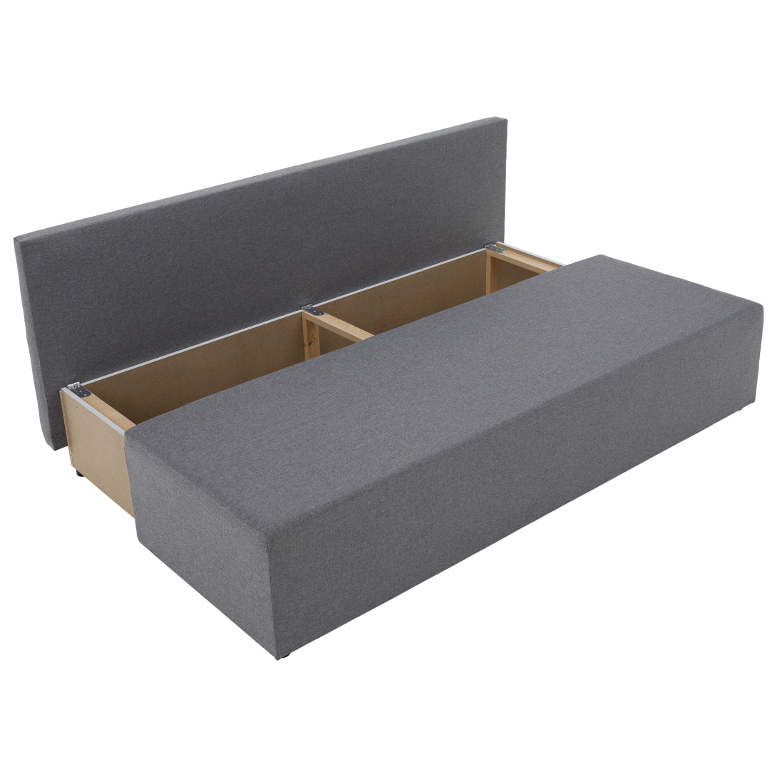 Materiál: látka Malmo 90Oderuodolnosť textílie podľa testu Martindale: 30 000 oderovFarba: svetlosiváRozmery (ŠxHxV): 200x79x78 cmPlocha na spanie (ŠxD): 140x200 cmVýška sedu: 40 cmHĺbka sedu: 48/70 cmNa nožičkáchMateriál nožičiek: plastFarba nožičiek: čiernaVýška spodného priestoru od podlahy: 2,5 cmVýplň: pur pena T28ČalúnenáRozkladaciaÚložný priestorDodávaná s vankúšamiRozmery veľkého vankúša (ŠxV): 65x45 cmRozmery malého vankúša (ŠxH): 35x65 cmNosnosť na osobu: 90 kgPraktickáModernáDodávané v demonte