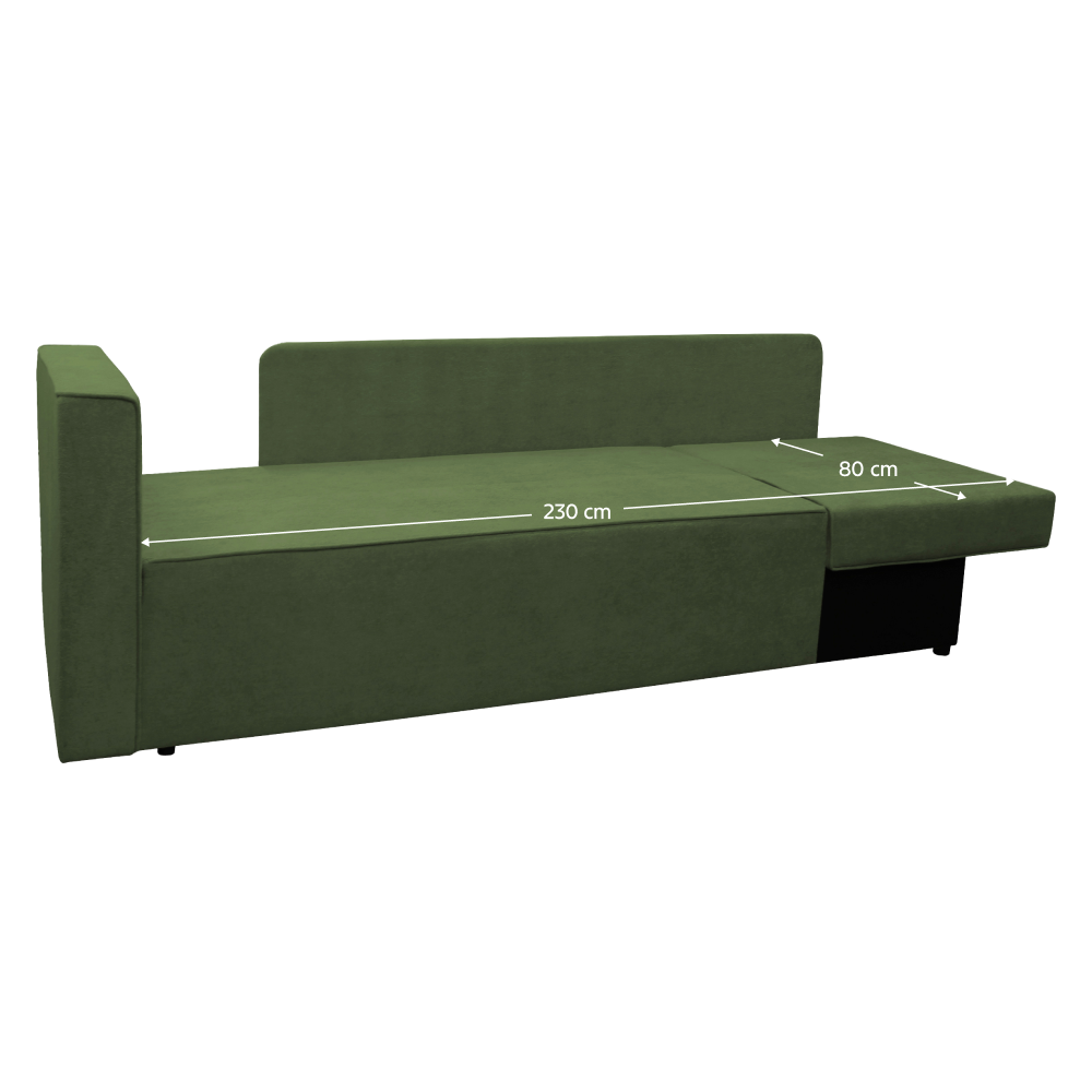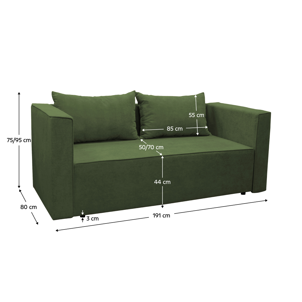 Materiál: látka Gerra 50Oderuodolnosť textílie podľa testu Martindale: 40 000 oderovFarba: zelenáRozmery (ŠxHxV): 191x80x75/95 cmPlocha na spanie (ŠxD): 80x230 cmVýška sedu: 44 cmHĺbka sedu: 50/70 cmŠírka sedu: 159 cmNosnosť na osobu: 90 kgNa nožičkáchVýška spodného priestoru od podlahy: 3 cmVýplň: pružina falista/pur penaRozkladaciaÚložný priestorDodávaná s vankúšamiRozmery vankúšov (ŠxV): 85x55 cmPraktickáModernáDodávané v demonte