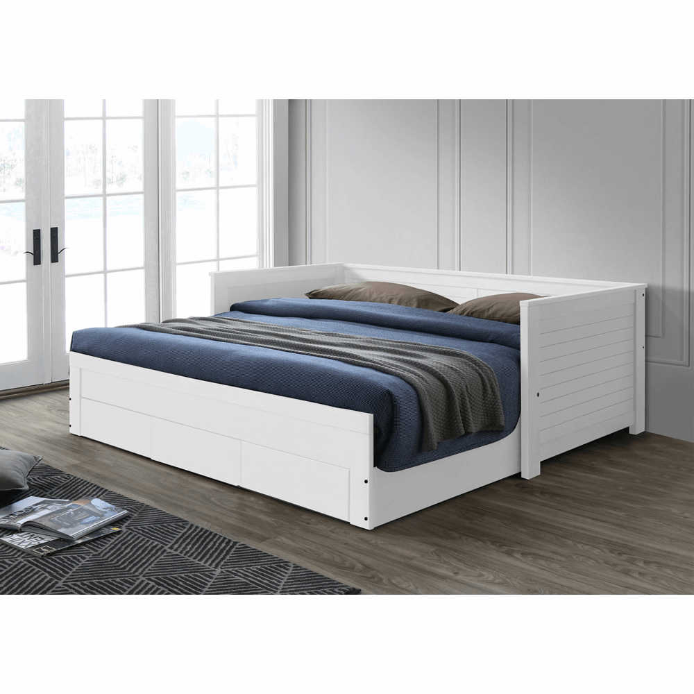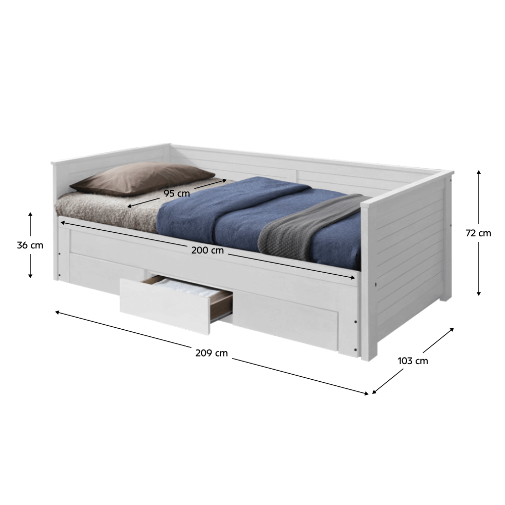 Materiál: masívne drevo/MDFFarba: bielaRozmery (ŠxHxV): 209x103x72 cmRozmery jednolôžka (ŠxHxV): 90x200 cmRozmery postele po rozložení (ŠxHxV): 180x200 cmHĺbka postele po rozložení: 186 cmVýsuvacia konštrukcia na kolieskachDodávané s 2 latkovými roštmiVýška po rošt: 36 cmNosnosť: 110 kgS bočnou zástenouS 3 šuplíkmiDodávané bez matracaMožnosť zakúpiť matrace z našej ponukyDodávané v demonteAk plánujete posteľ používať rozloženú ako manželskú posteľ, odporúčame matrace s rozmermi 90x200 z našej ponuky. Ak posteľ budete používať ako jednolôžko, odporúčame matrace s rozmerom 85x200 a 95x200 cm.Jedným z matracov ku posteli Goreta môže byť aj matrac BE KATARINA 10 NEW s rozmerom 95x200 cm..