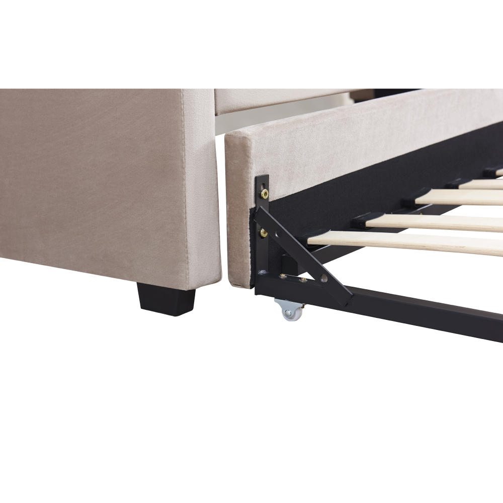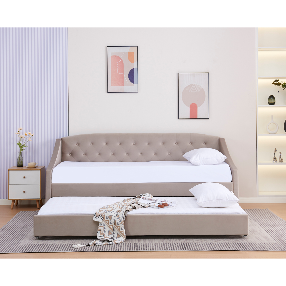 Materiál: Velvet látka/kov/pena/preglejkaOderuodolnosť textílie podľa testu Martindale: 80 000 oderovFarba: hnedosivá TaupeRozmery (ŠxHxV): 104x215x92 cmPlocha na spanie (ŠxD): 90x200 cmVýška po rošt: 40 cmNosnosť na osobu: 100 kgNa nožičkáchVýška nožičiek: 4 cmVýsuvná prístelkaPrístelka na kolieskachDodávaná s lamelovým roštomDodávané bez matracaOdporúčame zakúpiť matrac z našej ponukyOdporúčaná výška matraca: 20 cmDekoratívne prešité čelo posteleElegantnáČalúnenáDodávané v demonte