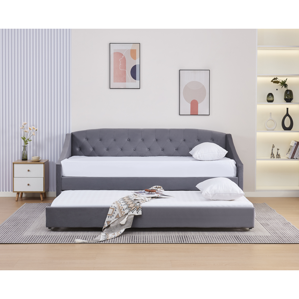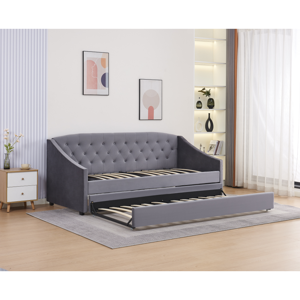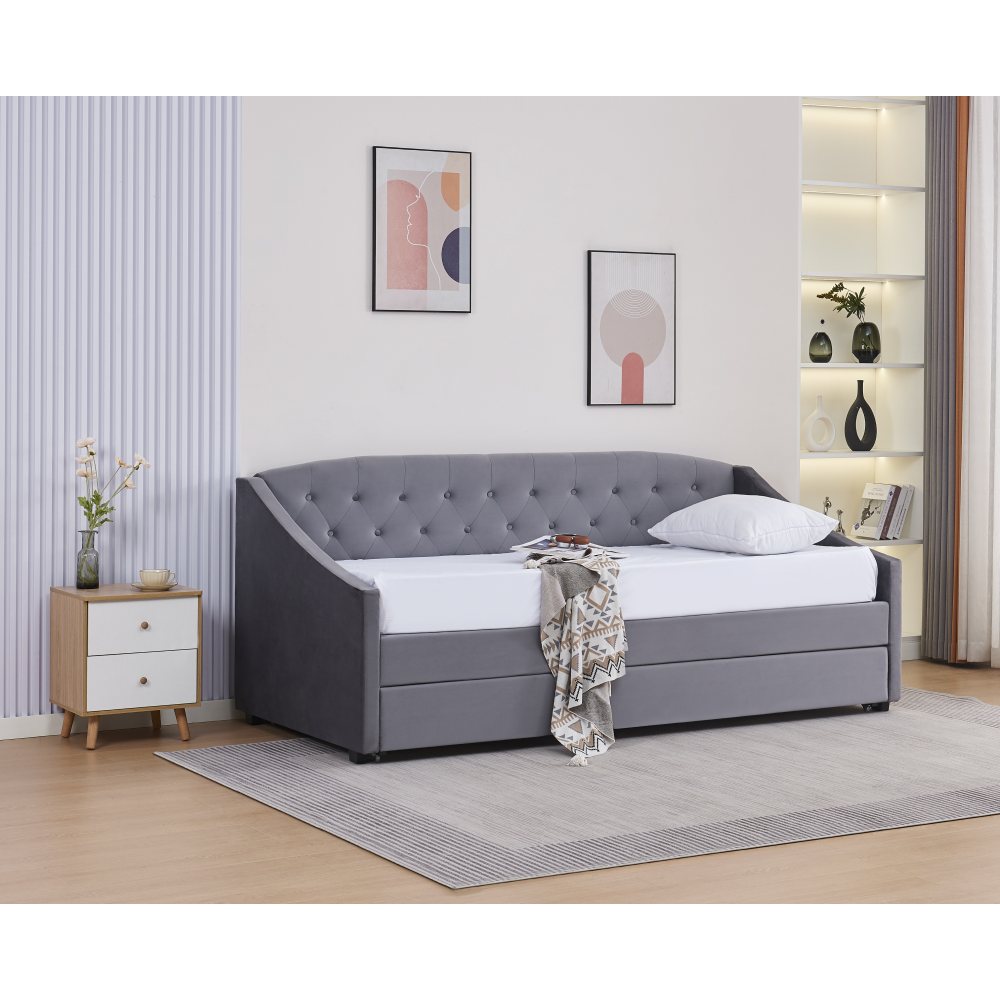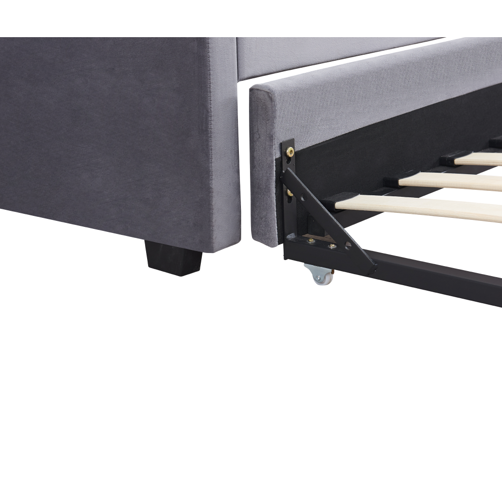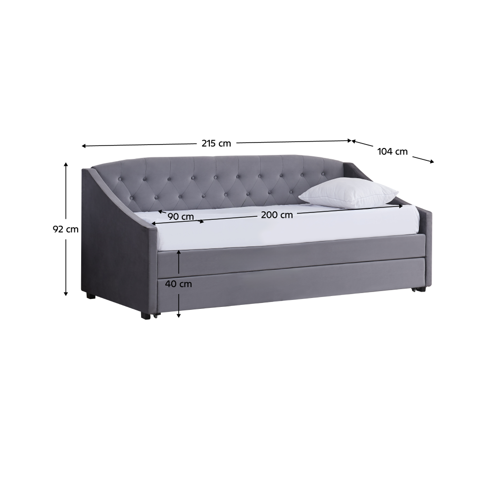 Materiál: Velvet látka/kov/pena/preglejkaOderuodolnosť textílie podľa testu Martindale: 80 000 oderovFarba: siváRozmery (ŠxHxV): 104x215x92 cmPlocha na spanie (ŠxD): 90x200 cmVýška po rošt: 40 cmNosnosť na osobu: 100 kgNa nožičkáchVýška nožičiek: 4 cmVýsuvná prístelkaPrístelka na kolieskachDodávaná s lamelovým roštomDodávané bez matracaOdporúčame zakúpiť matrac z našej ponukyOdporúčaná výška matraca: 20 cmDekoratívne prešité čelo posteleElegantnáČalúnenáDodávané v demont