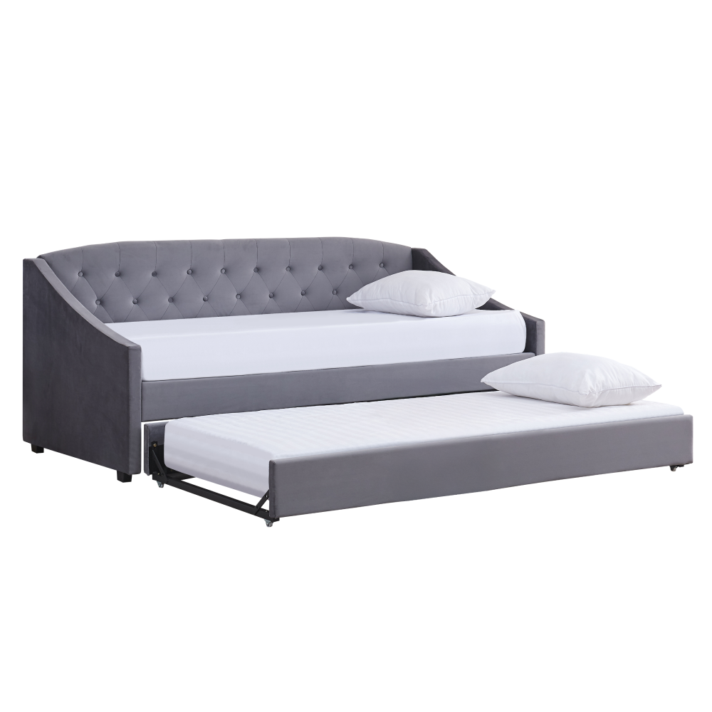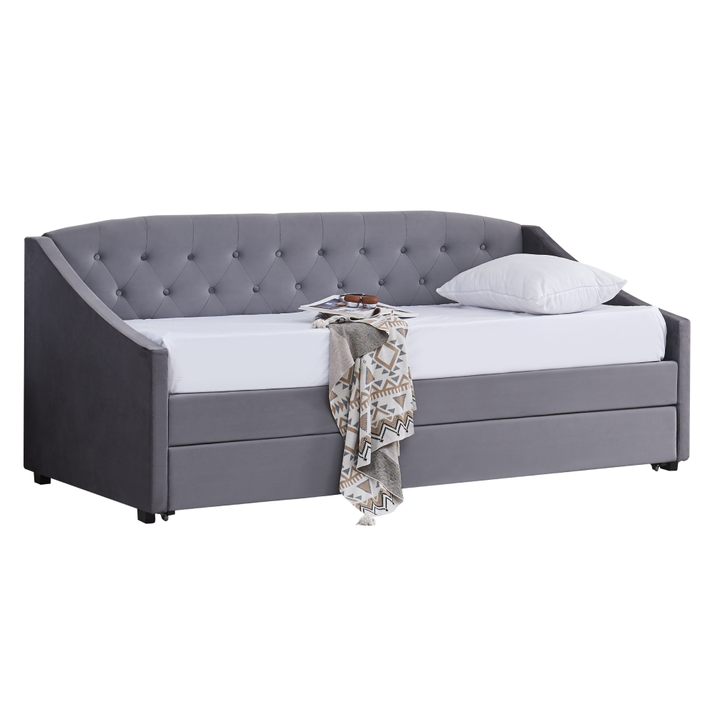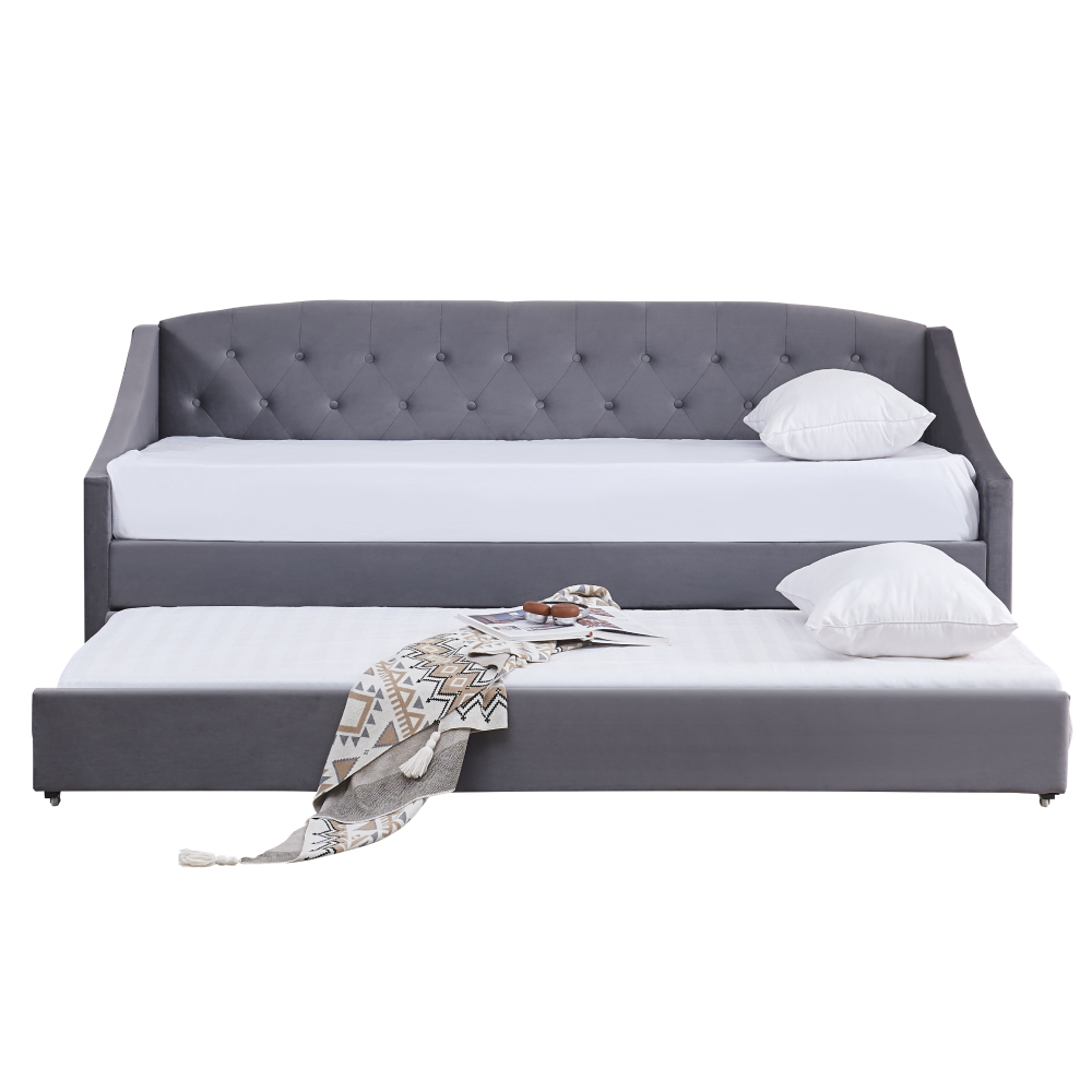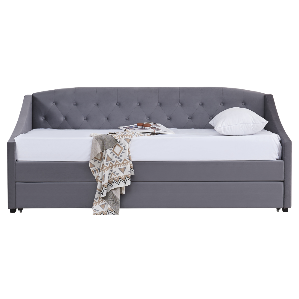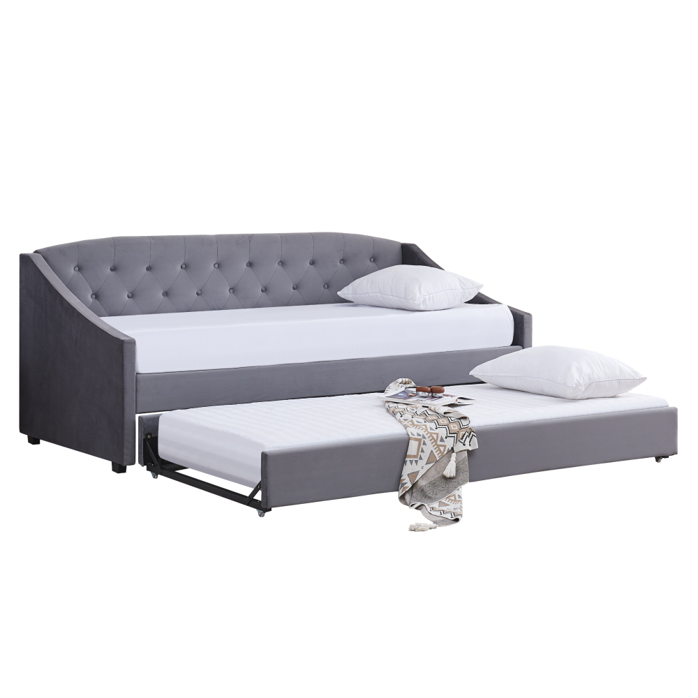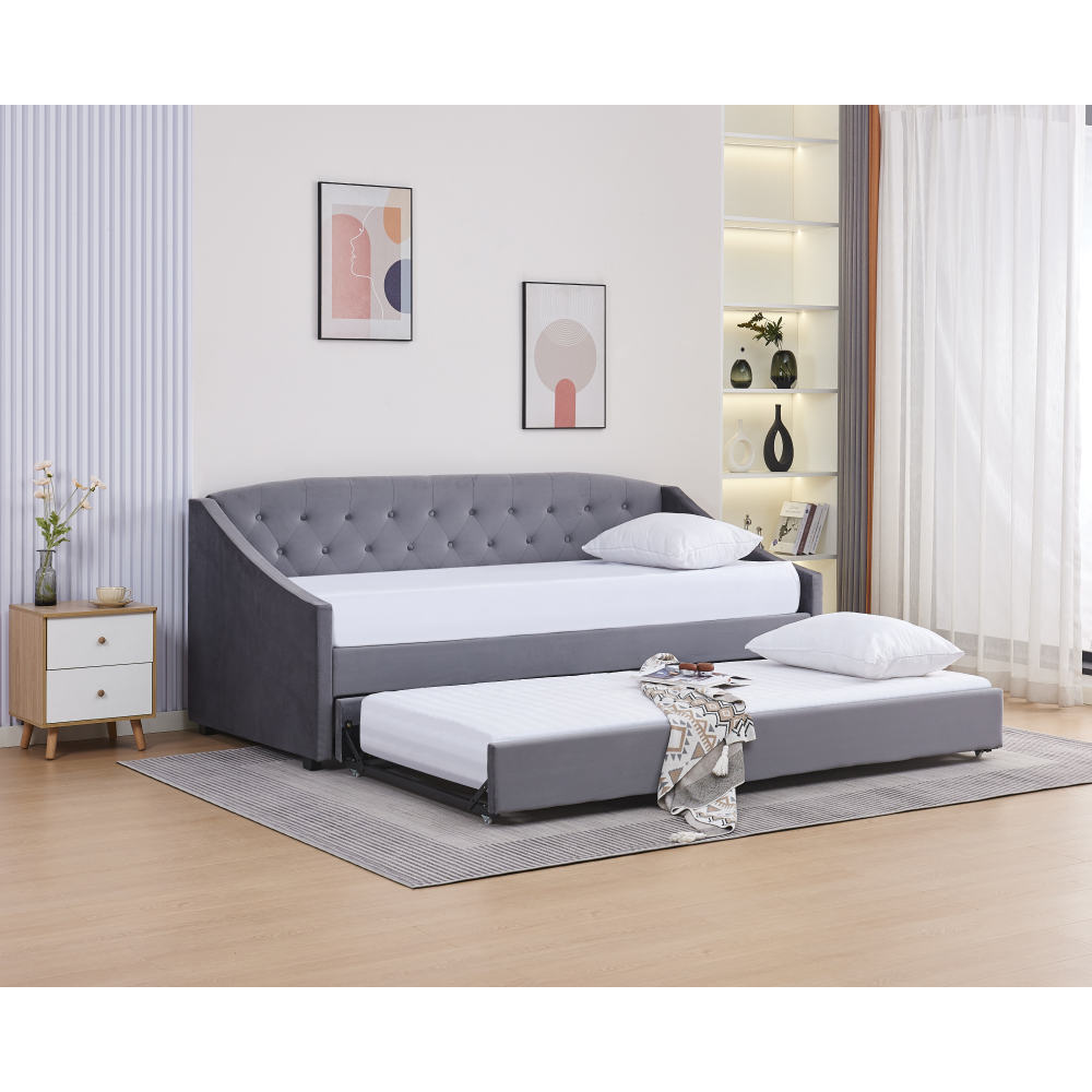 Materiál: Velvet látka/kov/pena/preglejkaOderuodolnosť textílie podľa testu Martindale: 80 000 oderovFarba: siváRozmery (ŠxHxV): 104x215x92 cmPlocha na spanie (ŠxD): 90x200 cmVýška po rošt: 40 cmNosnosť na osobu: 100 kgNa nožičkáchVýška nožičiek: 4 cmVýsuvná prístelkaPrístelka na kolieskachDodávaná s lamelovým roštomDodávané bez matracaOdporúčame zakúpiť matrac z našej ponukyOdporúčaná výška matraca: 20 cmDekoratívne prešité čelo posteleElegantnáČalúnenáDodávané v demont