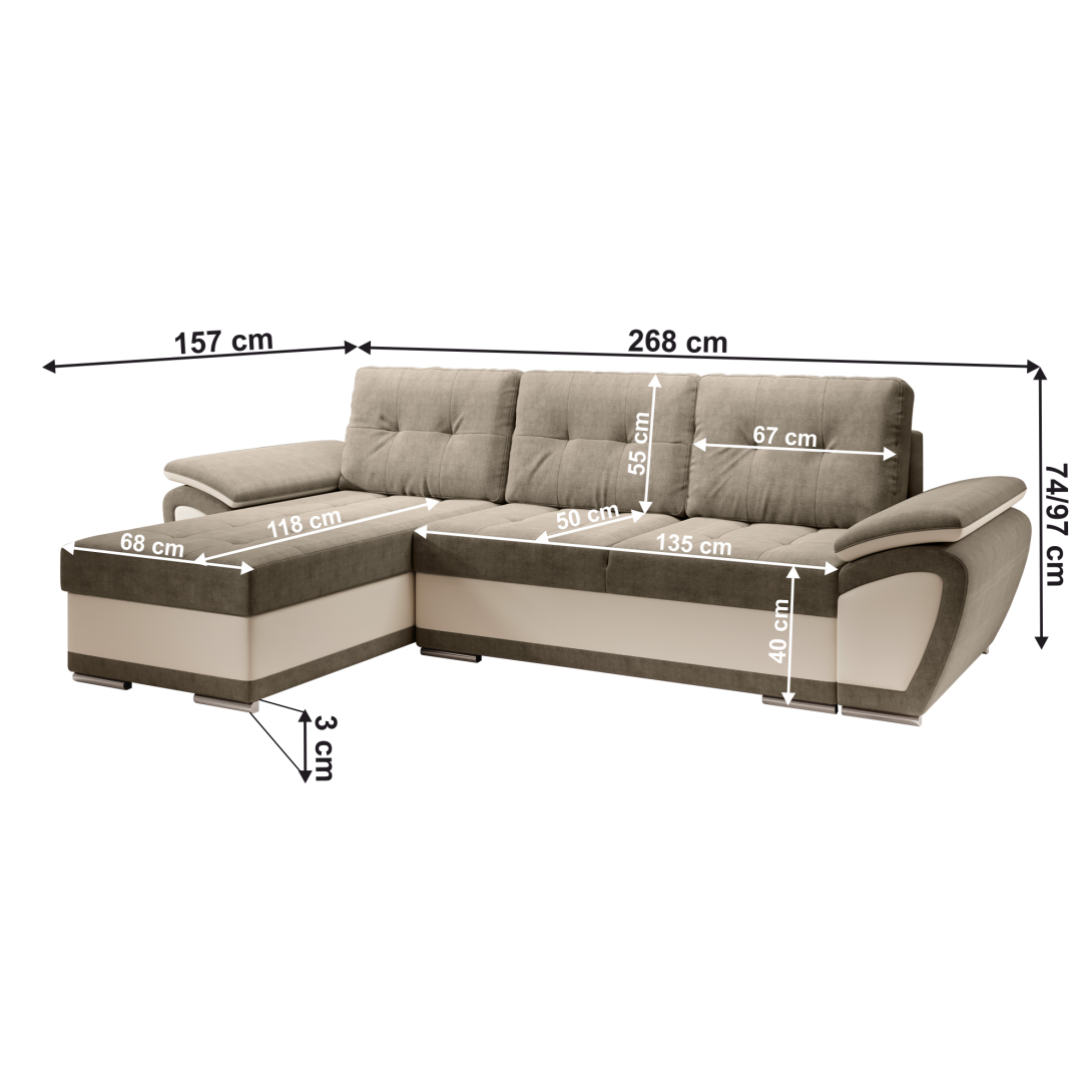 Materiál: ekokoža 112/látka Orinoco 24Oderuodolnosť ekokože podľa testu Martindale: 100 000 oderovOderuodolnosť textílie podľa testu Martindale: 72 000 oderovFarba: béžová/svetlohnedáRozmery (ŠxHxV): 268x157x97cmVýška sedu: 40 cmHĺbka sedu: 50 cmVýška spodného priestoru od podlahy: 3 cmRozkladaciaPlocha na spanie (ŠxD): 130x200 cmVýška opierky na chrbát: 50 cmRozmery otomanu (ŠxH): 68x118 cmOpierka na ruku (ŠxH): 31x90 cm Nosnosť na osobu: 90 kgRohováS úložným priestoromDekoratívne prešitieVýplň: pružina falista/pur penaNa plastových nožičkáchFarba nožičiek: striebornáCeločalúnenáĽavé prevedenieDodávané s troma vankúšmiRozmery vankúšov (ŠxH): 67x55 cmDodávané v demonte