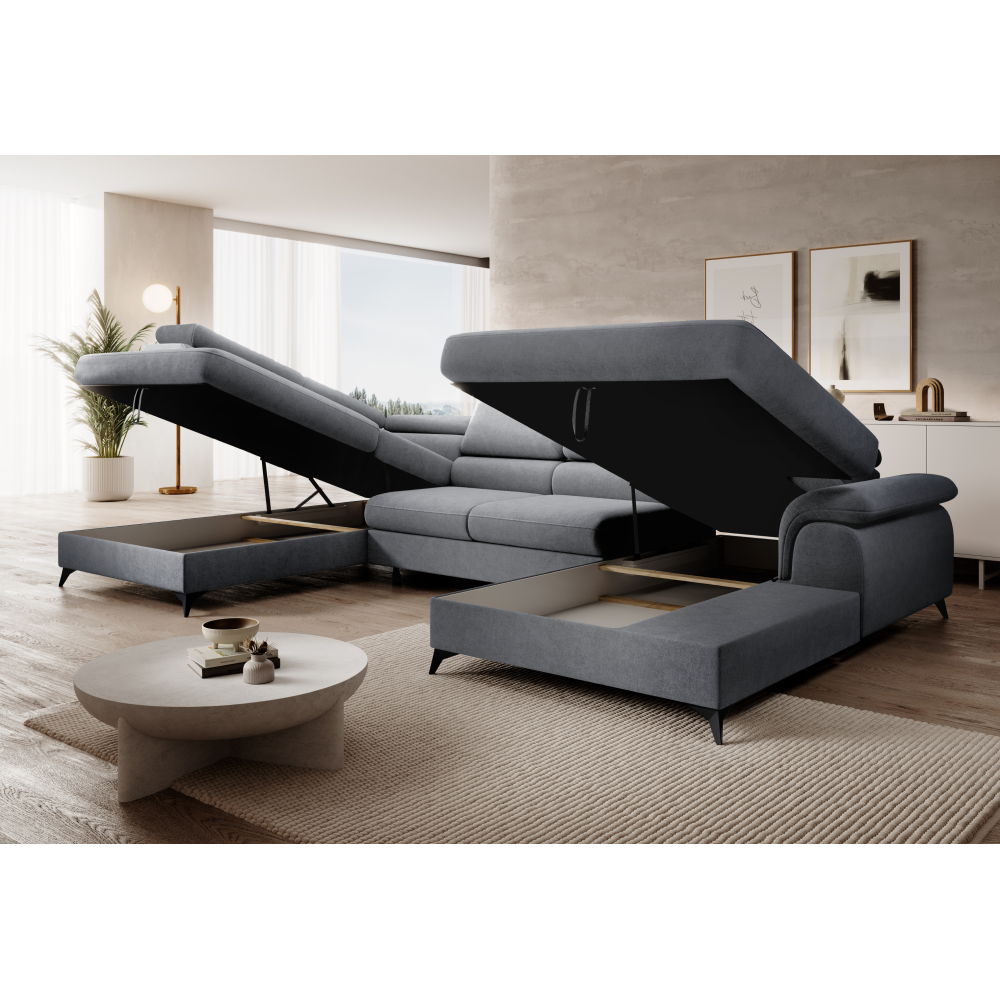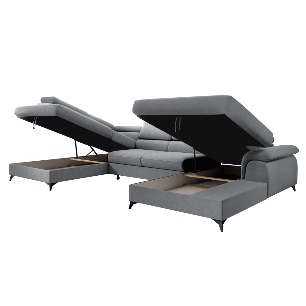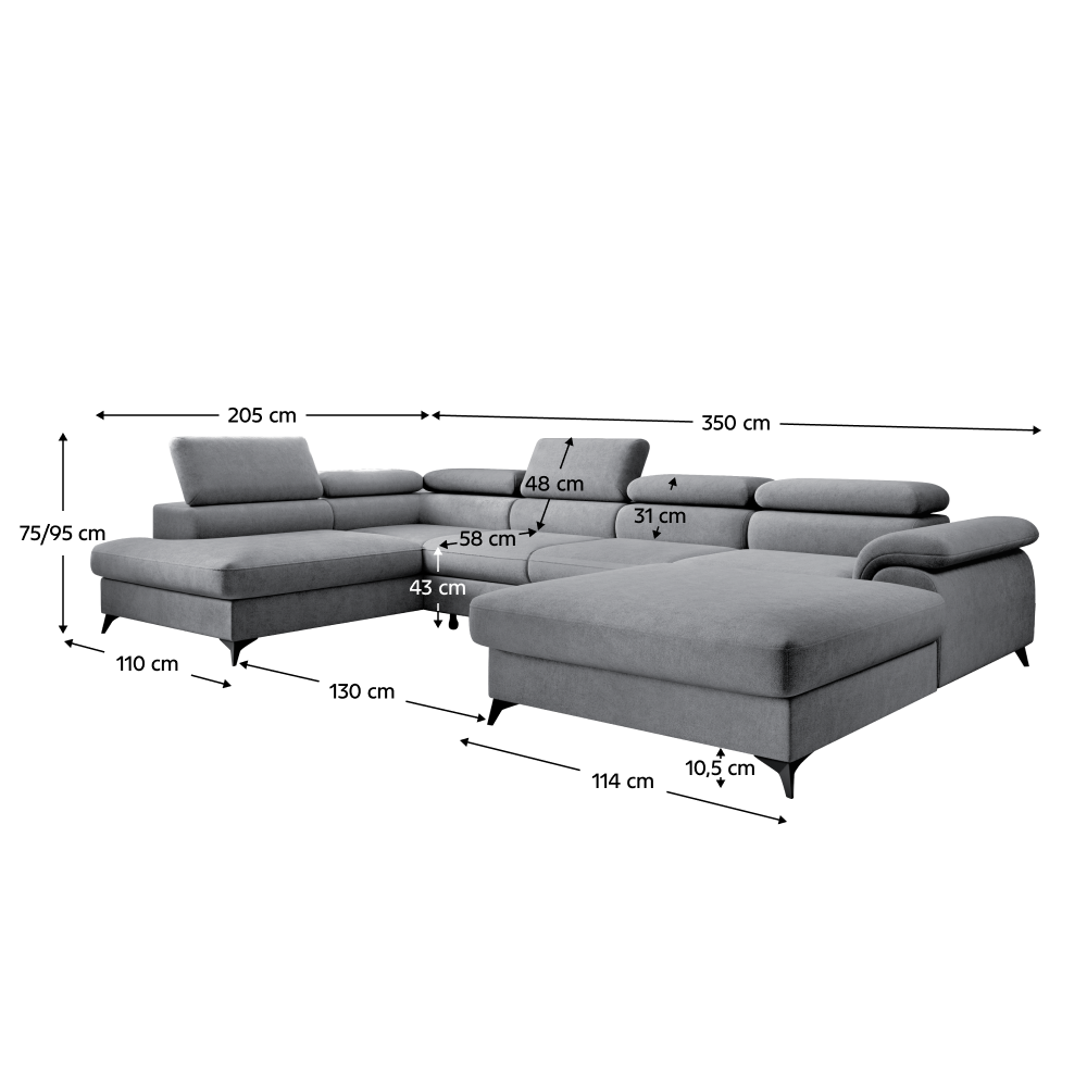 Materiál: látka Whisper 17Oderuodolnosť textílie podľa testu Martindale: 100 000 oderovFarba: siváRozmery (ŠxHxV): 350x205x75/95 cmPlocha na spanie (ŠxD): 125x263 cmVýška sedu: 43 cmHĺbka sedu: 58 cmRozmer medzi otomanmi: 130 cmŠírka menšieho otomanu: 110 cmŠírka väčšieho otomanu: 114 cmVýška opierky na chrbát: 52 cmNa nožičkáchMateriál nožičiek: kovFarba nožičiek: čiernaVýška spodného priestoru od podlahy: 10,5 cmVýplň: pružina falista+pur penaRozkladaciaCeločalúnenáĽavé prevedenieTvar URohováS úložným priestorom6 polohovateľných opierok hlavy5 stupňové polohovanie opierokDodávané v demonteMožnosť objednania v 5 farebných prevedeniach látky Whisper v cene 1 829 Eur. Pri individuálnej objednávke je potrebné zaplatiť 20% zálohu z danej sumy. Po uhradení zálohy bude Vaša požiadavka zadaná do výroby. Dodacia lehota 6-8 týždňov.