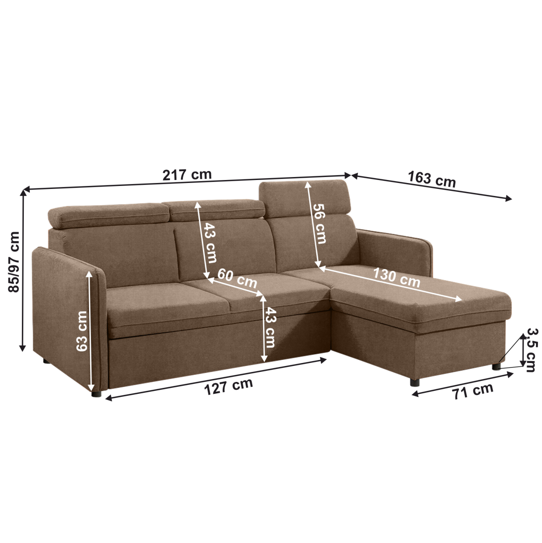 Materiál čalúnenie: látka Enjoy New 37Oderuodolnosť látky podľa testu Martindale: 45 000 oderovFarba čalúnenie: sivohnedá TaupeRozmery (ŠxHxV): 217x163x85/97 cmPlocha na spanie (ŠxD): 128x200 cmVýška sedu: 43 cmHĺbka sedu: 60 cmVýška chrbtovej opierky: 56 cmŠírka otomanu: 71 cmHĺbka otomanu: 130 cmŠírka sedacej časti: 127 cmRozmery opierky na ruky (ŠxHxV): 10x93x63 cmVýška spodného priestoru od podlahy: 3,5 cmPlastové nožičkyFarba nožičiek: čiernaNosnosť na osobu: 90 kgVýplň: pružina falistaRozkladaciaRohováCeločalúnenáUniverzálnaS úložným priestoromPolohovacie opierky hlavyDodávané v demonteMožnosť objednania v 4 farebných odtieňoch látky Enjoy New s dodacou lehotou 6-8 týždňov. Pri individuálnej objednávke je potrebné zaplatiť 10% zálohu z danej sumy. Po uhradení zálohy bude Vaša požiadavka zadaná do výroby.
