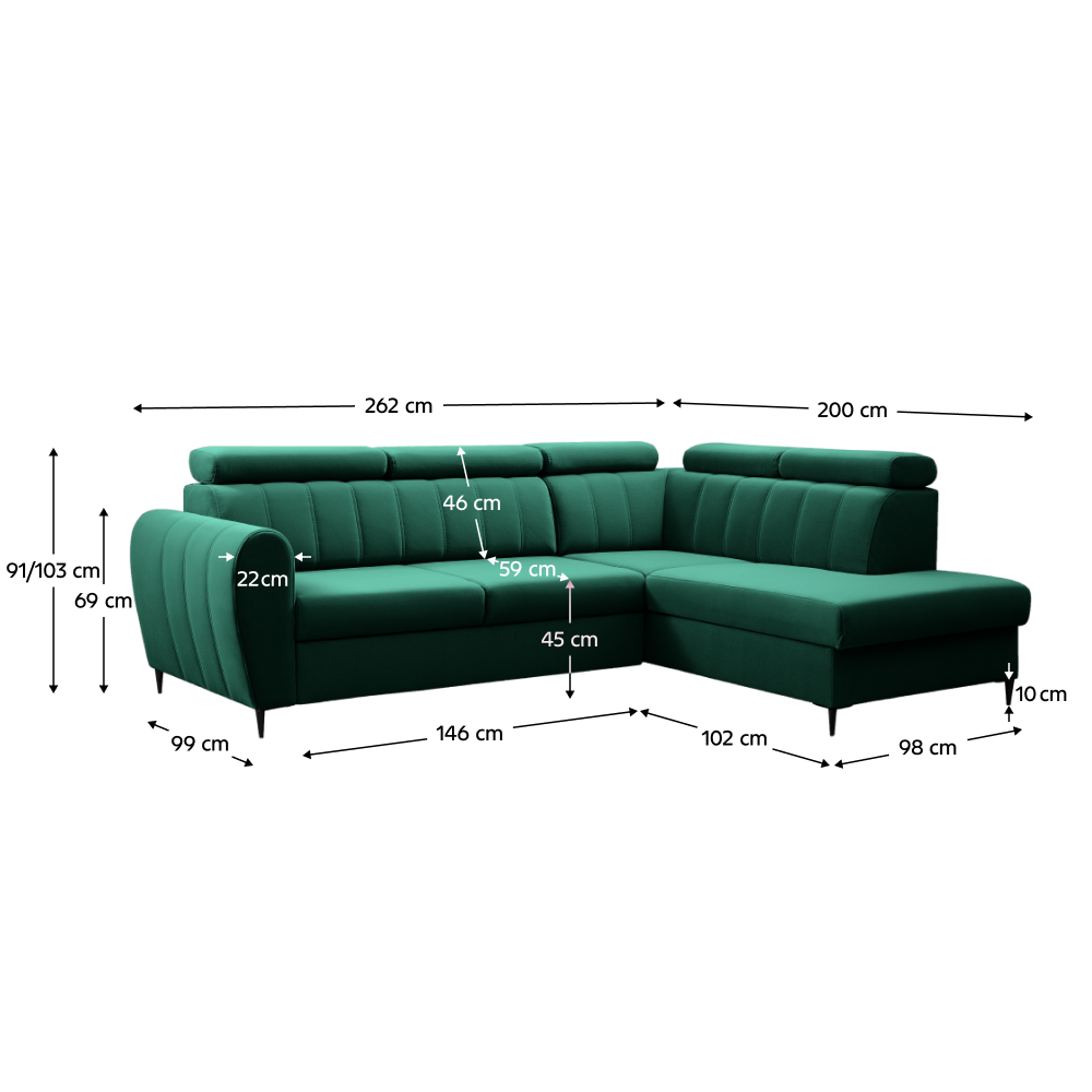 Materiál čalúnenie: látka Kronos 19Oderuodolnosť látky podľa testu Martindale: 50 000Farba čalúnenie: smaragdováRozmery (ŠxHxV): 262x200x91/103 cmPlocha na spanie (ŠxD): 128x210 cmVýška sedu: 45 cmHĺbka sedu: 46/59 cmŠírka otomanu: 98 cmŠírka sedacej časti: 146 cmRozmery opierky na ruky (ŠxHxV): 22x99x69 cmVýška spodného priestoru od podlahy: 10 cmNa nožičkáchMateriál nožičiek: kovFarba nožičiek: čiernaNosnosť na osobu: 90 kgVýplň: pružina falista + Pur penaRozkladaciaRohováCeločalúnenáPravé prevedenieS úložným priestoromPolohovacie opierky hlavyDodávané v demonteMožnosť objednania v 4 farebných odtieňoch látky Paros a v 4 farebných odtieňoch látky Kronos s dodacou lehotou 6-8 týždňov. Pri individuálnej objednávke je potrebné zaplatiť 10% zálohu z danej sumy. Po uhradení zálohy bude Vaša požiadavka zadaná do výroby.