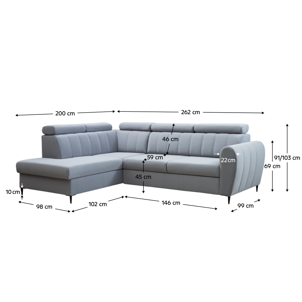Materiál čalúnenie: látka Paros 05Oderuodolnosť látky podľa testu Martindale: 50 000Farba čalúnenie: svetlosiváRozmery (ŠxHxV): 262x200x91/103 cmPlocha na spanie (ŠxD): 128x210 cmVýška sedu: 45 cmHĺbka sedu: 46/59 cmŠírka otomanu: 98 cmŠírka sedacej časti: 146 cmRozmery opierky na ruky (ŠxHxV): 22x99x69 cmVýška spodného priestoru od podlahy: 10 cmNa nožičkáchMateriál nožičiek: kovFarba nožičiek: čiernaNosnosť na osobu: 90 kgVýplň: pružina falista + Pur penaRozkladaciaRohováCeločalúnenáĽavé prevedenieS úložným priestoromPolohovacie opierky hlavyDodávané v demonteMožnosť objednania v 4 farebných odtieňoch látky Paros a v 4 farebných odtieňoch látky Kronos s dodacou lehotou 6-8 týždňov. Pri individuálnej objednávke je potrebné zaplatiť 10% zálohu z danej sumy. Po uhradení zálohy bude Vaša požiadavka zadaná do výroby.
