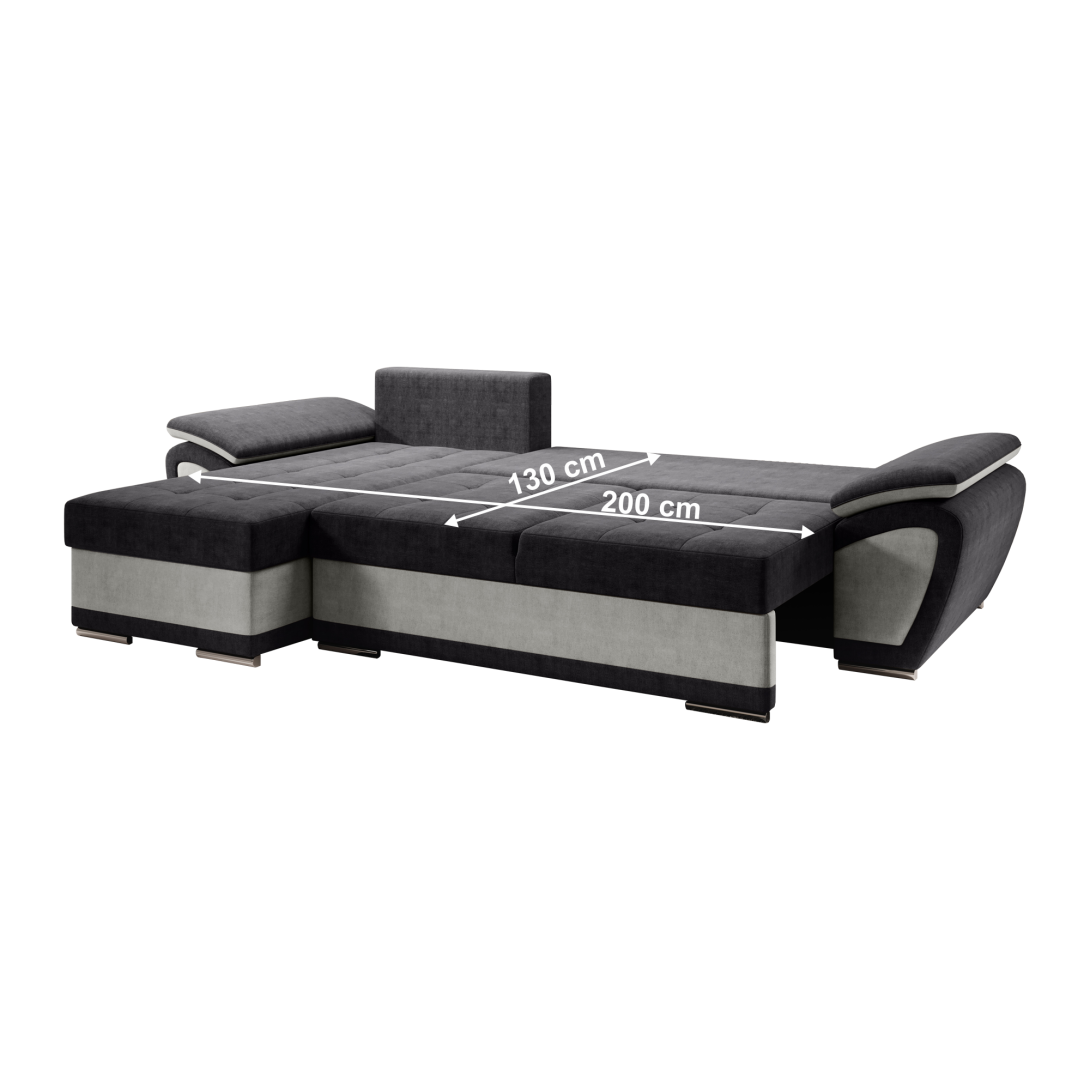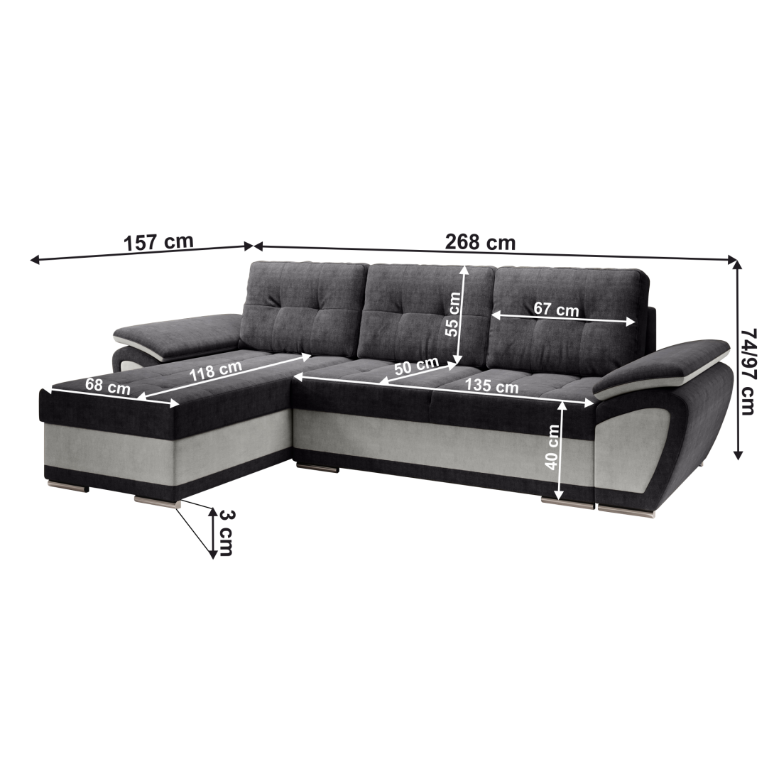 Materiál: látka Orinoco 90/96Oderuodolnosť textílie podľa testu Martindale: 72 000 oderovFarba: svetlosivá/tmavosiváRozmery (ŠxHxV): 268x157x97 cmVýška sedu: 40 cmHĺbka sedu: 50 cmVýška spodného priestoru od podlahy: 3 cmRozkladaciaPlocha na spanie (ŠxD): 130x200 cmVýška opierky na chrbát: 50 cmRozmery otomanu (ŠxH): 68x118 cmOpierka na ruku (ŠxH): 31x90 cm Nosnosť na osobu: 90 kgRohováS úložným priestoromDekoratívne prešitieVýplň: pružina falista/pur penaNa plastových nožičkáchFarba nožičiek: striebornáCeločalúnenáĽavé prevedenieDodávané s troma vankúšmiRozmery vankúšov (ŠxH): 67x55 cmDodávané v demonte