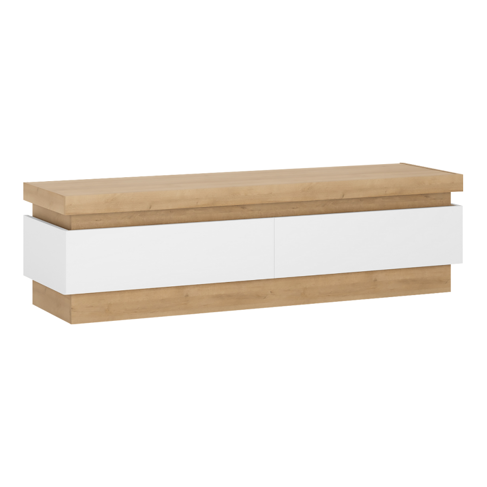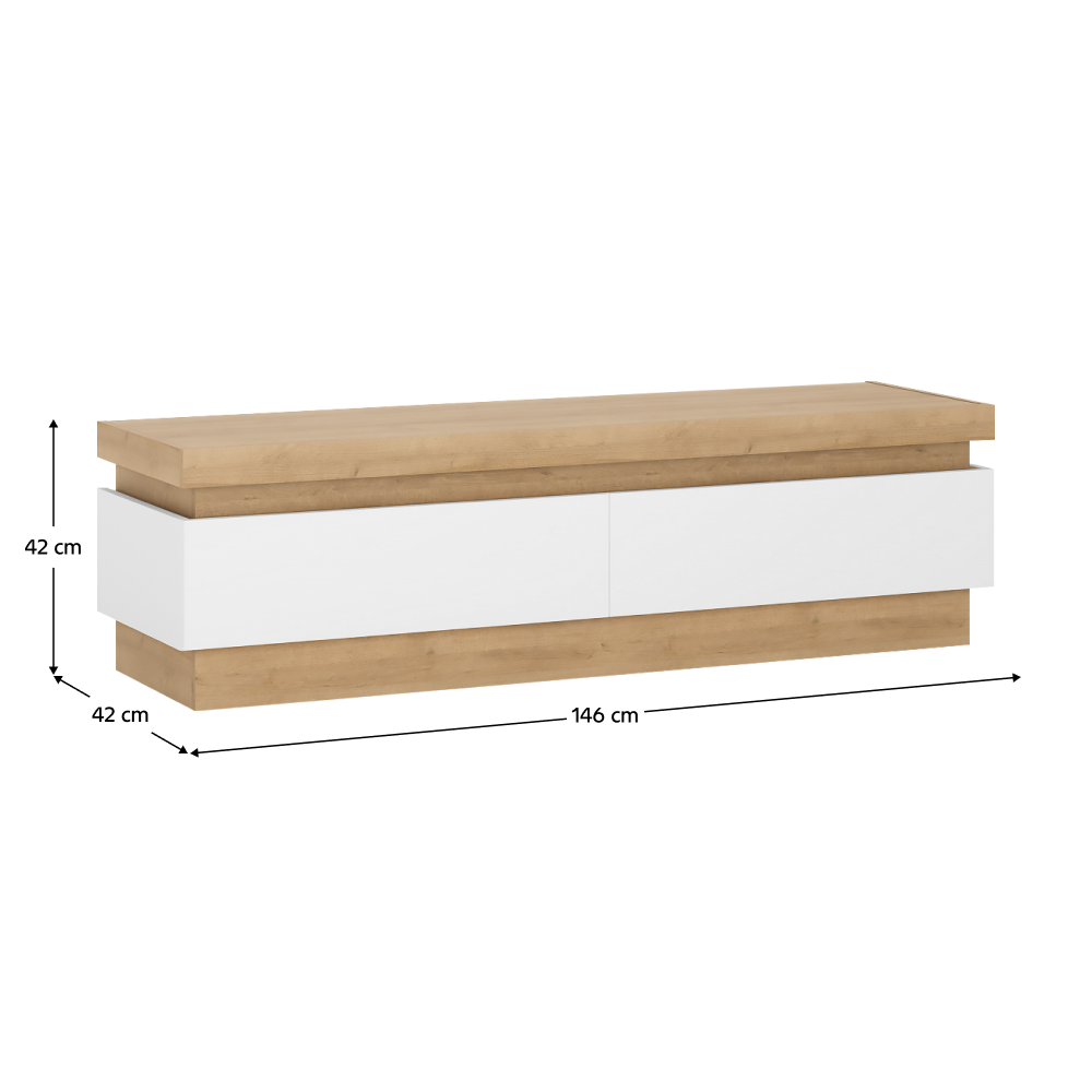 RTV stolík zo sektorovej zostavy LEONARDO v prevedení dub riviera/bielaRozmery (ŠxHxV): 146x42x42 cmHrúbka materiálu: 16 mmSystém tichého dorazu šuplíkovLED osvetlenie po obvode je v ceneDodávané v demonte