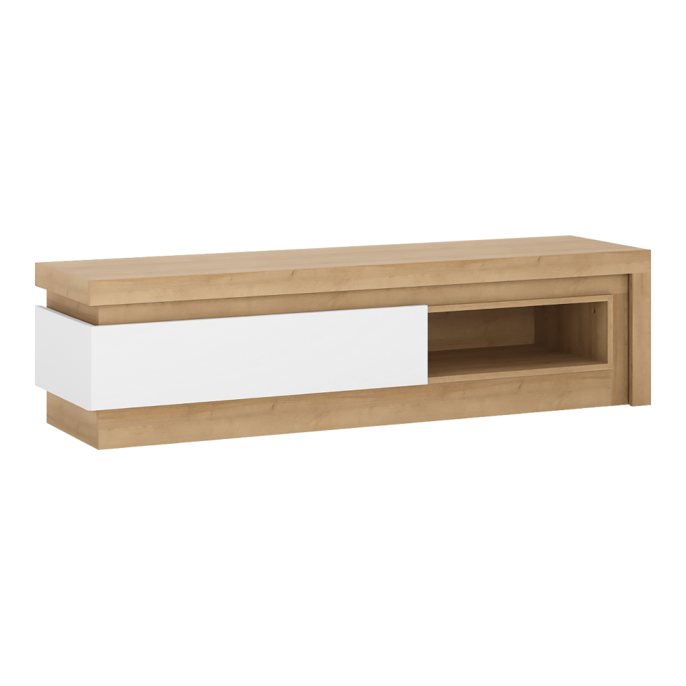 RTV stolík zo sektorovej zostavy LEONARDO v prevedení dub riviera/biela s vysokám leskom.Rozmery (ŠxHxV): 130x42x42 cmHrúbka materiálu: 16 mmSystém tichého dorazu šuplíkovLED osvetlenie po obvode je v ceneDodávané v demonte