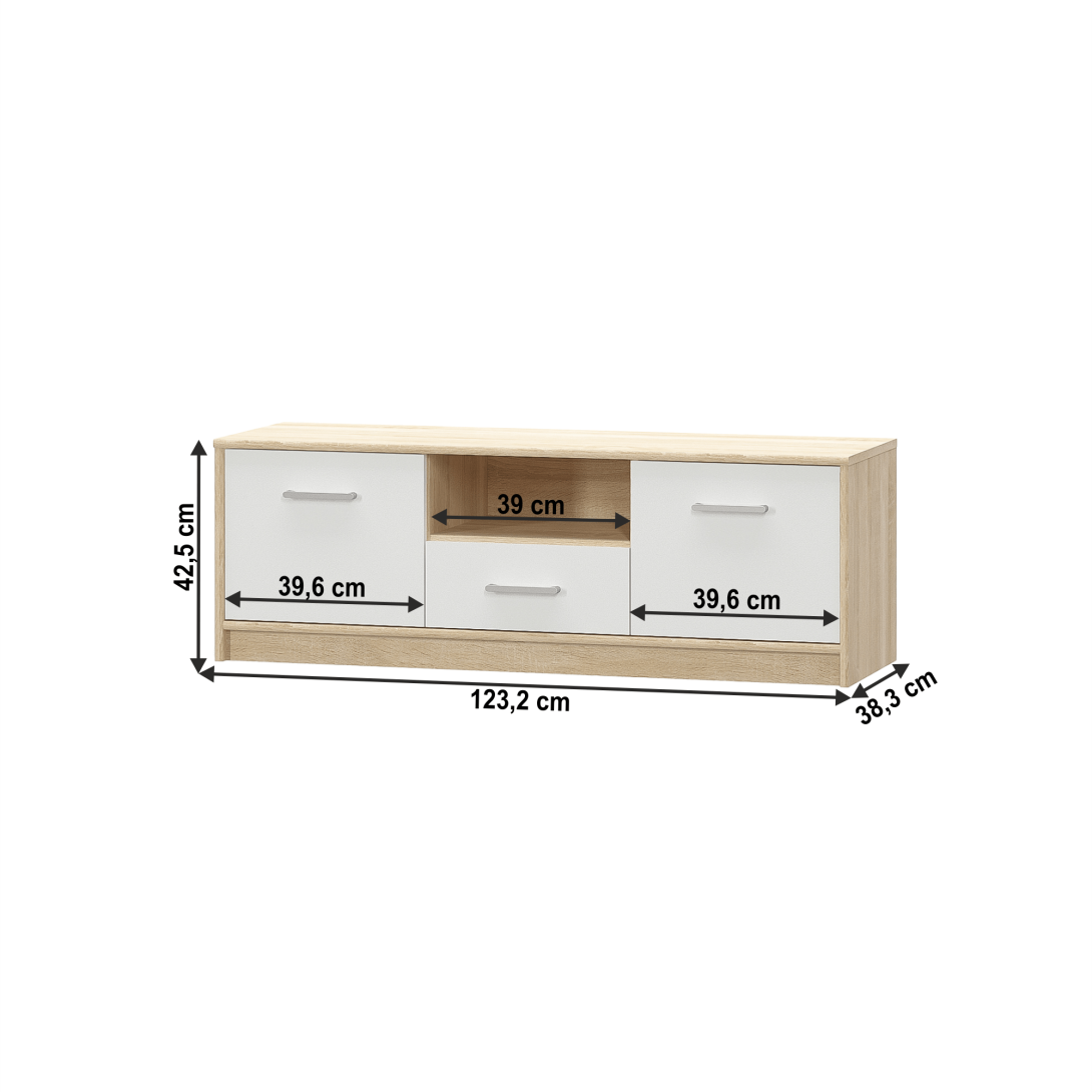RTV stolík 2D1S TEYOMateriál: DTD laminovanáFarba: biela/dub sonomaRozmery (ŠxHxV): 123,2x38,3x42,5 cmHrúbka materiálu: 16 mm Dodávané v demonte.