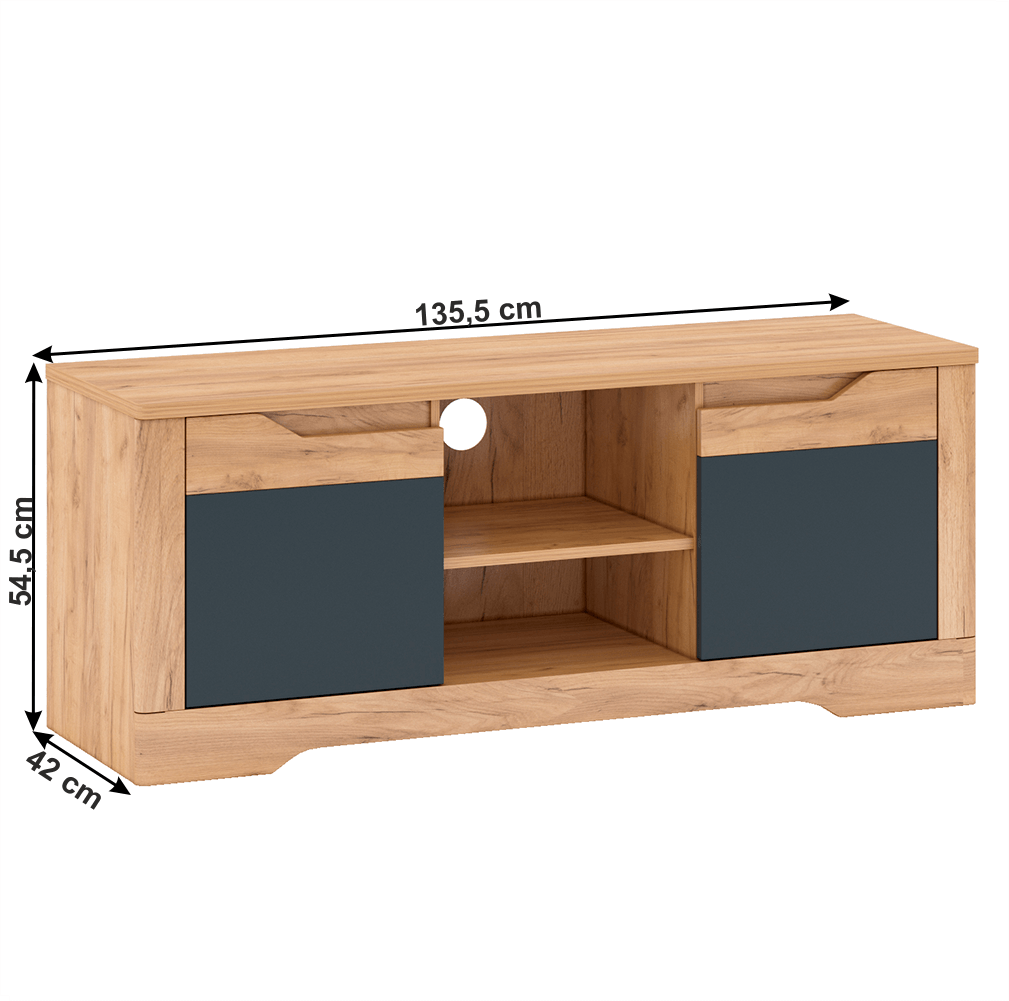 Materiál: DTD laminovaná/MDFFarba: dub craft zlatý/grafit siváRozmery (ŠxHxV): 135,2x42x54,5 cmHrúbka materiálu korpus: 16 mmHrúbka materiálu vrchná doska: 22 mmDve skrinkyPoličkaDodávané v demonte
