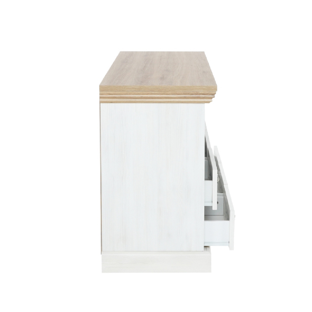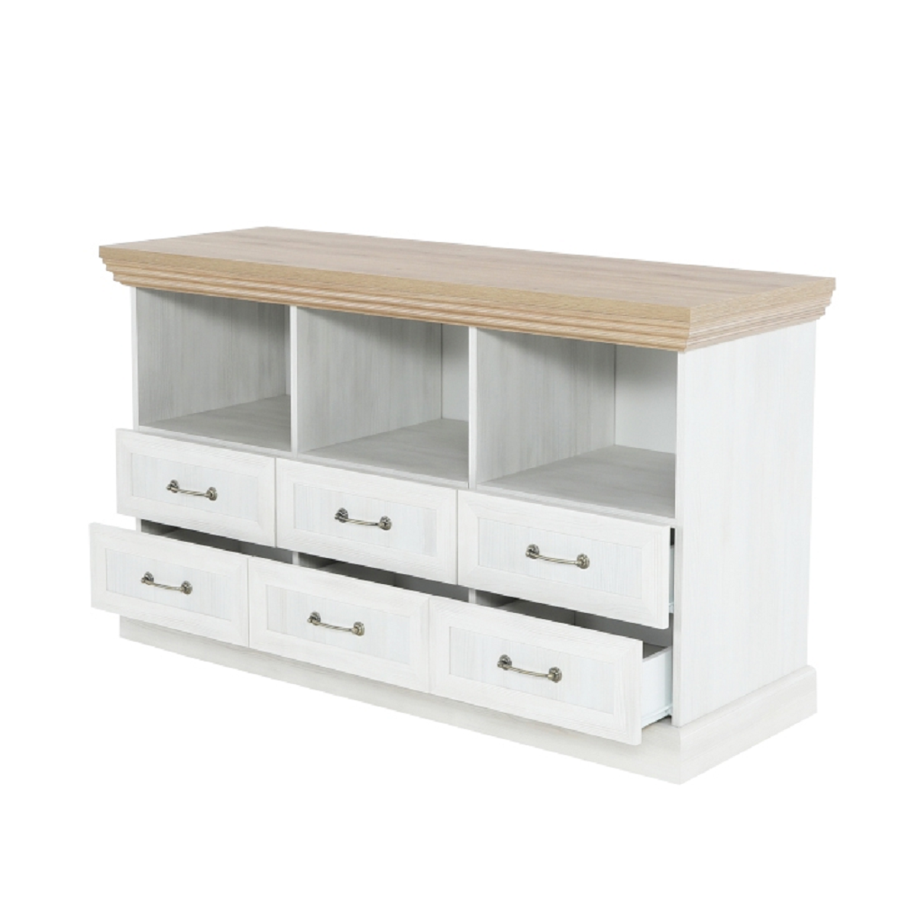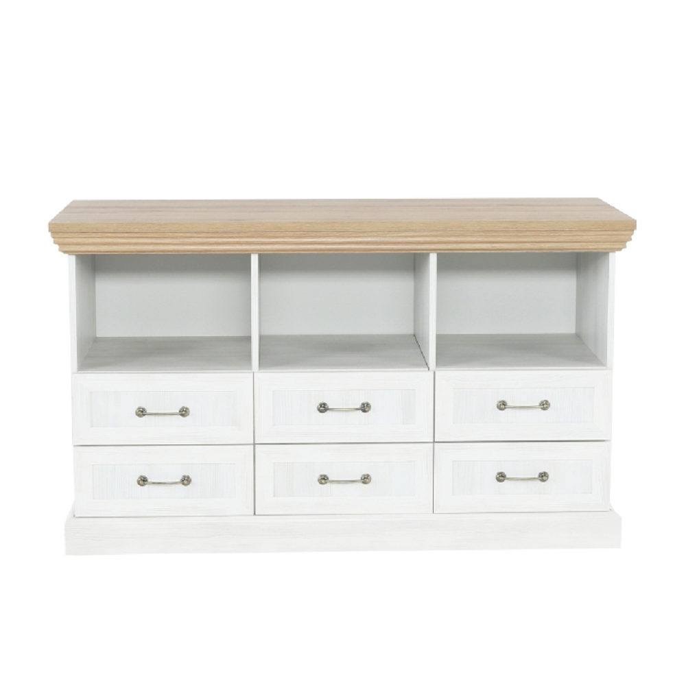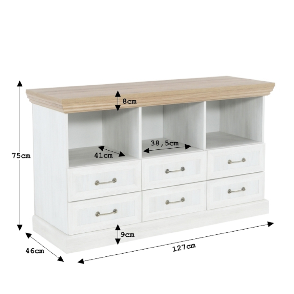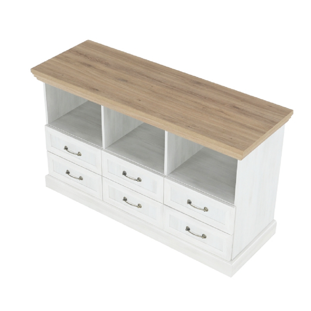 RTV stolík RS so šiestimi šuplíkmi a troma policami z elegantného sektorového systému Royal v provensálskom štýle. Vhodný na zariadenie obývacích izieb či spální. Materiál: korpus DTD laminovaná + ozdobné lišty, kovové úchytky. Farebné prevedenie: sosna nordická v kombinácii s dubom divokým. Rozmery ŠxHxV: 127x46x75 cmHrúbka materiálu korpus: 15 mmHrúbka materiálu vrchnej dosky: 22 mm Dodávané v demonte.