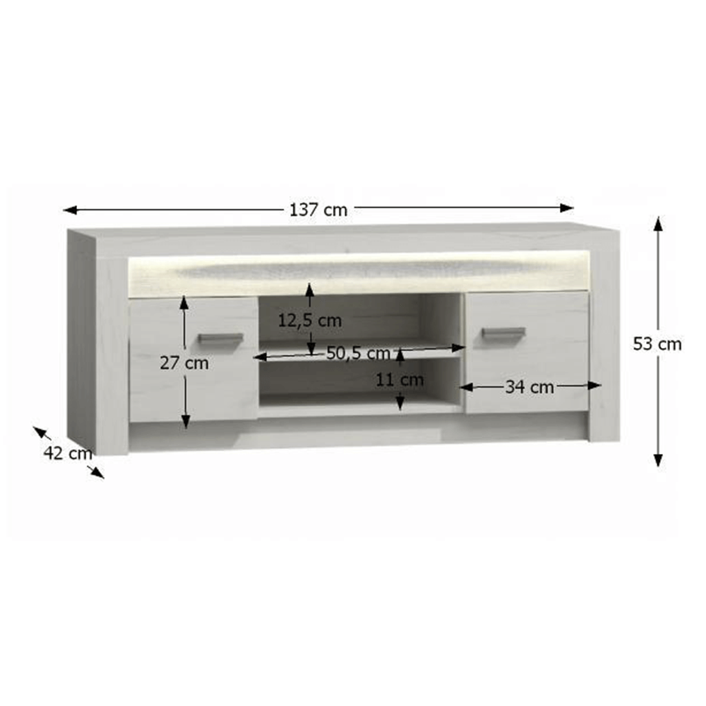 RTV stolík 09 z luxusného sektorového nábytku.Korpus hrubý až 48 mm, hrúbka materiálu zvyšné časti: 16 mm, úchytky kovovéMateriál DTD laminovaná, ABS hrany, farebné prevedenie: jaseň biely Rozmery ŠxHxV: 137x42x53 cm. Možnosť dokúpenia LED osvetlenia v cene 38 eur. Dodávané v demonte.
