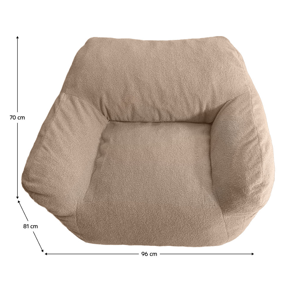 Materiál: látka Bouclé/kompresná penaOderuodolnosť textílie podľa testu Martindale: 45 000 oderovFarba: svetlohnedáRozmery (ŠxHxV): 96x81x70 cmPraktické uško na zadnej stranePríjemný materiálVýplň je zdravotne nezávadnáĽahká údržbaČistenie mydlovou vodou s nízkym phOdporúčame otvoriť penu a nechať ju dosiahnuť svoj objem 24 hodínNosnosť: 90 kg