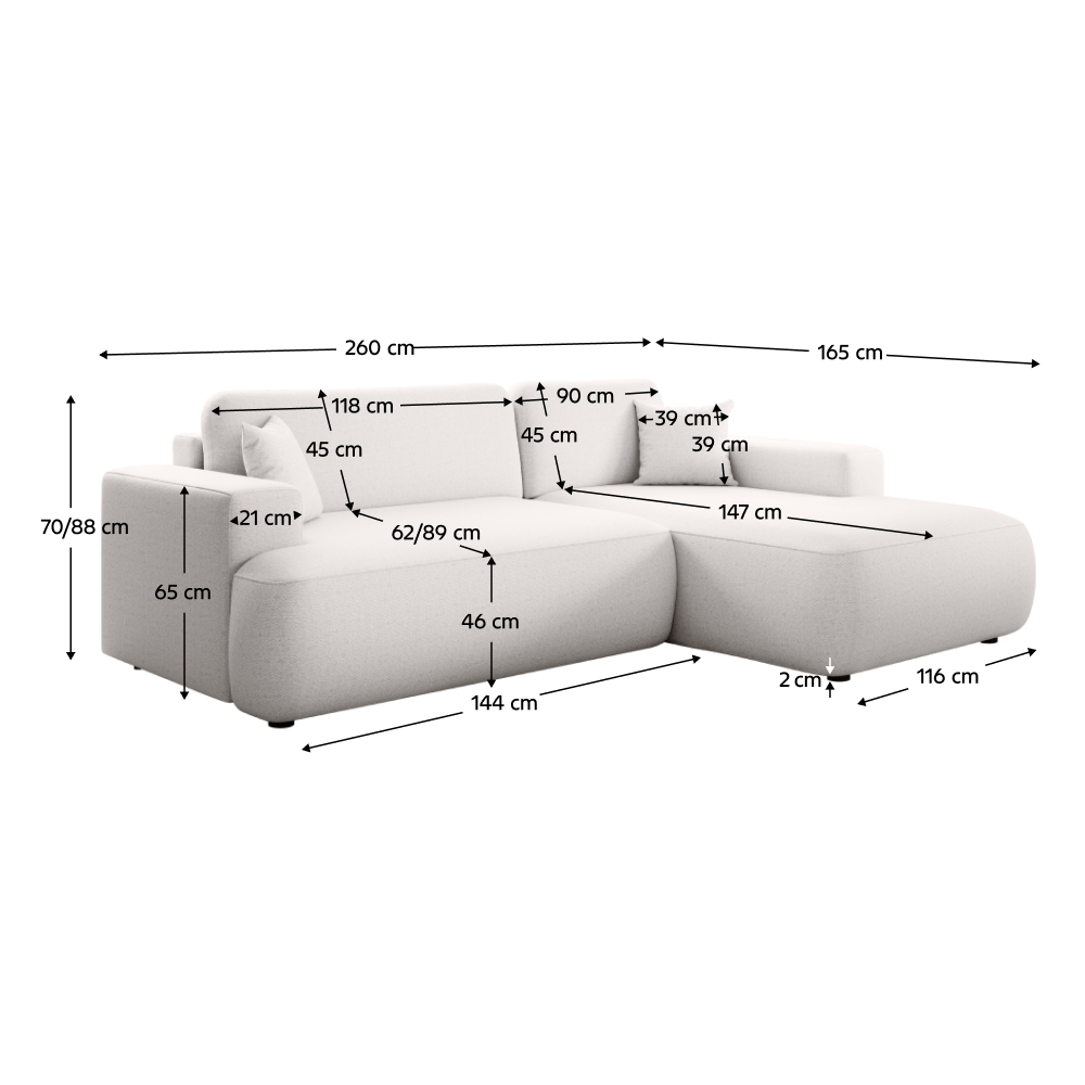 Materiál čalúnenie: látka Lambi 07Oderuodolnosť látky podľa testu Martindale: 50 000 oderovFarba čalúnenie: bielaRozmery (ŠxHxV): 260x165x70/88 cmPlocha na spanie (ŠxD): 130x215 cmVýška sedu: 46 cmHĺbka sedu: 62/89 cmRozmery opierky na ruku (ŠxV): 21x65 cmRozmery otomanu (ŠxH): 116x147 cmŠírka sedacej časti: 144 cmVýška spodného priestoru od podlahy: 2 cmNa nožičkáchMateriál nožičiek: plastVýplň: bonelová pružina/HR penaRozkladaciaRohováCeločalúnenáPravé prevedenieDodávané s dekoratívnymi vankúšikmiS úložným priestoromDodávané v demonteMožnosť objednania v 6 farebných odtieňoch látky Lambi v cene 999 Eur s dodacou lehotou 6-8 týždňov. Pri individuálnej objednávke je potrebné zaplatiť 10% zálohu z danej sumy. Po uhradení zálohy bude Vaša požiadavka zadaná do výroby.