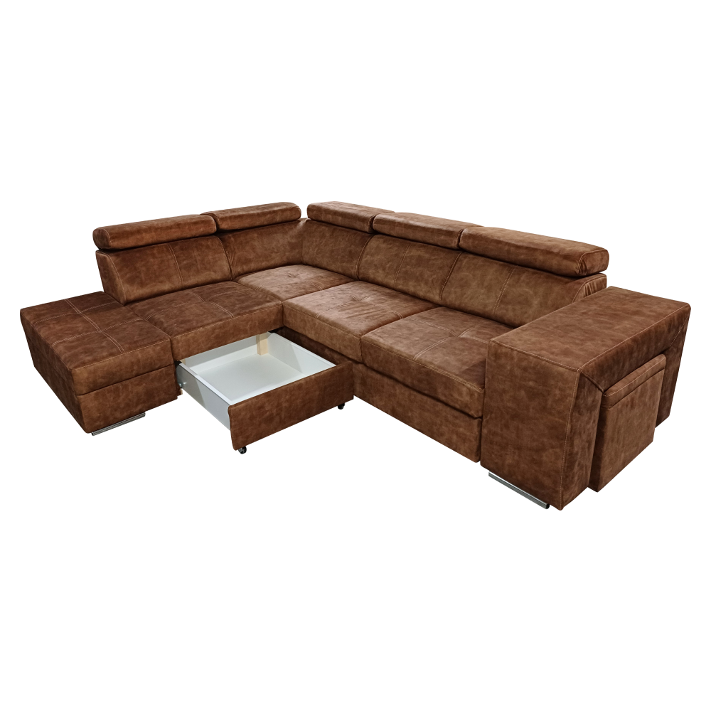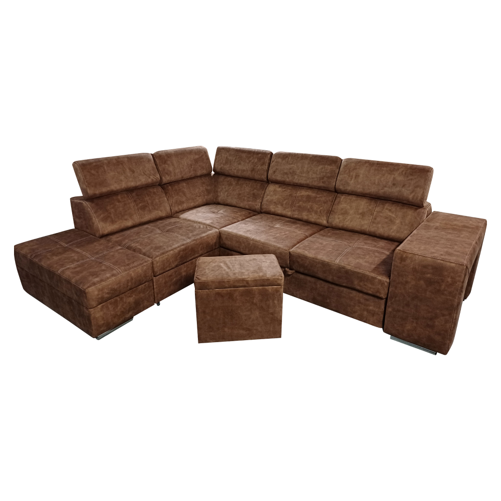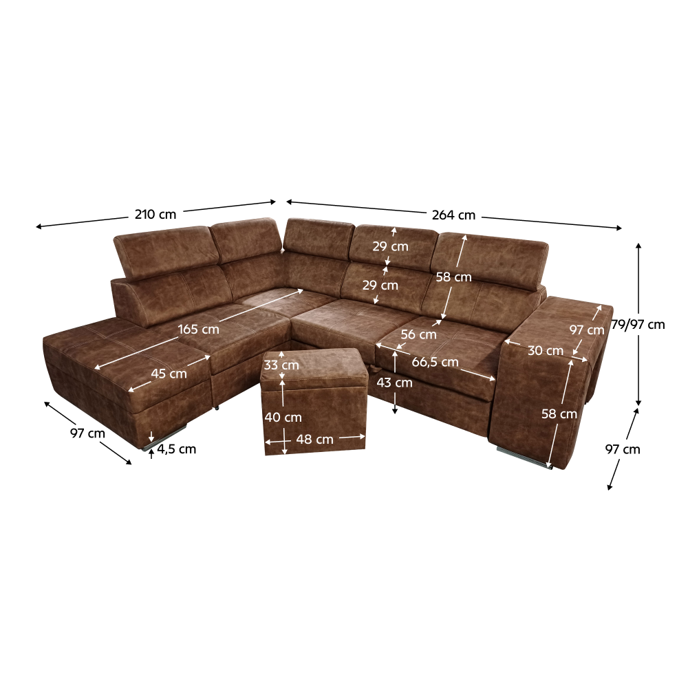 Materiál čalúnenia: látka Country 8Oderuodolnosť textílie podľa testu Martindale: 65 000 oderovFarba: hnedáMateriál konštrukcie: borovicové drevo/bukové drevo/laminátová doskaRozmery (ŠxHxV): 264x210x79/97 cmPlocha na spanie (ŠxD): 130x190 cmVýška sedu: 43 cmHĺbka sedu: 56 cmRozmery otomanu (ŠxH): 97x165 cmRozmery opierky na ruku (ŠxHxV): 30x97x58 cmS taburetomRozmery taburetu (ŠxHxV): 40x33x48 cmCeločalúnenáRozkladaciaRohováS úložným priestoromĽavé prevedenieNa nožičkáchFarba nožičiek: chrómováVýška spodného priestoru od podlahy: 4,5 cmPolohovacie opierky hlavy5 stupňové polohovanie opierokVýplň: pružina falista/pur pena/molitanDodávané v demonteMožnosť objednania v 8 farebných odtieňoch látky Country v cene 1 329 Eur s dodacou lehotou 6-8 týždňov. Pri individuálnej objednávke je potrebné zaplatiť 20% zálohu z danej sumy. Po uhradení zálohy bude Vaša požiadavka zadaná do výroby.