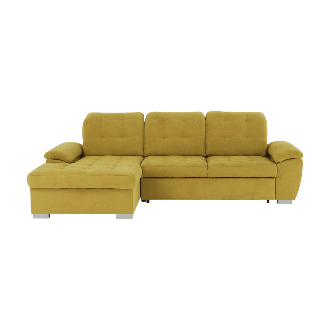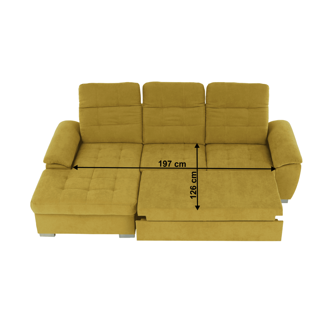 Rohová celočalúnená rozkladacia sedacia súprava s úložným priestorom EVANGELINMateriál: látka SORO 40Oderuodolnosť textílie podľa testu Martindale: 90 000 - 100 000 oderovFarba: horčicováRozmery (ŠxHxV): 258x164x102/86 cmPlocha na spanie (ŠxD): 197x126 cmVýška spodného priestoru od podlahy: 5,5 cmVýška sedu: 41 cmHĺbka sedu: 56 cmDĺžka pohovky s opierkou: 184 cmBez operadla: 172cmŠírka bez boku: 68,5 cmŠírka otomanov : 96,5 cm (spolu s bokom )Nosnosť na osobu: 90 kgPolohovacie opierky hlavy6 stupňové polohovanieĽavé prevedenie.Dodávané bez dekoratívnych vankúšovPolohovacie opierky hlavy.Dodávané v demonte.