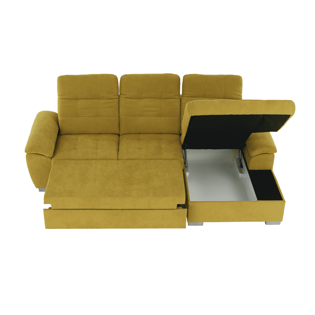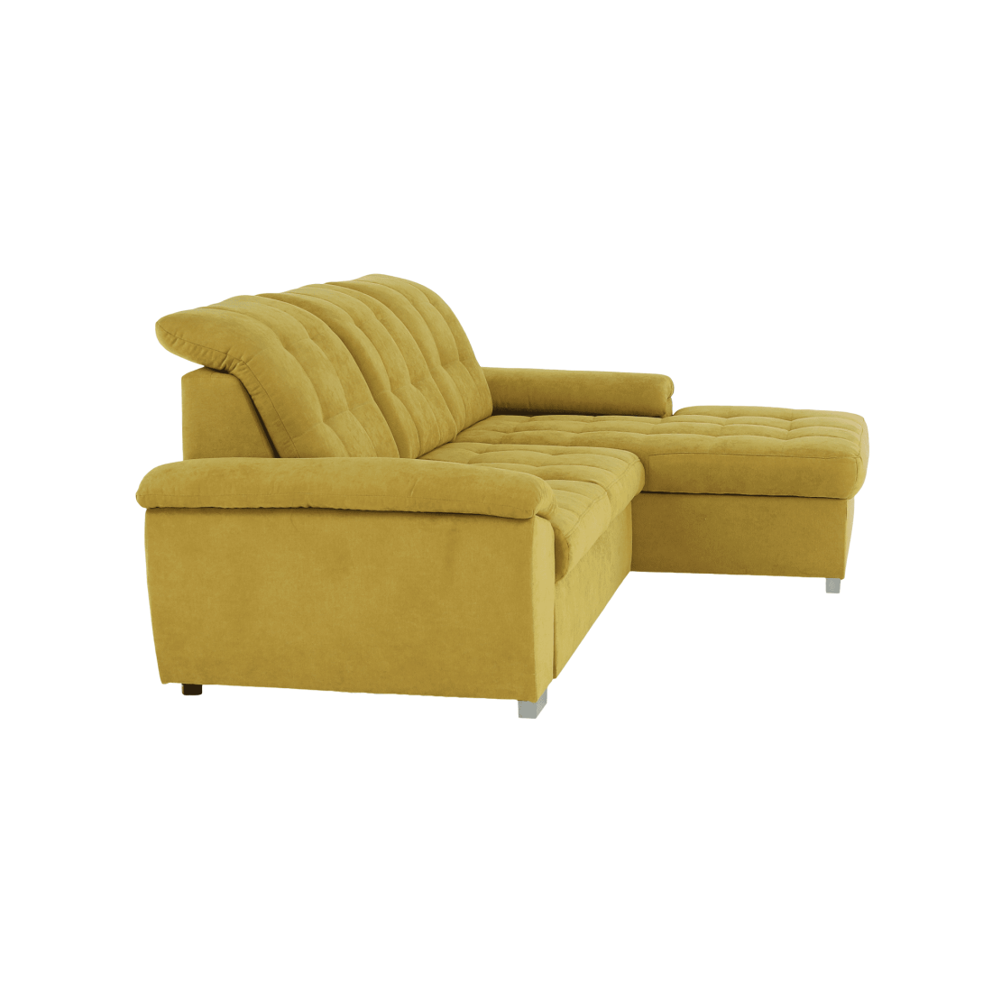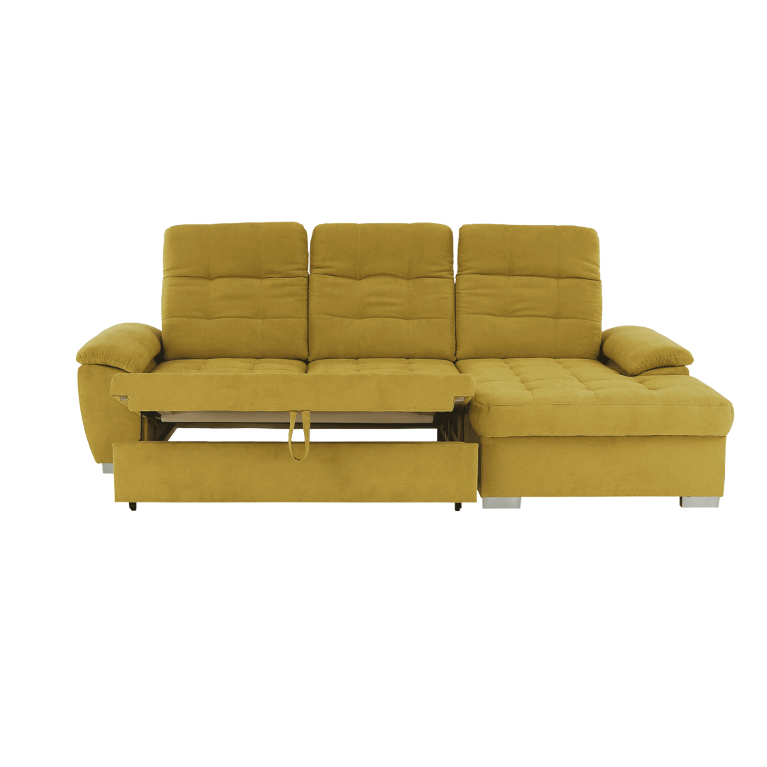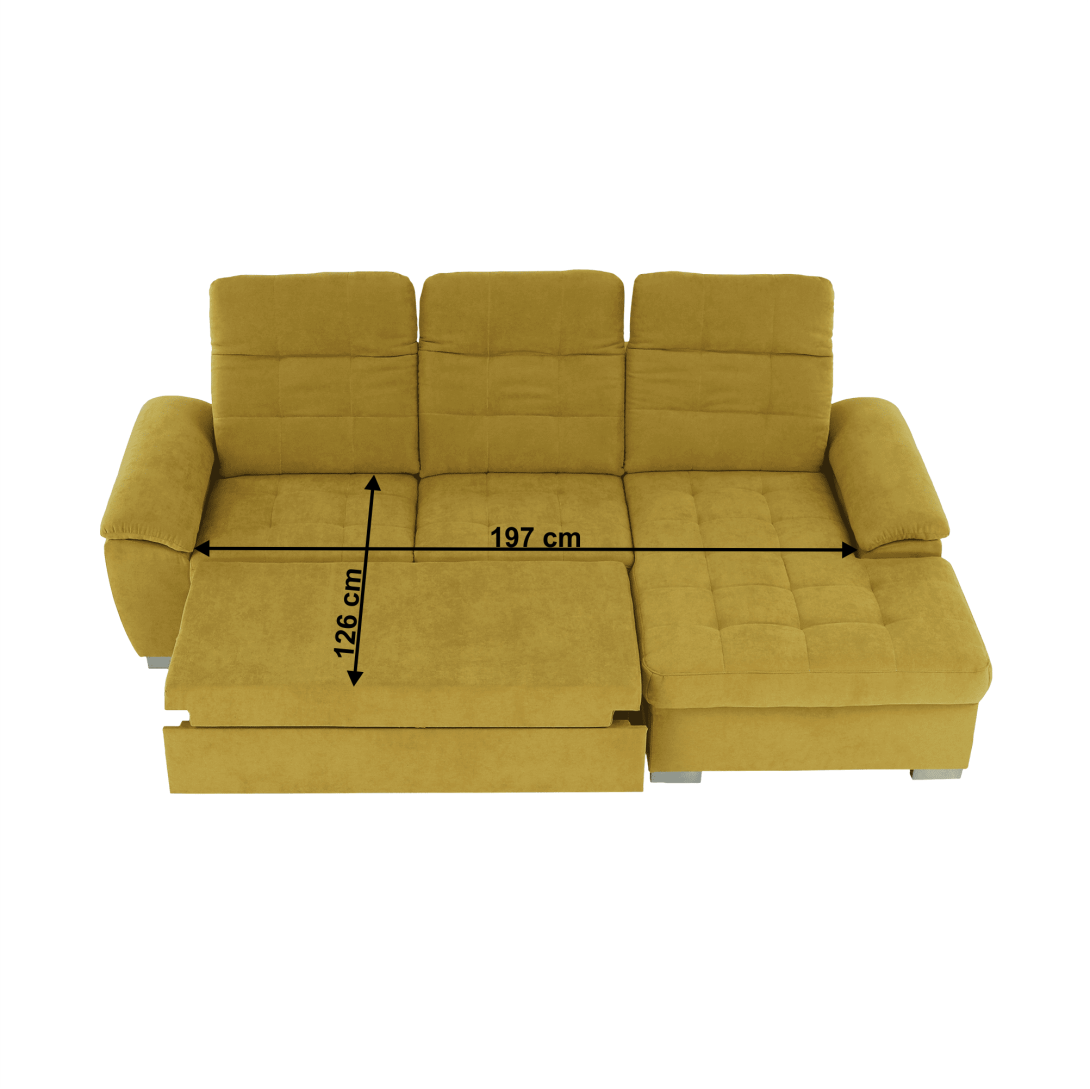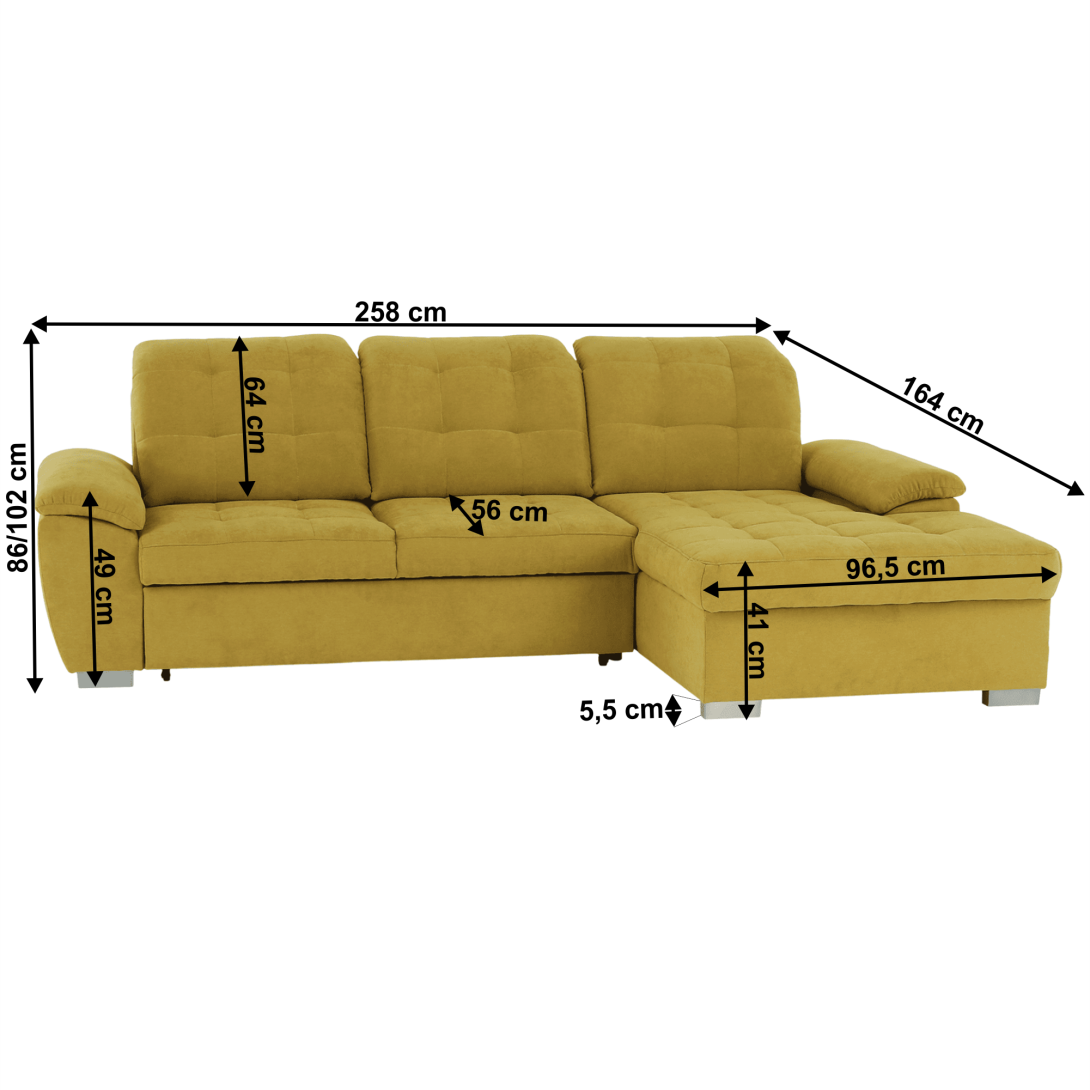 Rohová celočalúnená rozkladacia sedacia súprava s úložným priestorom EVANGELINMateriál: látka Soro 40Oderuodolnosť textílie podľa testu Martindale: 90 000 - 100 000 oderovFarba: horčicováRozmery (ŠxHxV): 258x164x102/86 cmPlocha na spanie (ŠxD): 197x126 cmVýška spodného priestoru od podlahy: 5,5 cmVýška sedu: 41 cmHĺbka sedu: 56 cmDĺžka pohovky s opierkou: 184 cmBez operadla: 172cmŠírka bez boku: 68,5 cmŠírka otomanov: 96,5 cm (spolu s bokom )Nosnosť na osobu: 90 kgPolohovacie opierky hlavy6 stupňové polohovaniePravé prevedenie.Dodávané bez dekoratívnych vankúšovPolohovacie opierky hlavy.Dodávané v demonte.