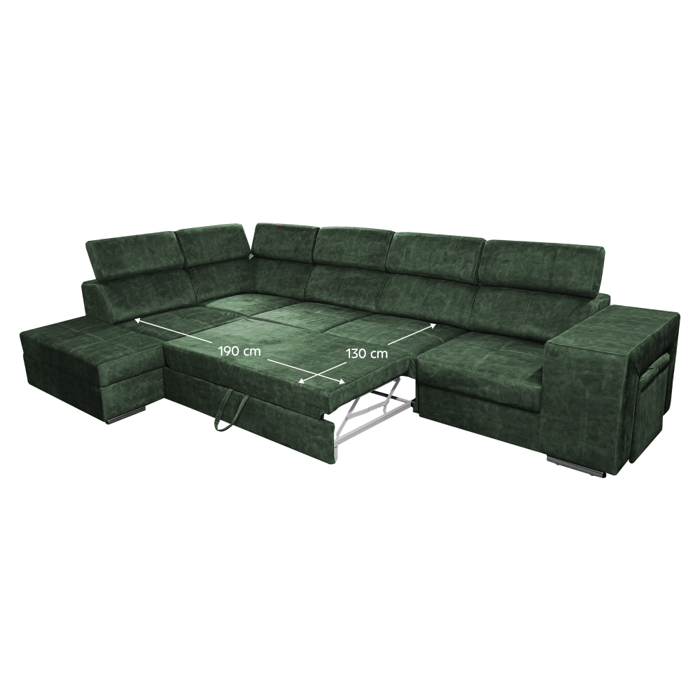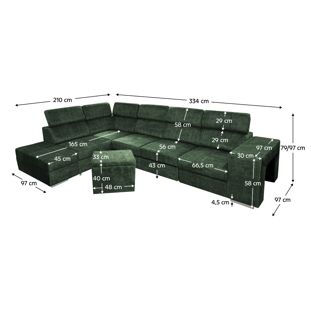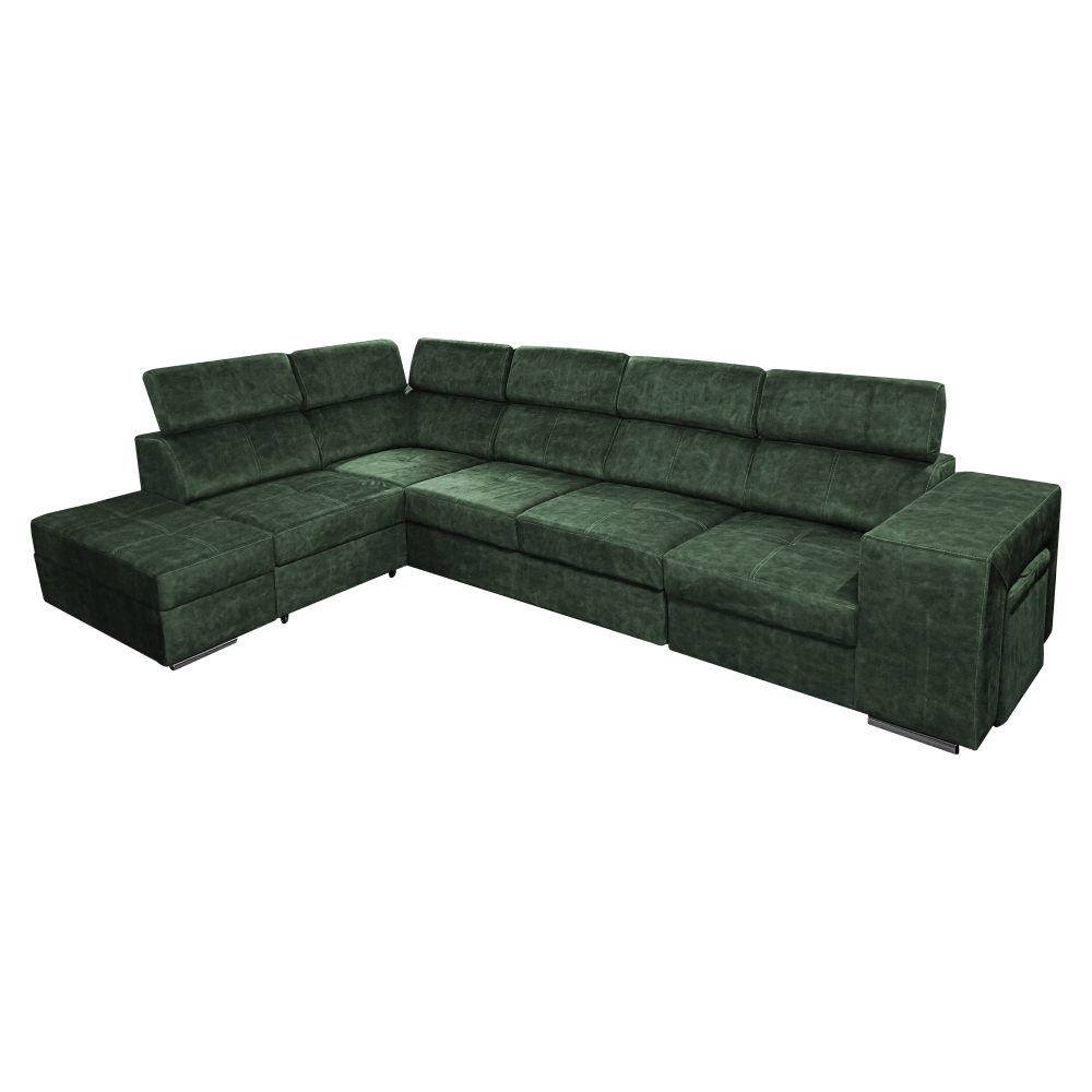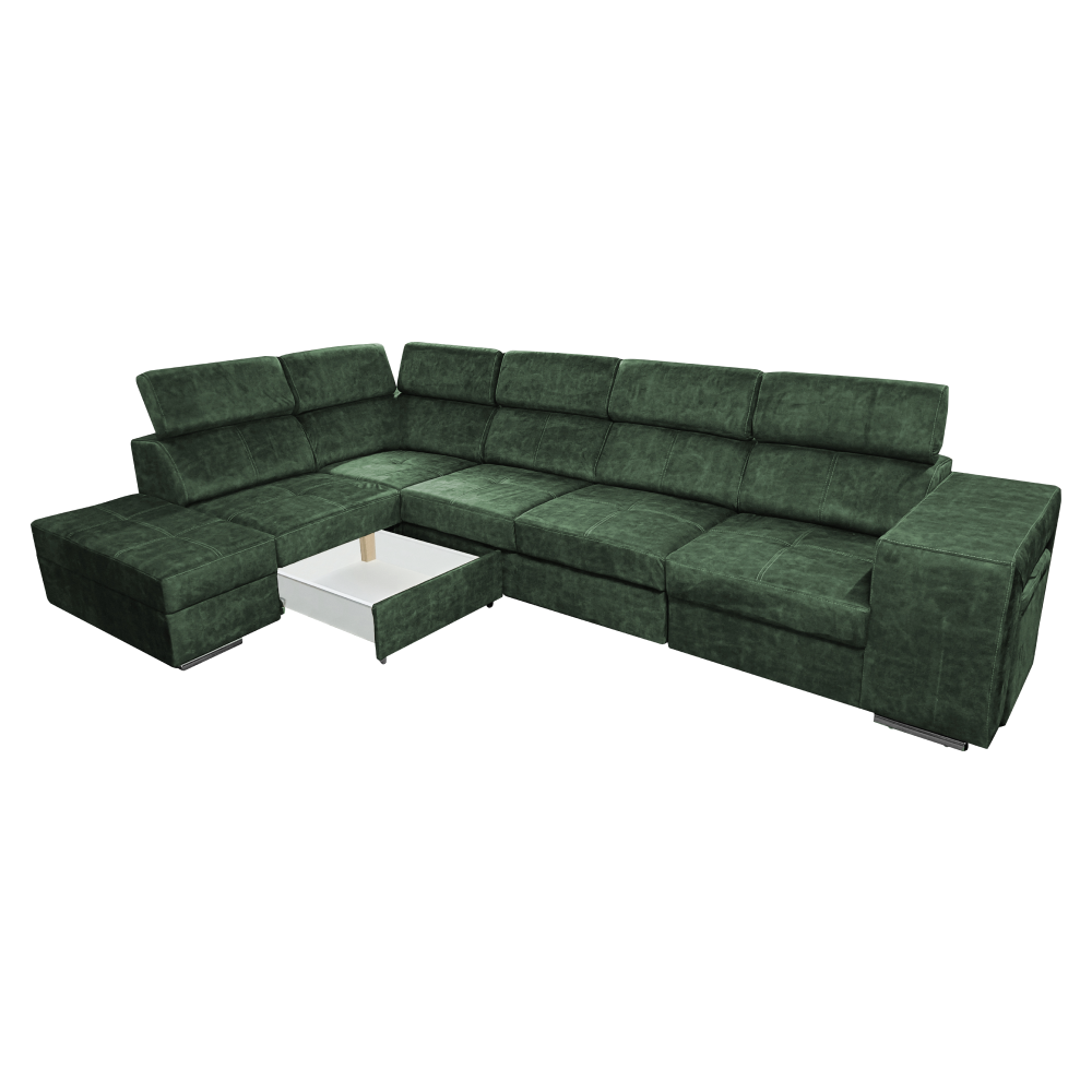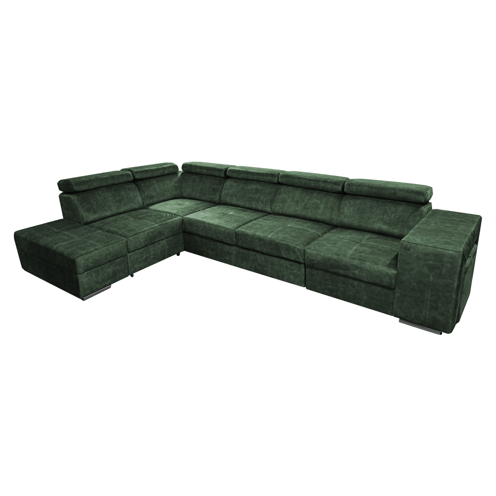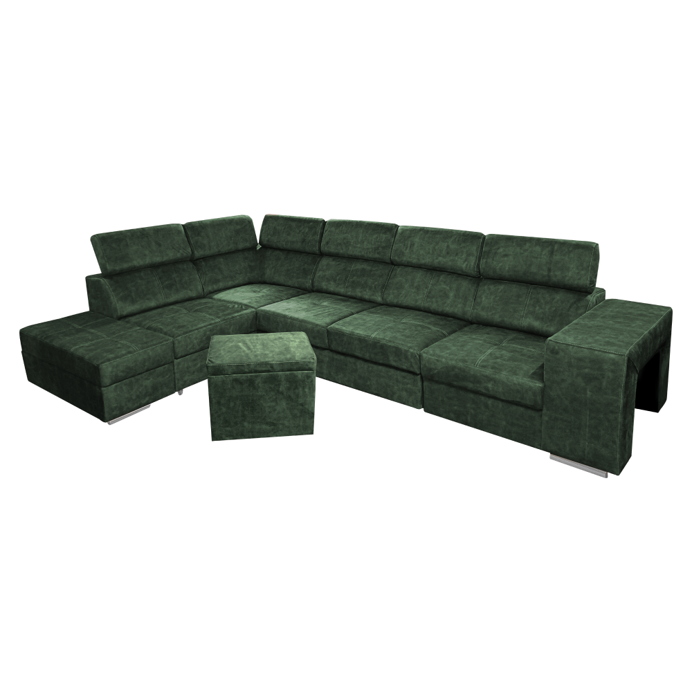Materiál čalúnenia: látka Country 11Oderuodolnosť textílie podľa testu Martindale: 65 000 oderovFarba: smaragdováMateriál konštrukcie: borovicové drevo/bukové drevo/laminátová doskaRozmery (ŠxHxV): 334x210x79/97 cmPlocha na spanie (ŠxD): 130x190 cmVýška sedu: 43 cmHĺbka sedu: 56 cmRozmery otomanu (ŠxH): 97x165 cmRozmery opierky na ruku (ŠxHxV): 30x97x58 cmS taburetomRozmery taburetu (ŠxHxV): 40x33x48 cmCeločalúnenáRozkladaciaRohováS úložným priestoromĽavé prevedenieNa nožičkáchFarba nožičiek: chrómováVýška spodného priestoru od podlahy: 4,5 cmPolohovacie opierky hlavy5 stupňové polohovanie opierokVýplň: pružina falista/pur pena/molitanDodávané v demonteMožnosť objednania v 8 farebných odtieňoch látky Country v cene 1 455 Eur s dodacou lehotou 6-8 týždňov. Pri individuálnej objednávke je potrebné zaplatiť 20% zálohu z danej sumy. Po uhradení zálohy bude Vaša požiadavka zadaná do výroby.