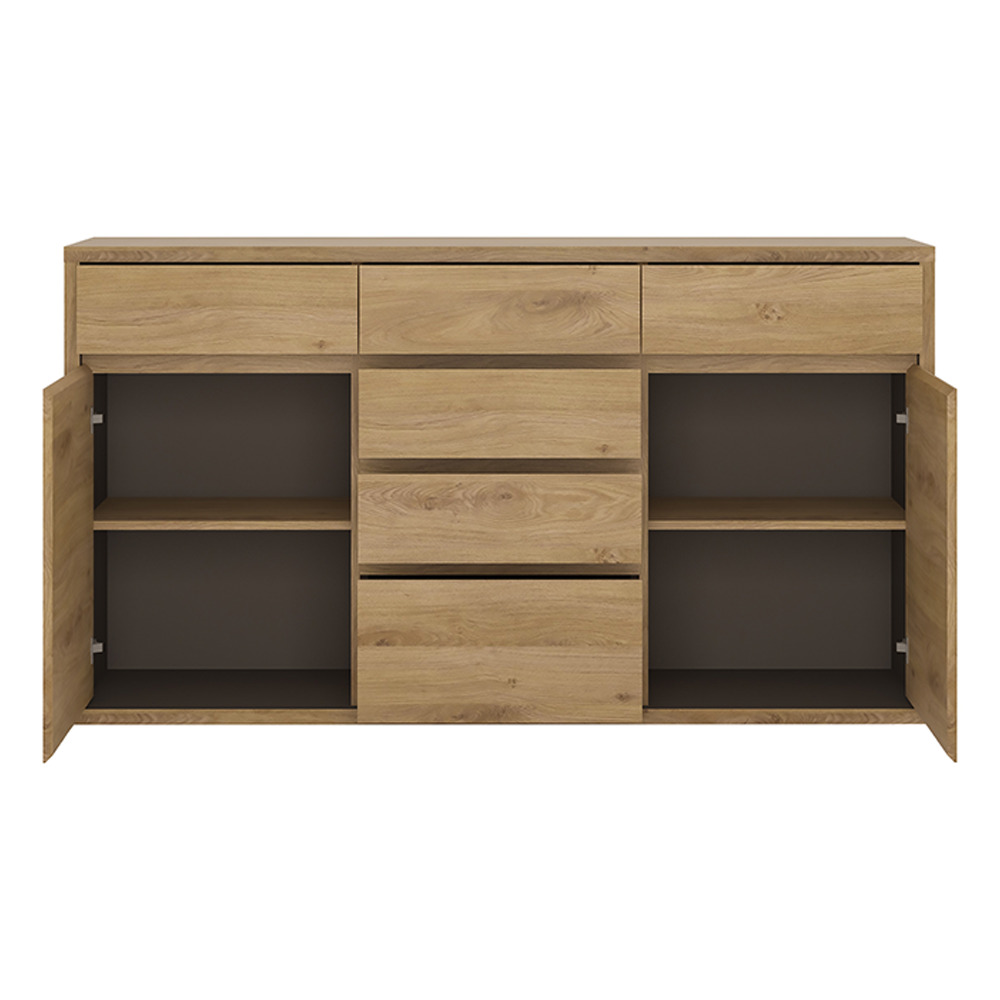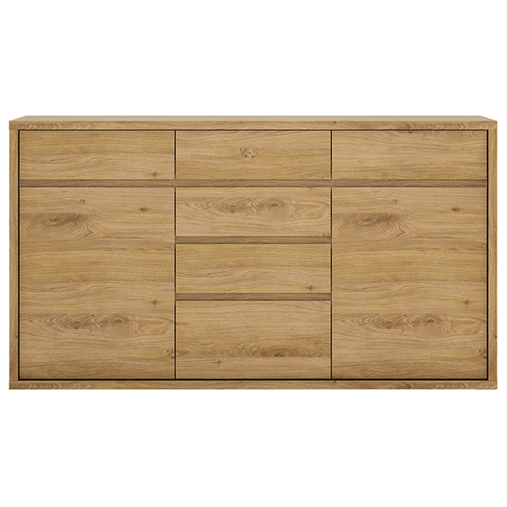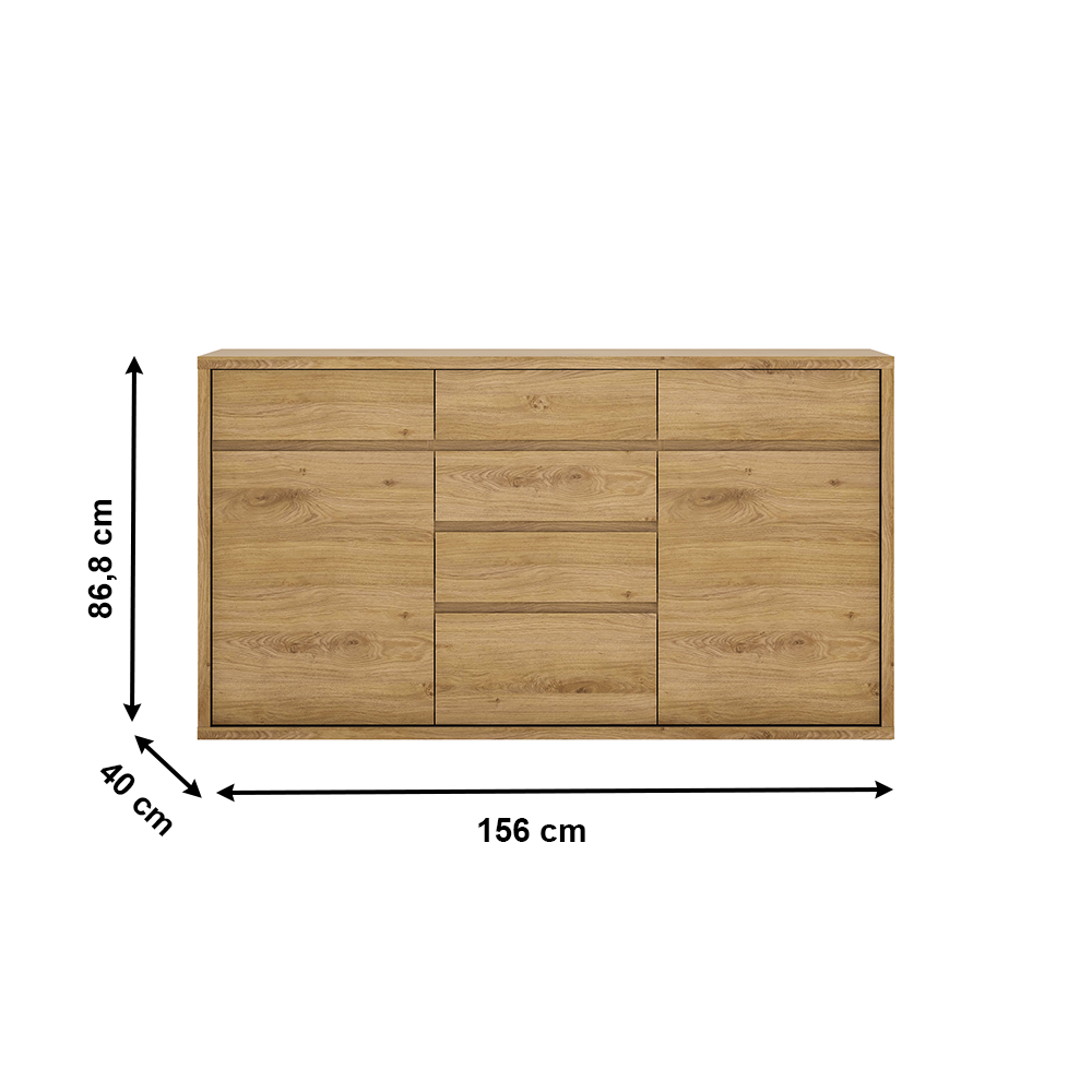 Materiál: laminovaná DTDFarebné prevedenie: dub Shetland/siváRozmery (ŠxHxV): 156x40x86,8 cmHrúbka korpusu: 2,8 cmBez úchytkováJednoduchá a elegantnáHrubý korpus6 šuplíkov2 poličky2 jednodverové skrinkyModerný štýlVysoká kvalitaPrecízne spracovanieOdolná voči poškriabaniu, UV žiareniu, vysokým teplotámNosnosť poličky: 5 kgNosnosť šuplíka: 5 kgDodávané v demonte