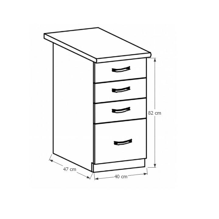 Spodná skrinka D40S4 je s tromi plytšími a jedným hlbším šuplíkom. Šuplíky sa otvárajú pomocou plastovej úchytky. Rustikálne pôsobiace lišty sú z kvalitnej MDF.