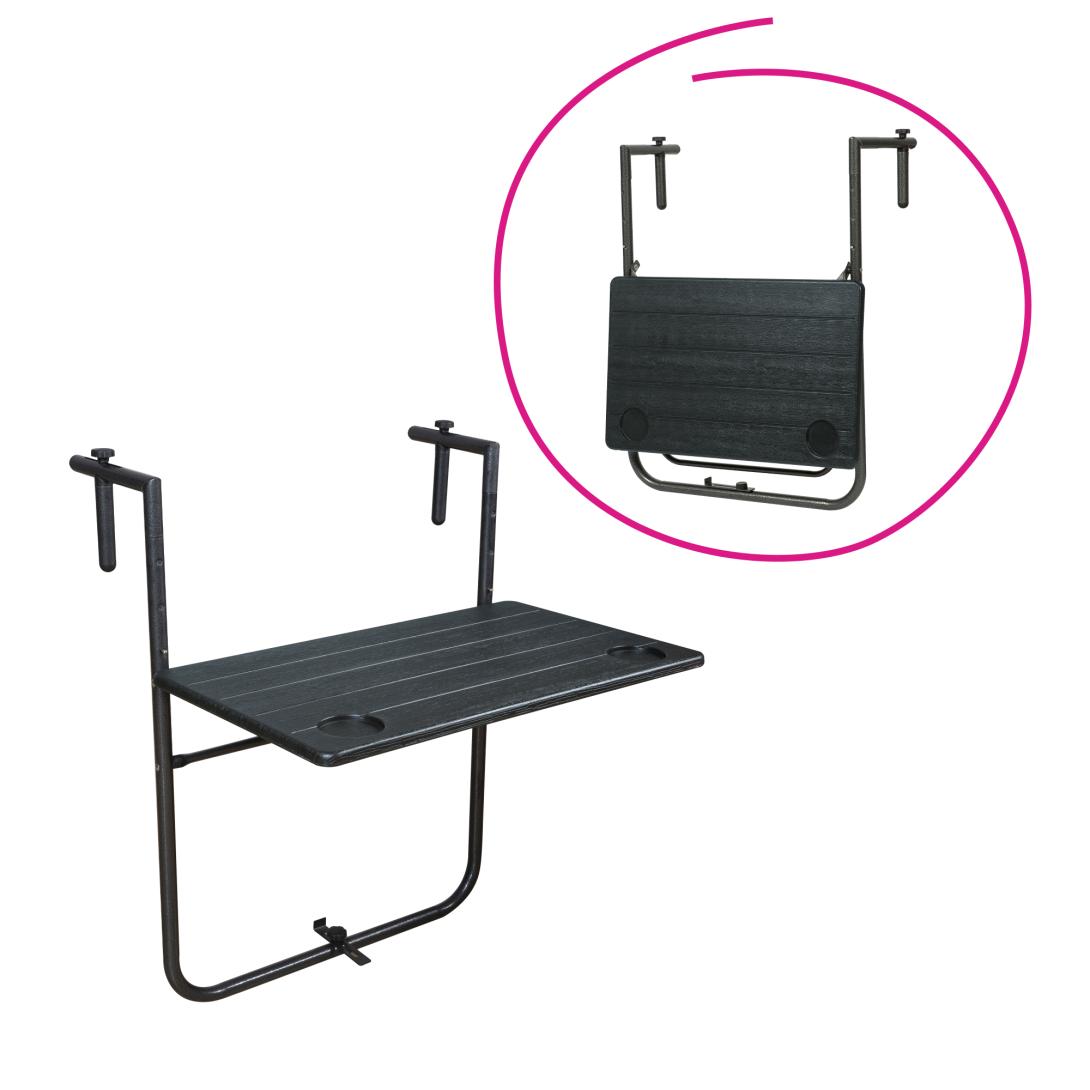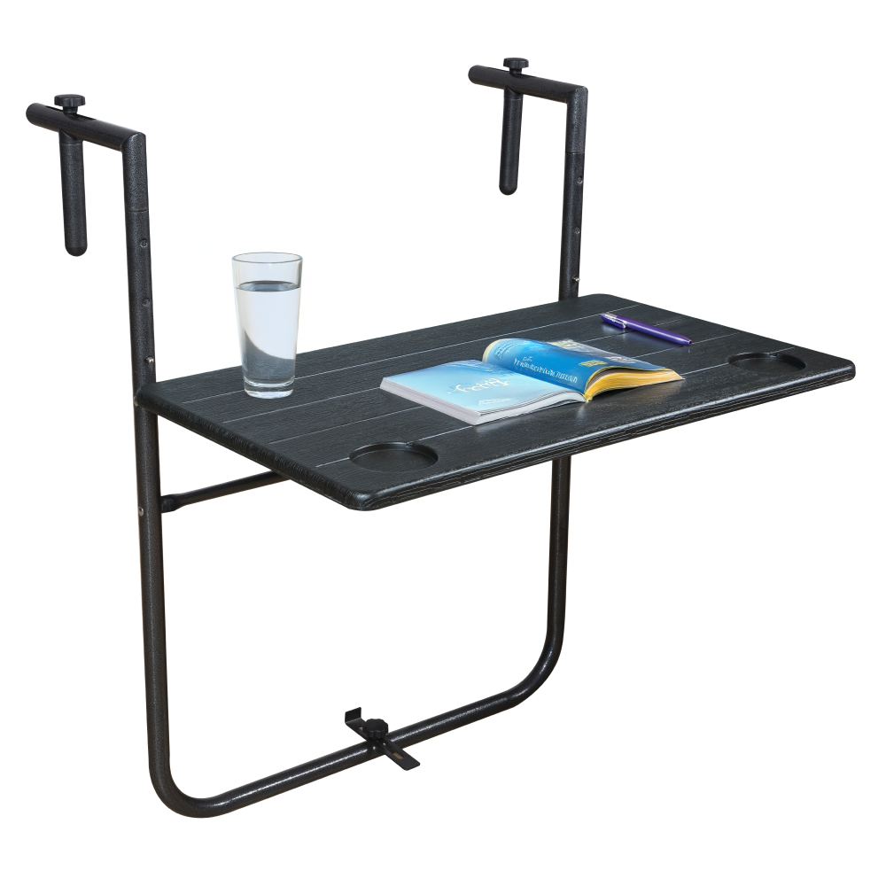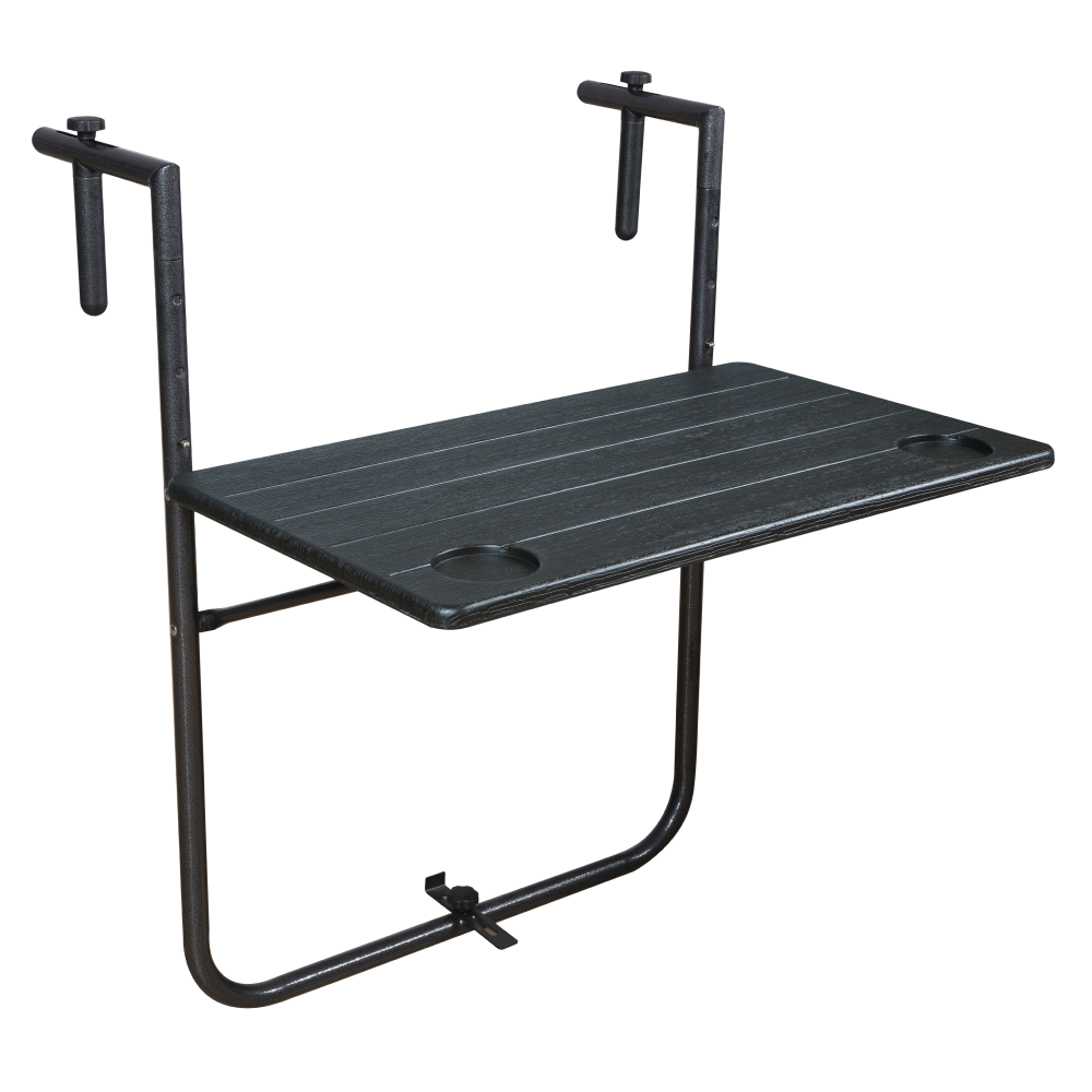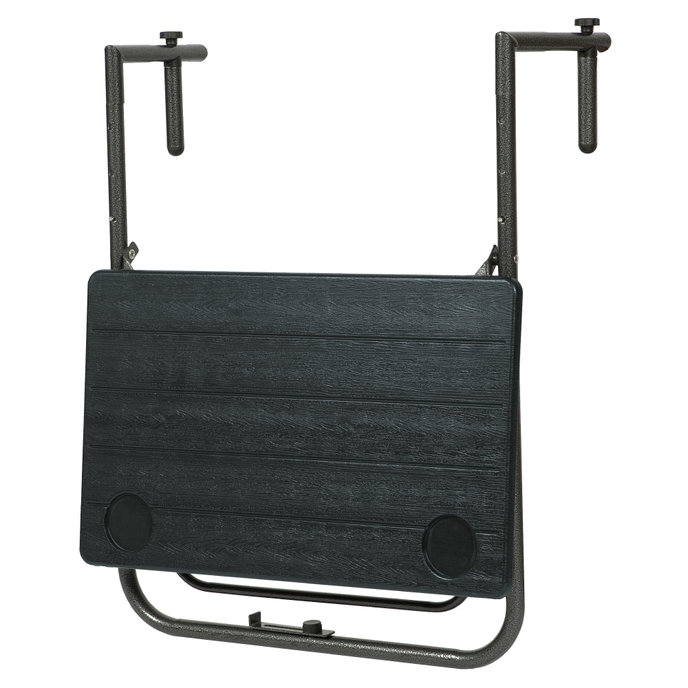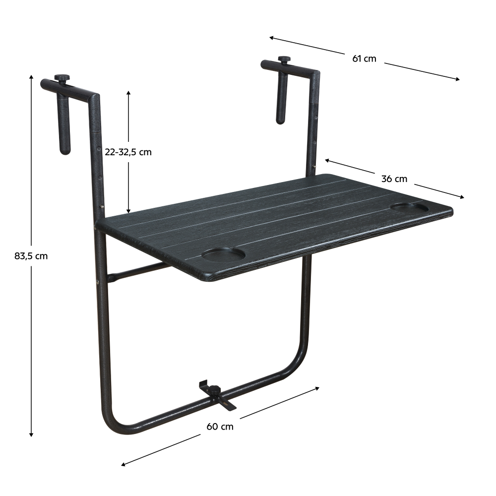 Materiál: oceľ/plastRozmery (ŠxHxV): 60x61x83,5 cmFarba: čiernaRozmery stolovej dosky (ŠxH): 60x36 cmHrúbka stolovej dosky: 3,7 cmHrúbka konštrukcie: 1,2 - 2,2 cmSkladacíÚspora miestaRozmery v zloženom stave (ŠxHxV): 60x22x83,5 cmOdporúčaná šírka zábradlia: 6,4 - 14,5 cmVýškovo nastaviteľnýNosnosť: 50 kg2 držiaky na poháreVhodný na balkóny, terasy alebo miesta s obmedzeným priestoromDodávané v demonte