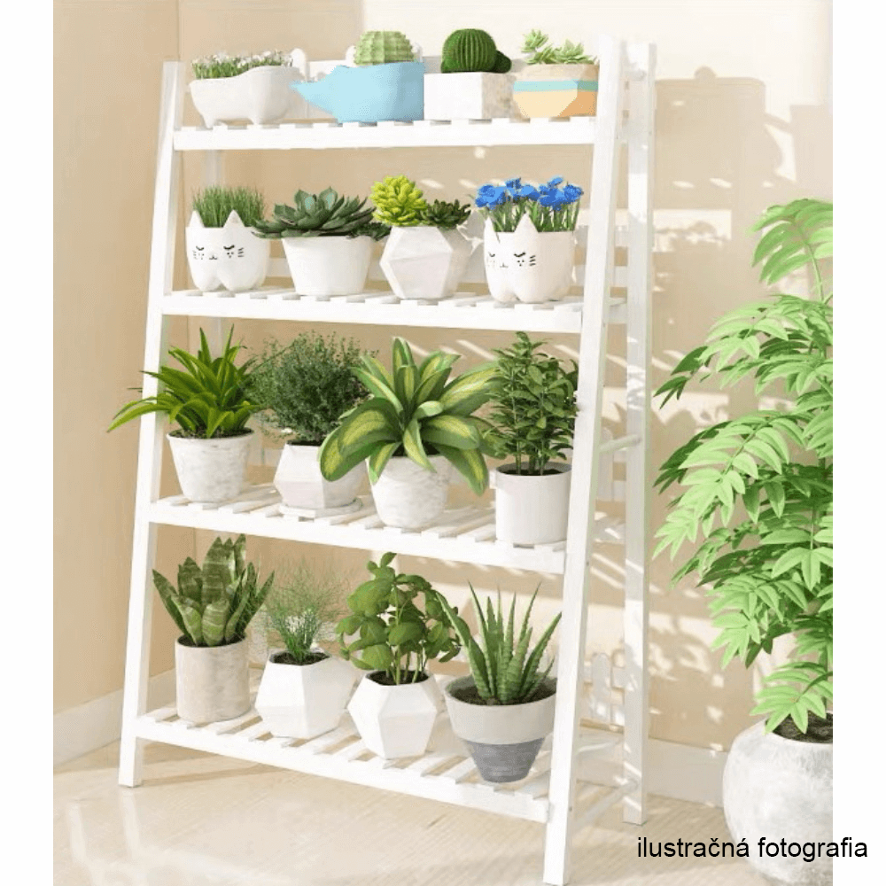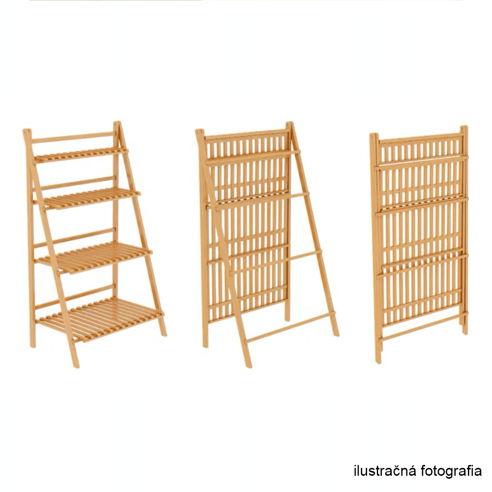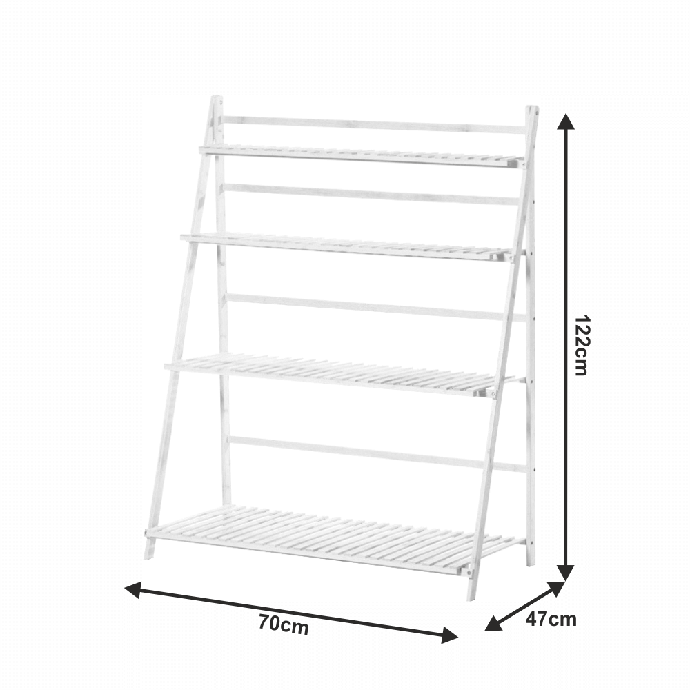 Materiál: bambusFarba: bielaRozmery (ŠxHxV): 70x47x122 cmNosnosť na policu: 10 kgŠtyri policeHĺbka vrchnej police: 14 cmHĺbka 2. police: 23 cmHĺbka 3. police: 33 cmHĺbka spodnej police: 43 cmSkladacíZložený nezaberie veľa miestaJeden pár rukavíc grátisVhodný do interiéru aj exteriéruSet ručného záhradného náradia grátisDodávané v demonte
