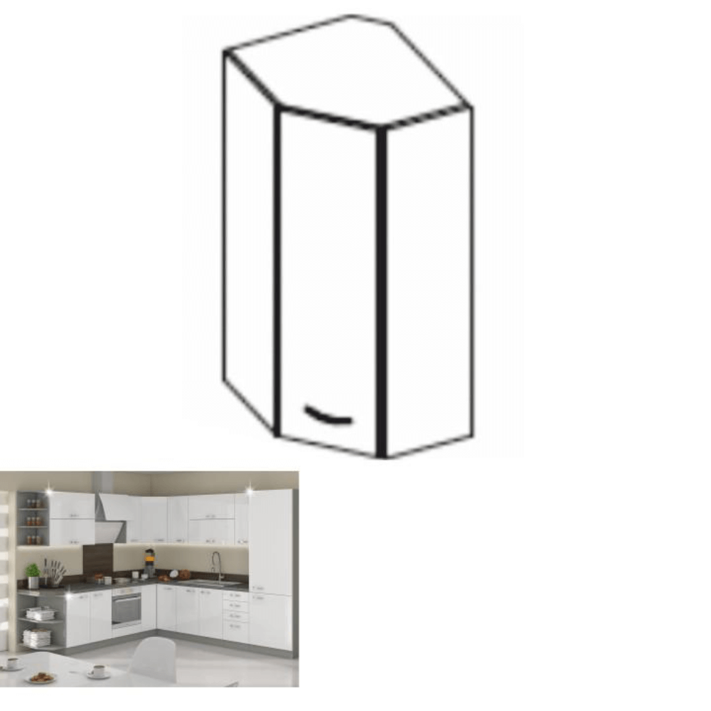 Horná skrinka, Materiál: DTD laminovaná, Prevedenie: biela vysoký lesk, Rozmery ŠxVxH: 59/59x71,5x31 cm. Dodávané v demonte.Sektorové skrinky sú dodávané bez pracovnej dosky vrátane spodnej lišty. Možnosť dokúpiť PD metalic brown v cene 55 Eur/1m. Možnosť dokúpiť univerzálny Ľ/P drez LAY ON.