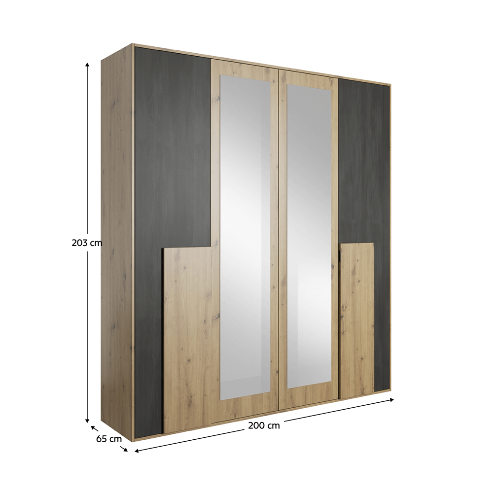 Materiál: DTD laminovaná/ABS hranyFarba: dub artisanSkriňaRozmery (ŠxHxV): 200x65x203 cmŠtvordverováS dvomi zrkadlami na prostredných dverách2x vešiaková časť2x policová časťPosteľRozmery (ŠxHxV): 170x205x100 cmPlocha na spanie: 160x200 cmHrúbka materiálu: 16 mmPosteľ dodávaná bez roštu a bez matracaOdporúčaný rošt v pevnom ráme s rozmerom 160x200 cmNočný stolíkRozmery (ŠxHxV): 54x40x40 cm2 zásuvkyMožnosť dokúpiť komodu a zrkadlo BAFRADodávané v demonte