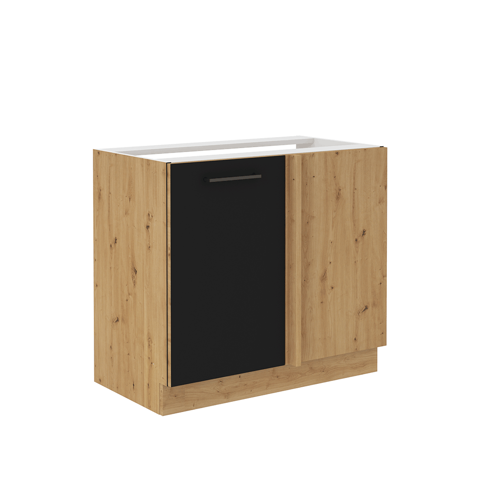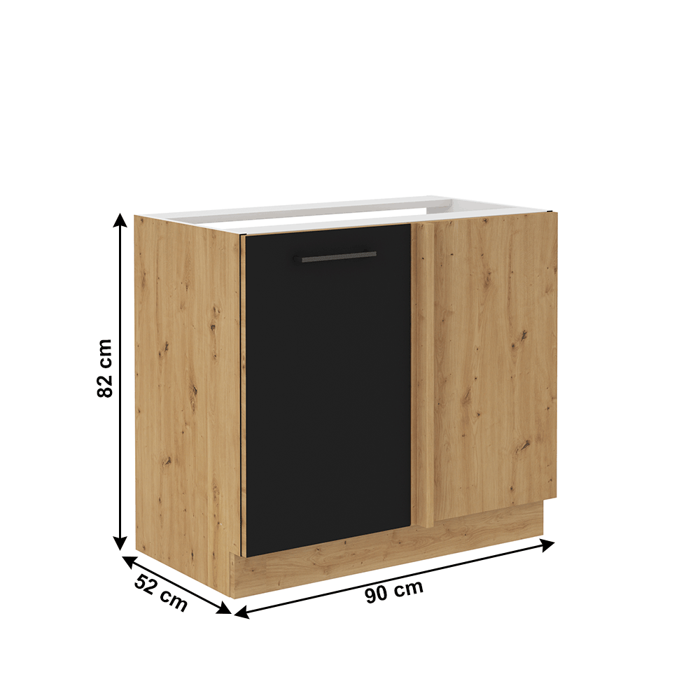 Materiál: laminovaná DTDFarba: čierny mat/dub artisanRozmery (ŠxHxV): 90x52x82 cmSkrinka určená do rohu rohovej kuchynskej linkySkrinku je potrebné inštalovať 15cm od stenyPo správnom osadení skrinky do linky je jej šírka sprava doľava vrátane pracovnej dosky 105cmHrúbka materiálu: 1,6 cm1 dvierkaS úchytkouÚchytka: 19,2 cmTichý doraz dvierokVnútro skrinky je bieleS dolnou lištou/soklomBez pracovnej doskyPracovnú dosku dub artisan s hrúbkou 3,8cm je možné doobjednať za cenu 65 EURDvierka viete namontovať z pravej alebo ľavej stranyModerný dynamický dizajnDodávané v demonteMožnosť dokúpiť univerzálny drez LAY ON.