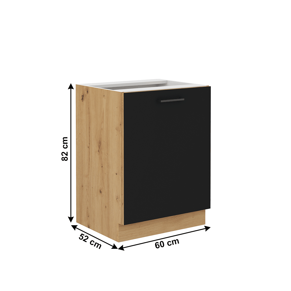 Materiál: laminovaná DTDFarba: čierny mat/dub artisanRozmery (ŠxHxV): 60x52x82 cmHrúbka materiálu: 1,6 cmJednodverováS úchytkouÚchytka: 19,2 cmTichý doraz dvierokVnútro skrinky je bieleS dolnou lištou/soklomBez pracovnej doskyPracovnú dosku dub artisan s hrúbkou 3,8cm je možné doobjednať za cenu 65 EURModerný dynamický dizajnDodávané v demonteMožnosť dokúpiť univerzálny drez LAY ON.