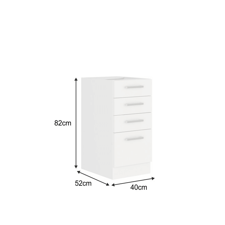 Spodná skrinka Split 40 D 4S BBMateriál: DTD laminovanáFarba: bielaRozmery (ŠxHxV): 40x52x82 cmDodávané v demonteSpodné skrinky sú dodávané vrátane dolnej lišty. Pracovná doska nie je súčasťou skriniek. Je možné si doobjednať pracovnú dosku v prevedení dub lancelot za 55 eur/bm. Možnosť dokúpenia univerzálneho Ľ/P drezu LAY ON.