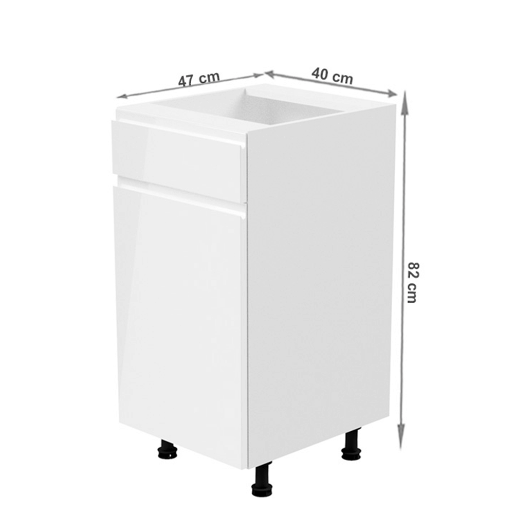 Spodná skrinka, Aurora D40S1Prevedenie: DTD laminová/MDFFarba: biela/biela extra vysoký leskRozmery (ŠxHxV): 40x47x82 cmHrúbka materiálu: 15 mmJe nutné objednať potrebný počet ukončení spodnej lištySystém tichého zatvárania dvierokPracovná doska nie je súčasťou skriniek. Je možné si doobjednať pracovnú dosku v prevedení dub artisan s hrúbkou 38 mm za 56 eur/bm. Možnosť dokúpiť drez LAY ON. Spodné skrinky sú dodávané vrátane dolnej lišty, avšak presný rozmer, ktorý potrebujete, je potrebné uviesť do poznámky v objednávke. Ak rozmer neuvediete, môže sa stať, že vám sokel nebude dodaný. Ku každej dolnej skrinke, okrem D25PZ, je potrebné doobjednať 2 ks úchytok na sokel - cena 1Eur/2ks.