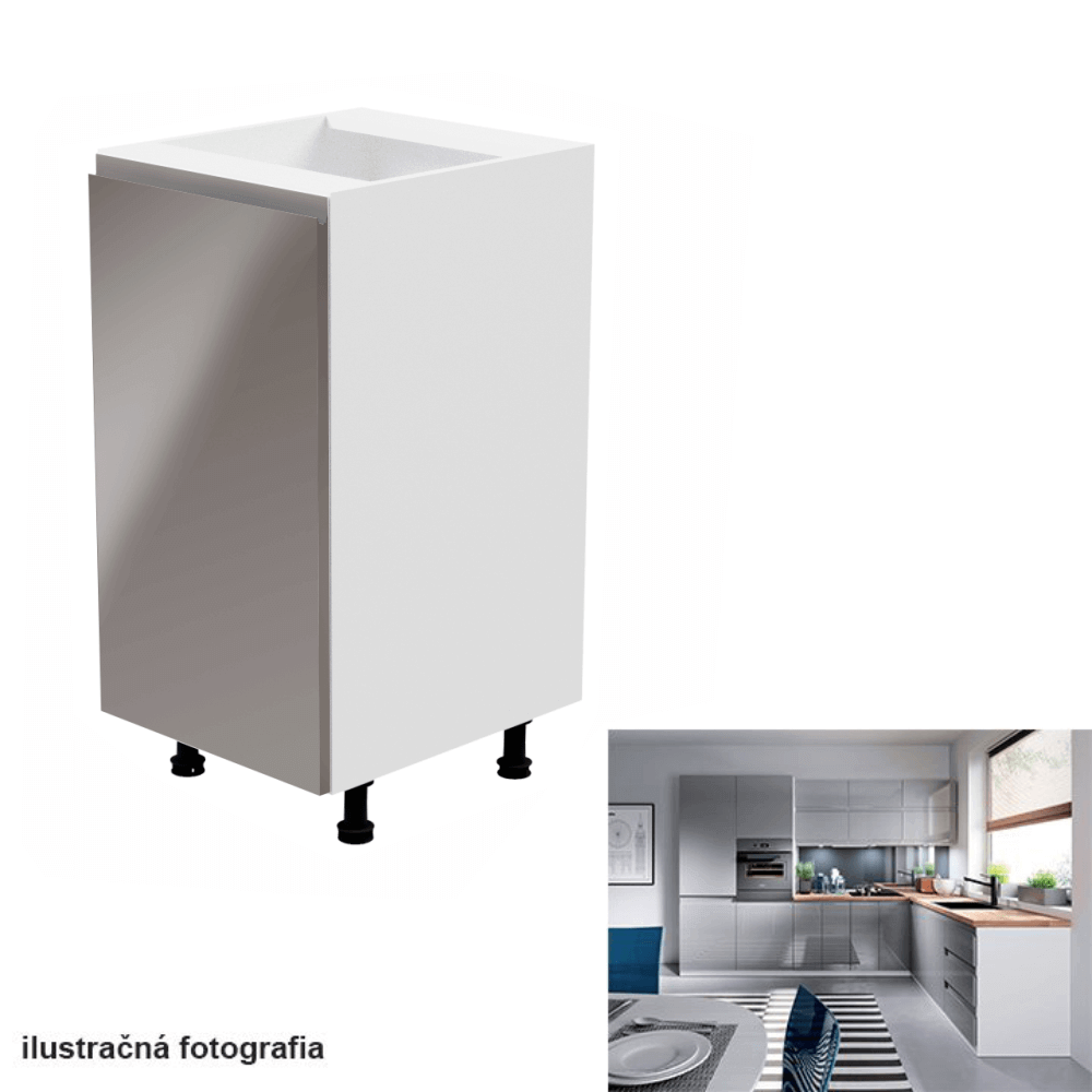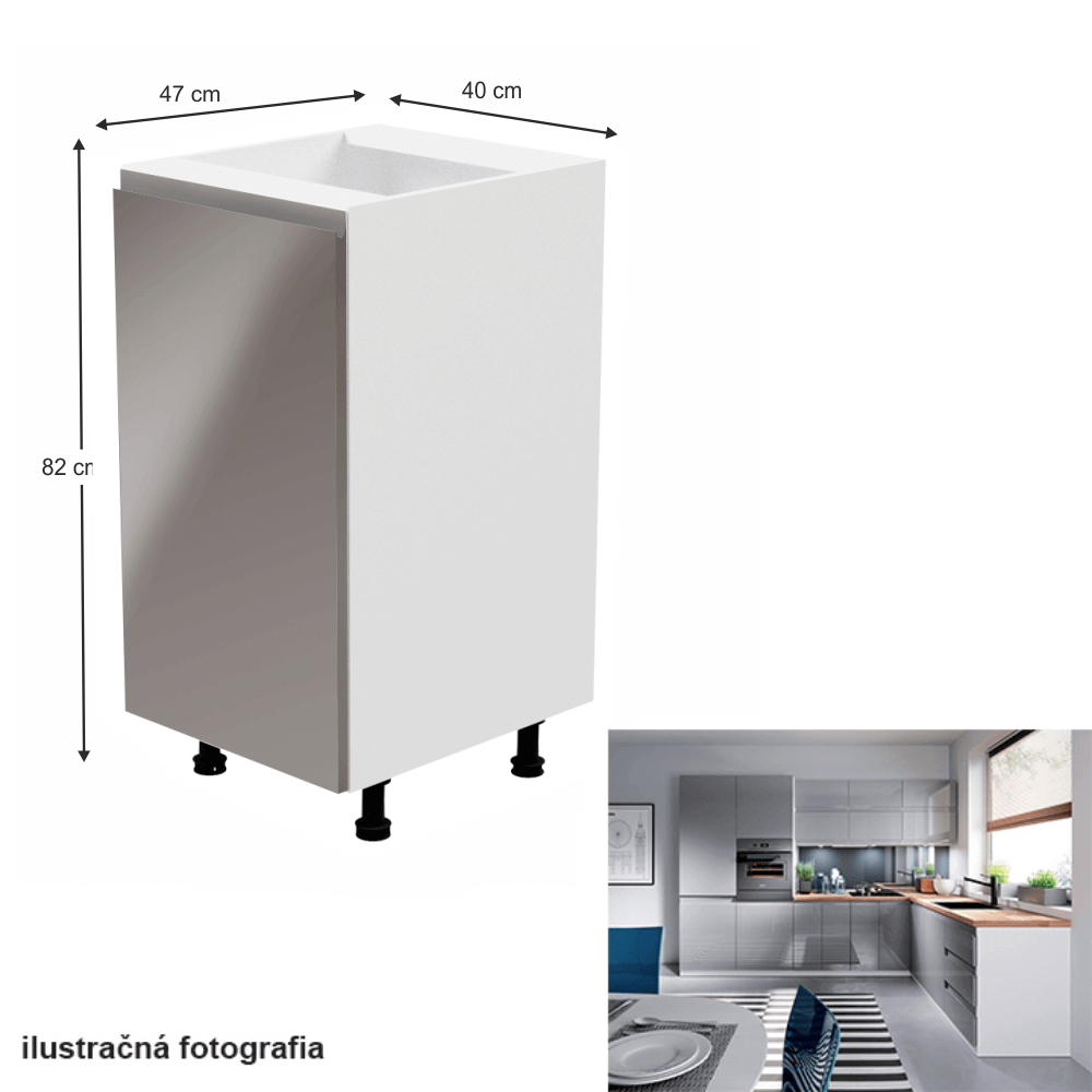 Spodná skrinka, Aurora D40Prevedenie: DTD laminová/MDFFarba: biela/sivá extra vysoký leskRozmery (ŠxHxV): 40x47x82 cmHrúbka materiálu: 15 mmSystém tichého zatvárania dvierokPracovná doska nie je súčasťou skriniek. Je možné si doobjednať pracovnú dosku v prevedení dub artisan s hrúbkou 38 mm za 56 eur/bm. Možnosť dokúpiť drez LAY ON. Spodné skrinky sú dodávané vrátane dolnej lišty, avšak presný rozmer, ktorý potrebujete, je potrebné uviesť do poznámky v objednávke. Ak rozmer neuvediete, môže sa stať, že vám sokel nebude dodaný. Ku každej dolnej skrinke, okrem D25PZ, je potrebné doobjednať 2 ks úchytok na sokel - cena 1Eur/2ks.