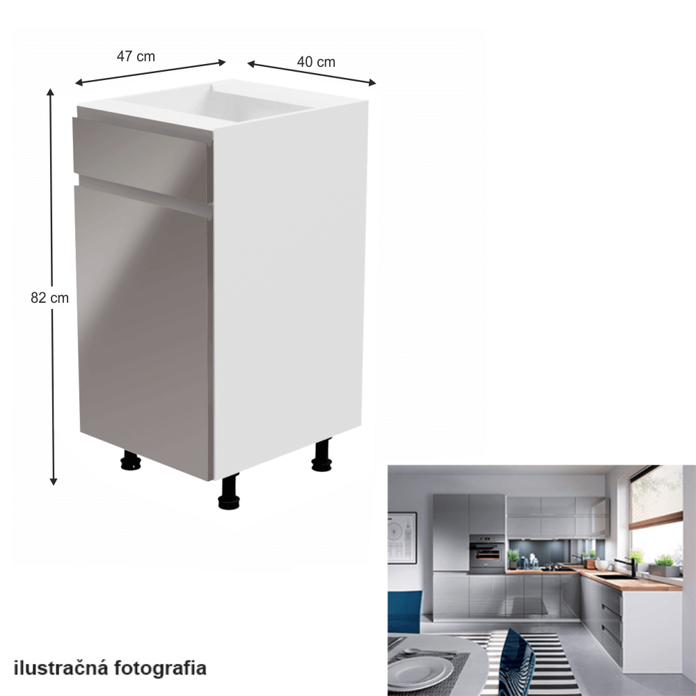 Spodná skrinka, Aurora D40S1Prevedenie: DTD laminová/MDFFarba: biela/sivá extra vysoký leskRozmery (ŠxHxV): 40x47x82 cmHrúbka materiálu: 15 mmSystém tichého zatvárania dvierokJe nutné objednať potrebný počet ukončení spodnej lištyPracovná doska nie je súčasťou skriniek. Je možné si doobjednať pracovnú dosku v prevedení dub artisan s hrúbkou 38 mm za 56 eur/bm. Možnosť dokúpiť drez LAY ON. Spodné skrinky sú dodávané vrátane dolnej lišty, avšak presný rozmer, ktorý potrebujete, je potrebné uviesť do poznámky v objednávke. Ak rozmer neuvediete, môže sa stať, že vám sokel nebude dodaný. Ku každej dolnej skrinke, okrem D25PZ, je potrebné doobjednať 2 ks úchytok na sokel - cena 1Eur/2ks.