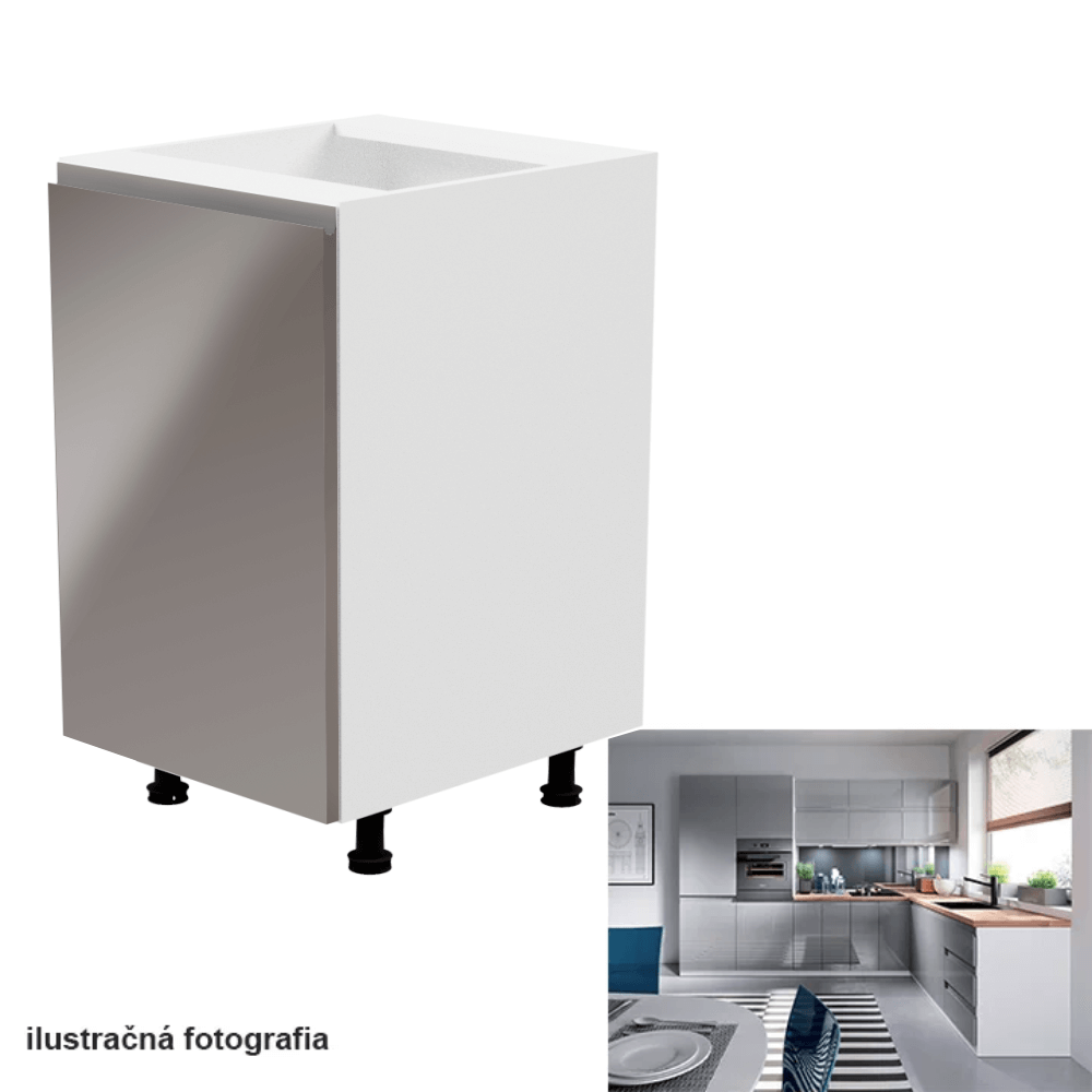 Spodná skrinka, Aurora D601FPrevedenie: DTD laminová/MDFFarba: biela/sivá extra vysoký leskRozmery (ŠxHxV): 60x47x82 cmHrúbka materiálu: 15 mmSystém tichého zatvárania dvierokJe nutné objednať potrebný počet ukončení spodnej lištyPracovná doska nie je súčasťou skriniek. Je možné si doobjednať pracovnú dosku v prevedení dub artisan s hrúbkou 38 mm za 56 eur/bm. Možnosť dokúpiť drez LAY ON. Spodné skrinky sú dodávané vrátane dolnej lišty, avšak presný rozmer, ktorý potrebujete, je potrebné uviesť do poznámky v objednávke. Ak rozmer neuvediete, môže sa stať, že vám sokel nebude dodaný. Ku každej dolnej skrinke, okrem D25PZ, je potrebné doobjednať 2 ks úchytok na sokel - cena 1Eur/2ks.