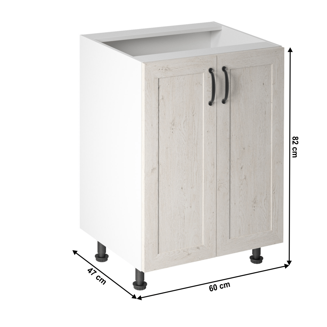 Spodná skrinka, ROYAL D60Materiál: korpus je vyrobený z kvalitnej laminovanej drevotrieskyFarba: biela/sosna nordickáRozmery ŠxHxV: 60x47/60x82 cm Hrúbka materiálu: 15 mmSystém tichého zatvárania dvierokDodávané v demonte.Spodné skrinky ku kuchyni ROYAL sú dodávané bez pracovnej dosky a bez sokla. Pracovnú dosku Dub Porterhouse tmavý možné doobjednať v hrúbke 3,8 cm v cene 59 Eur/1 bm. Ku každej dolnej skrinke, okrem rohových skriniek D25PZ, je potrebné doobjednať aj sokel v prevedení dub divoký v cene 10 ur/1 bm a 2 kusy úchytov na sokel v cene 1 Eur/2 ks. Objednávku vpíšte do poznámky v objednávkovom formulári.